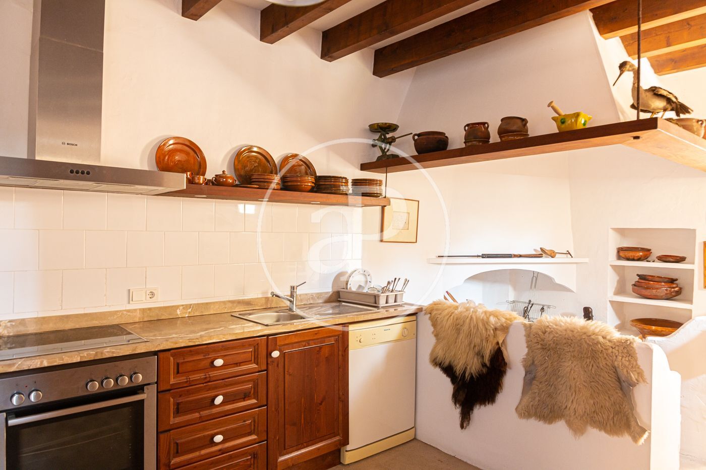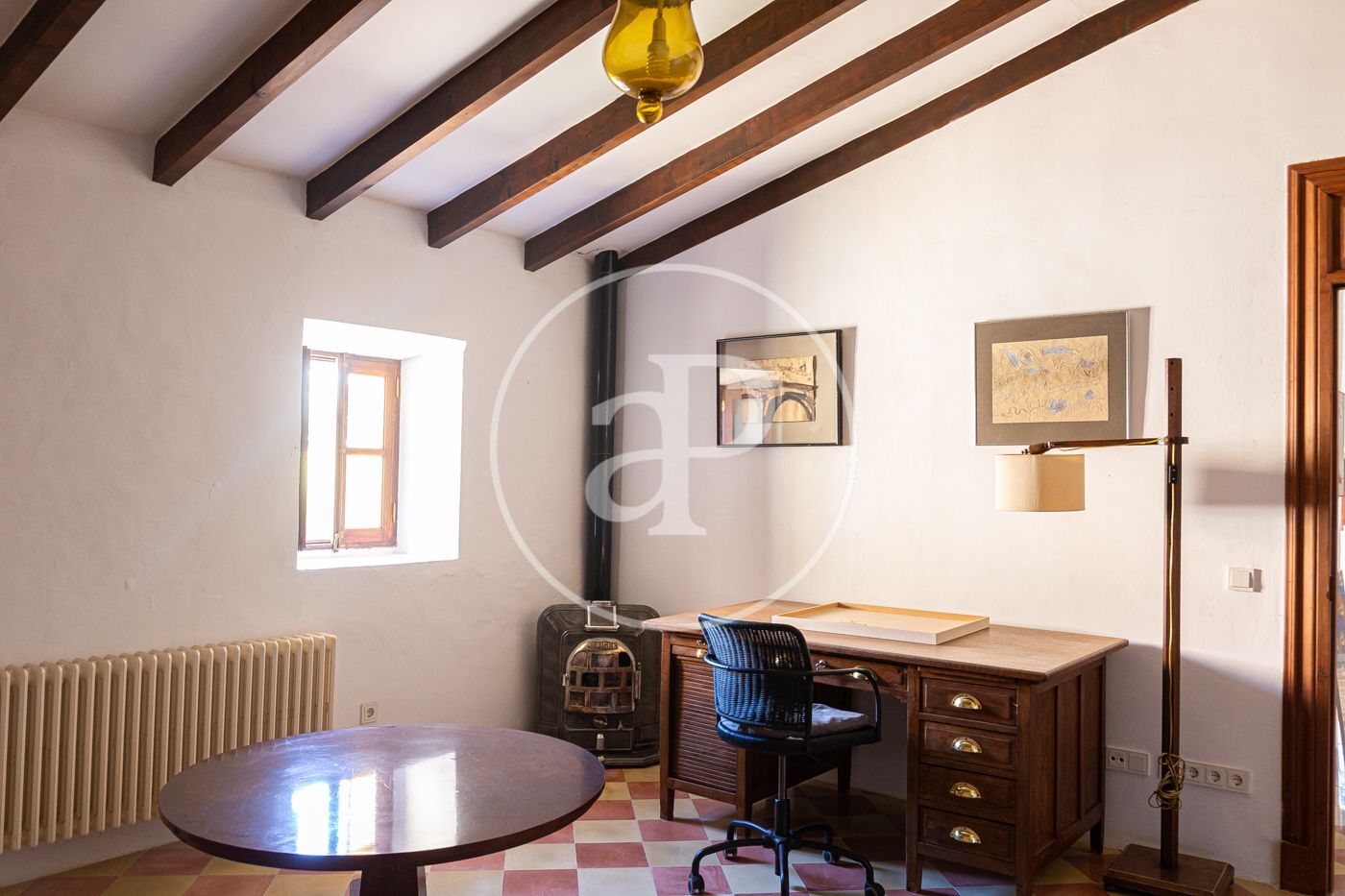 En los espacios exteriores destacan la piscina tipo safareg, el solárium, tres plazas de aparcamiento más un garaje cubierto y un amplio jardín con árboles frutales. La casa está equipada con calefacción central que funciona mediante un depósito de gasóleo de 2000 litros. techos altos, varias dependencias, cocina equipada, terrazas.