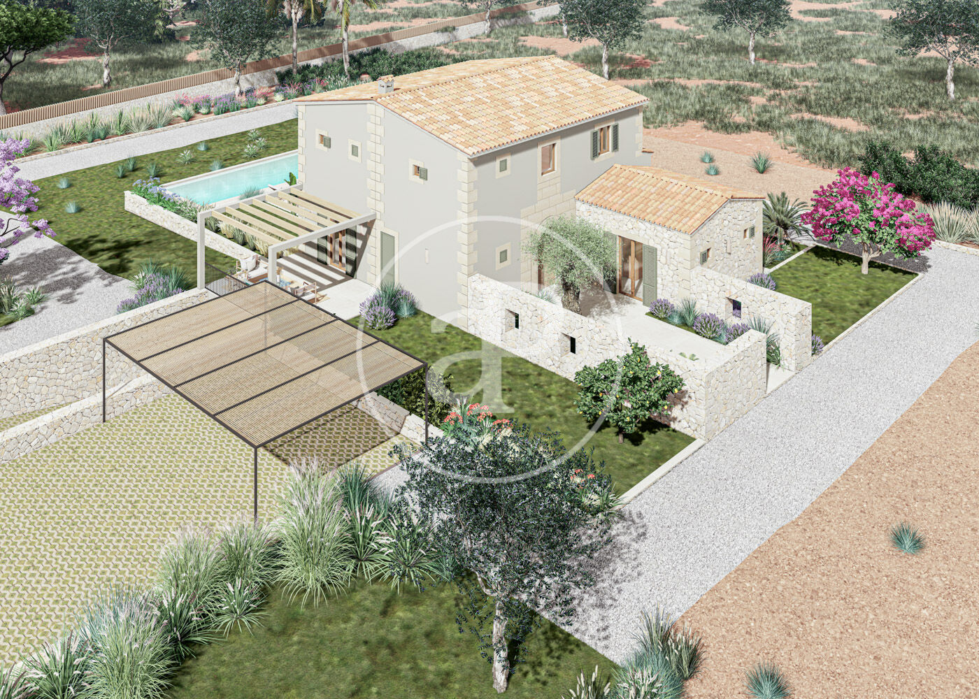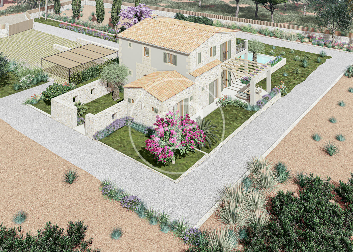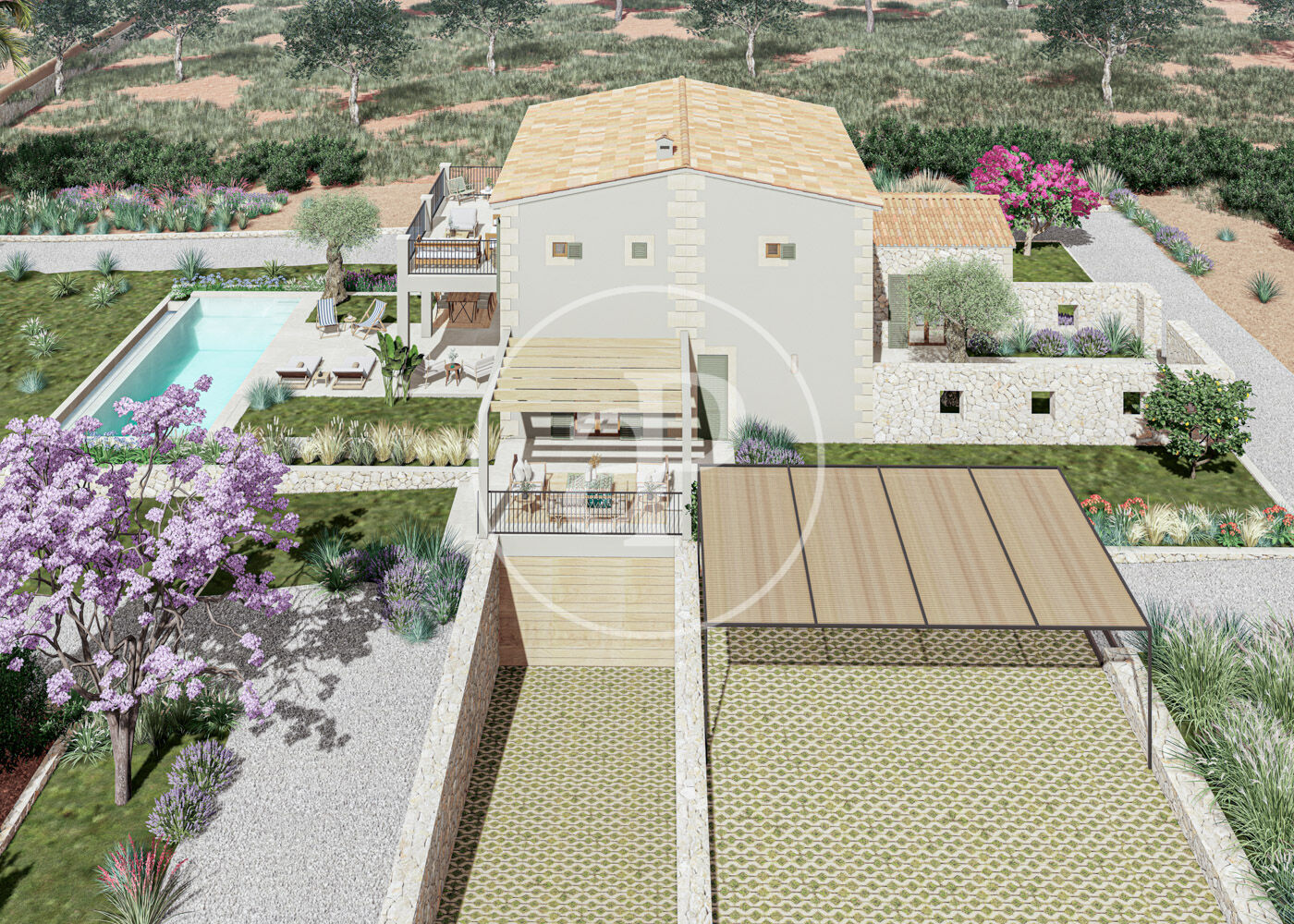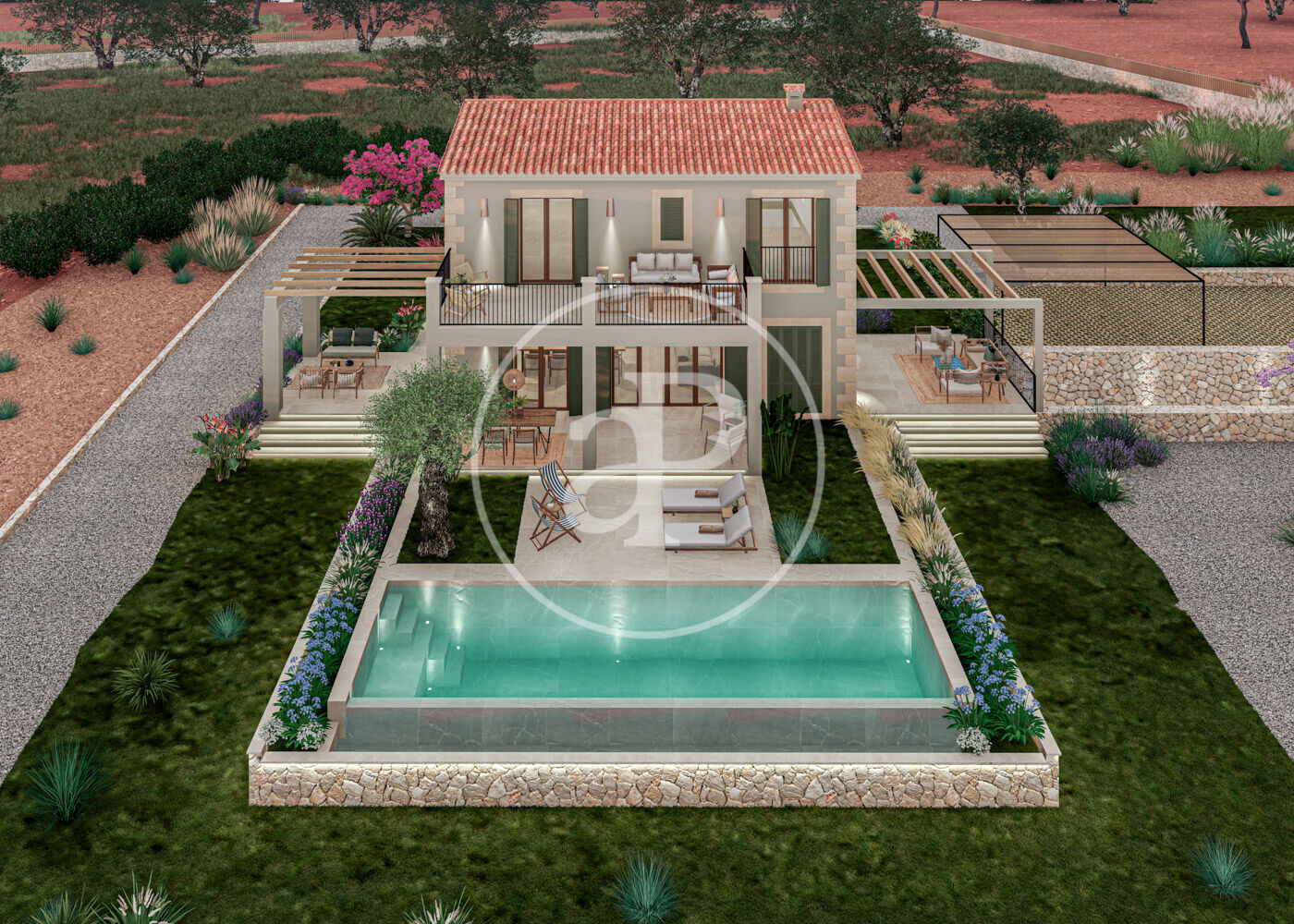 El proyecto de la finca de nueva construcción en Ruberts ,con su ubicación privilegiada en el centro de Mallorca, ofrece privacidad y una vista panorámica del hermoso paisaje circundante y las montañas. El solar de 14.622 m² con proyecto para construir una casa de 370m² divididos en tres plantas, piscina y varias terrazas proporciona mucho espacio habitable y áreas para relajarse al aire libre.