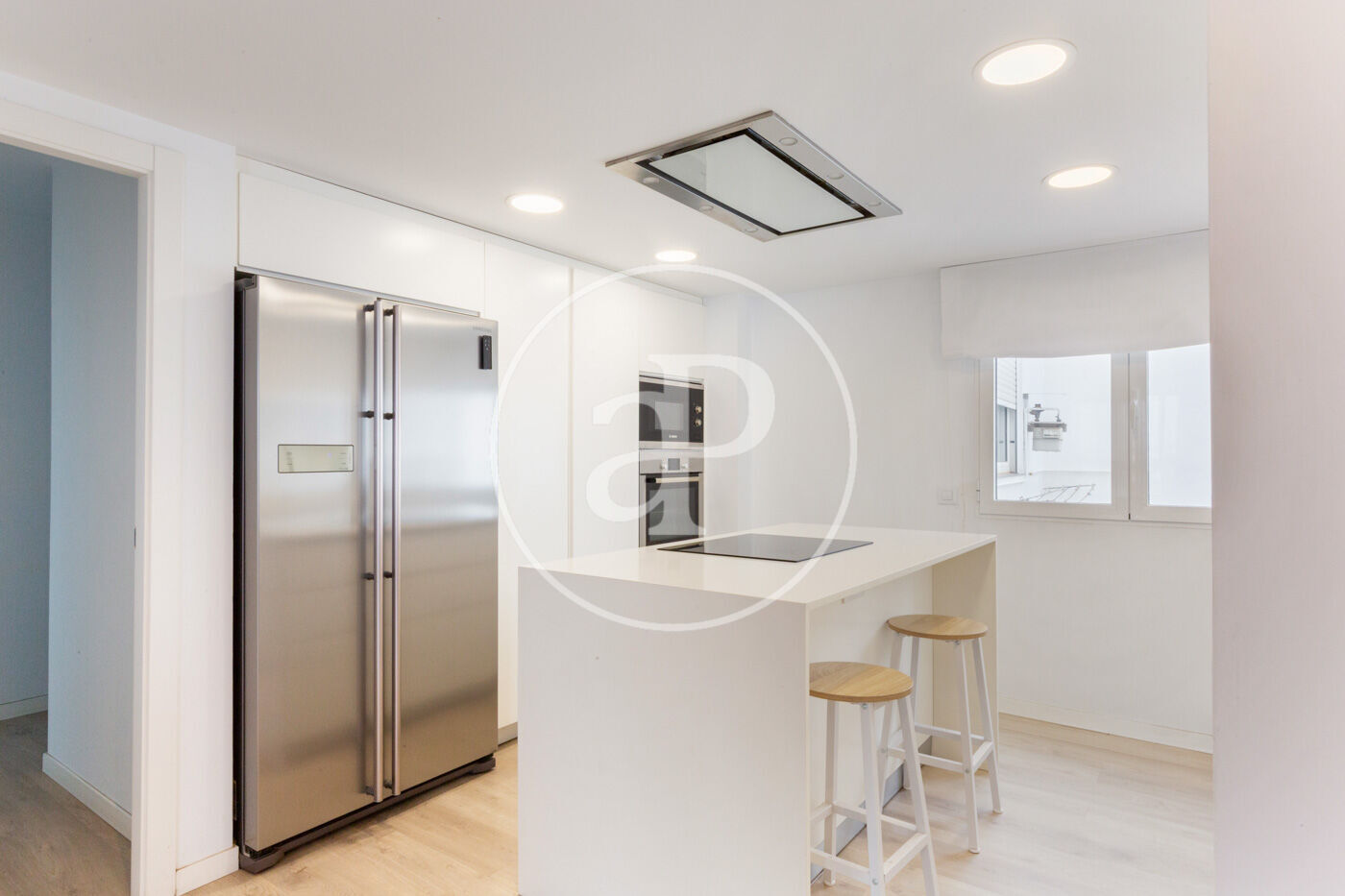 La cuina, equipada amb forn, vitroceràmica, microones, una gran nevera i rentadora, s’integra en un espai ampli junt amb el saló acollidor, que convida a gaudir del seu sofà, totalment en harmonia amb la paleta de colors predominant en l’habitatge.