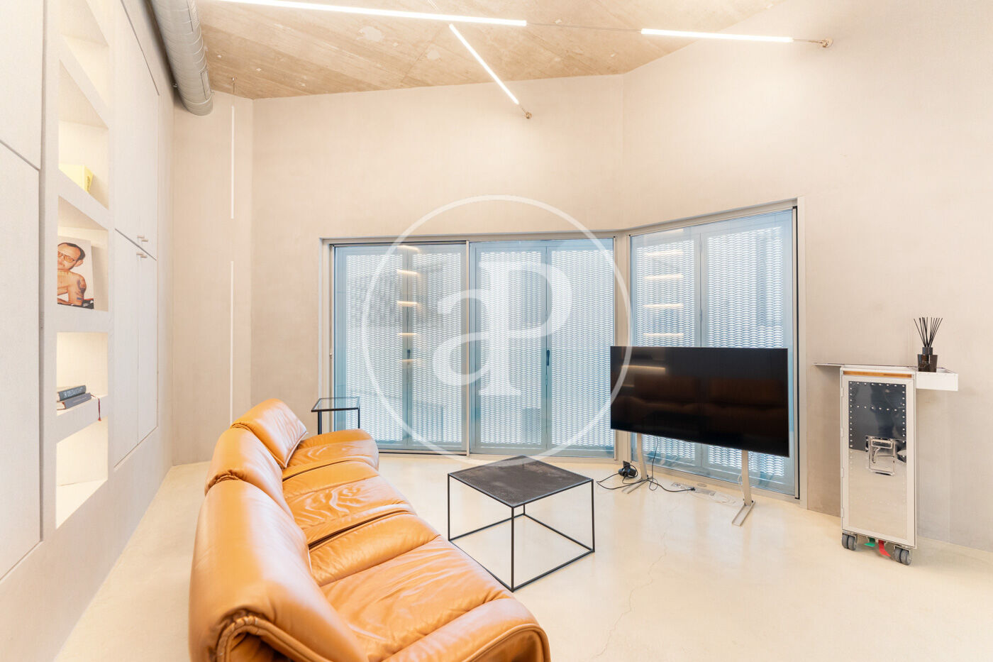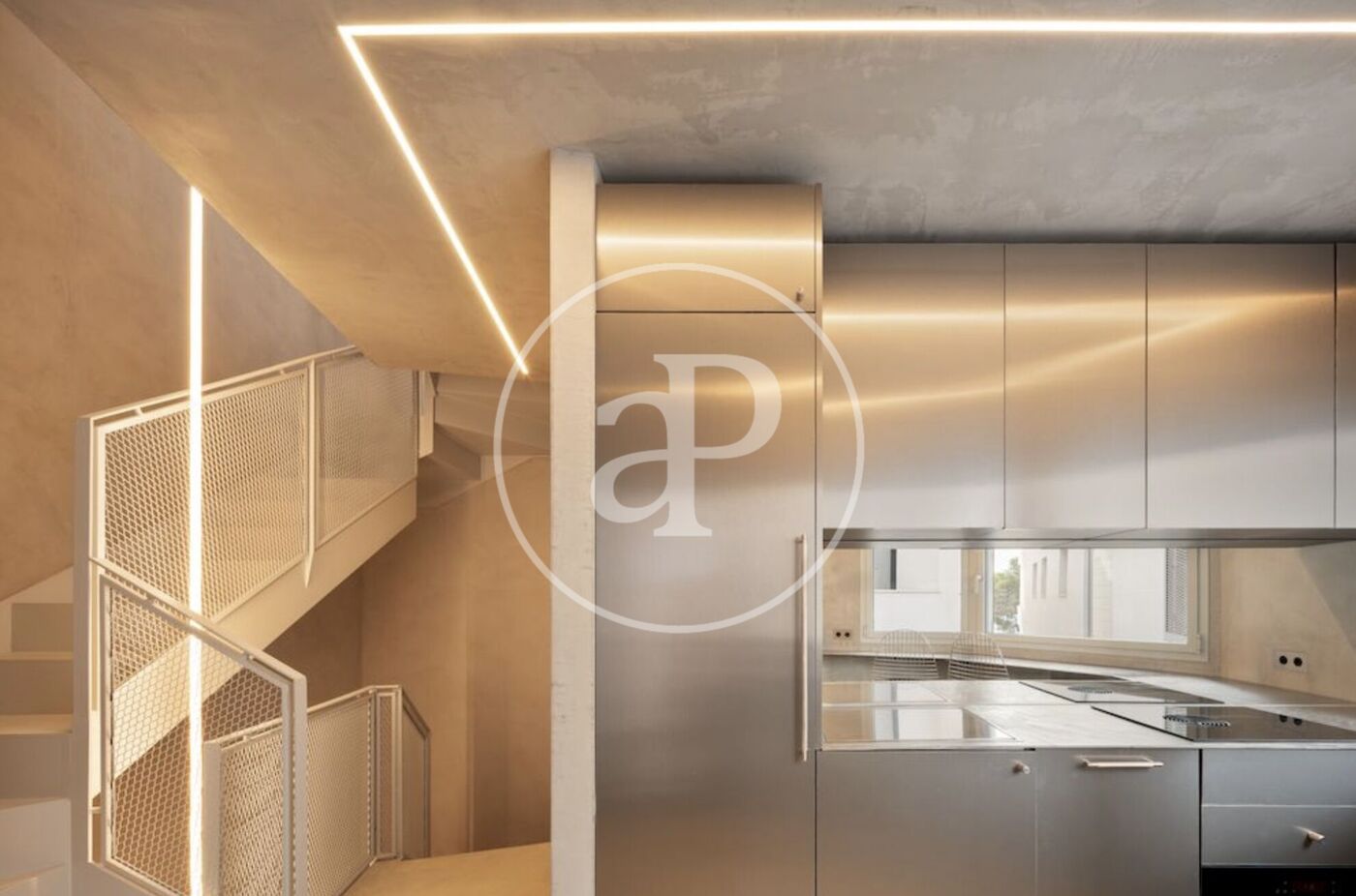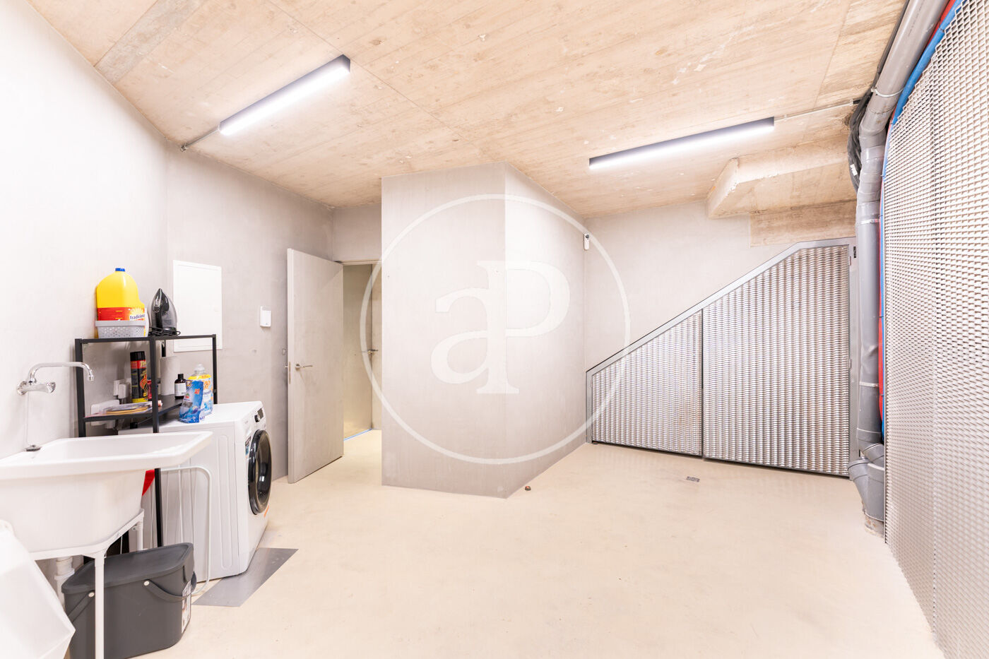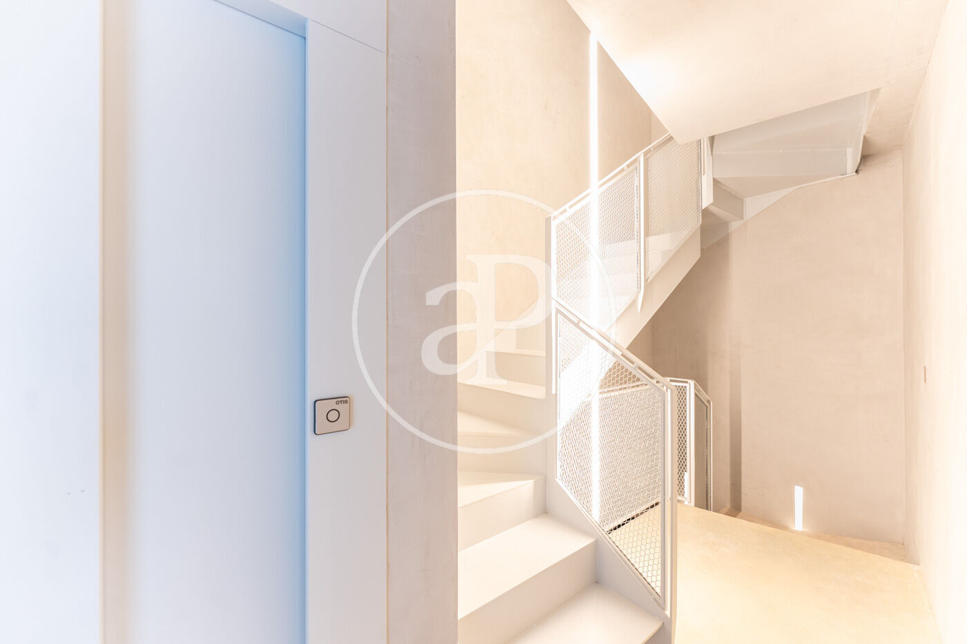 Compta amb garatge privat de disseny industrial, amb terres de formigó polit, parets d’acer inoxidable i accés directe mitjançant escala metàl·lica lacada o ascensor interior.