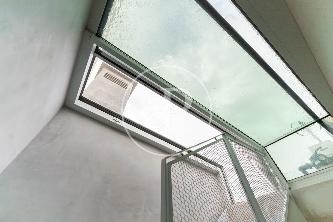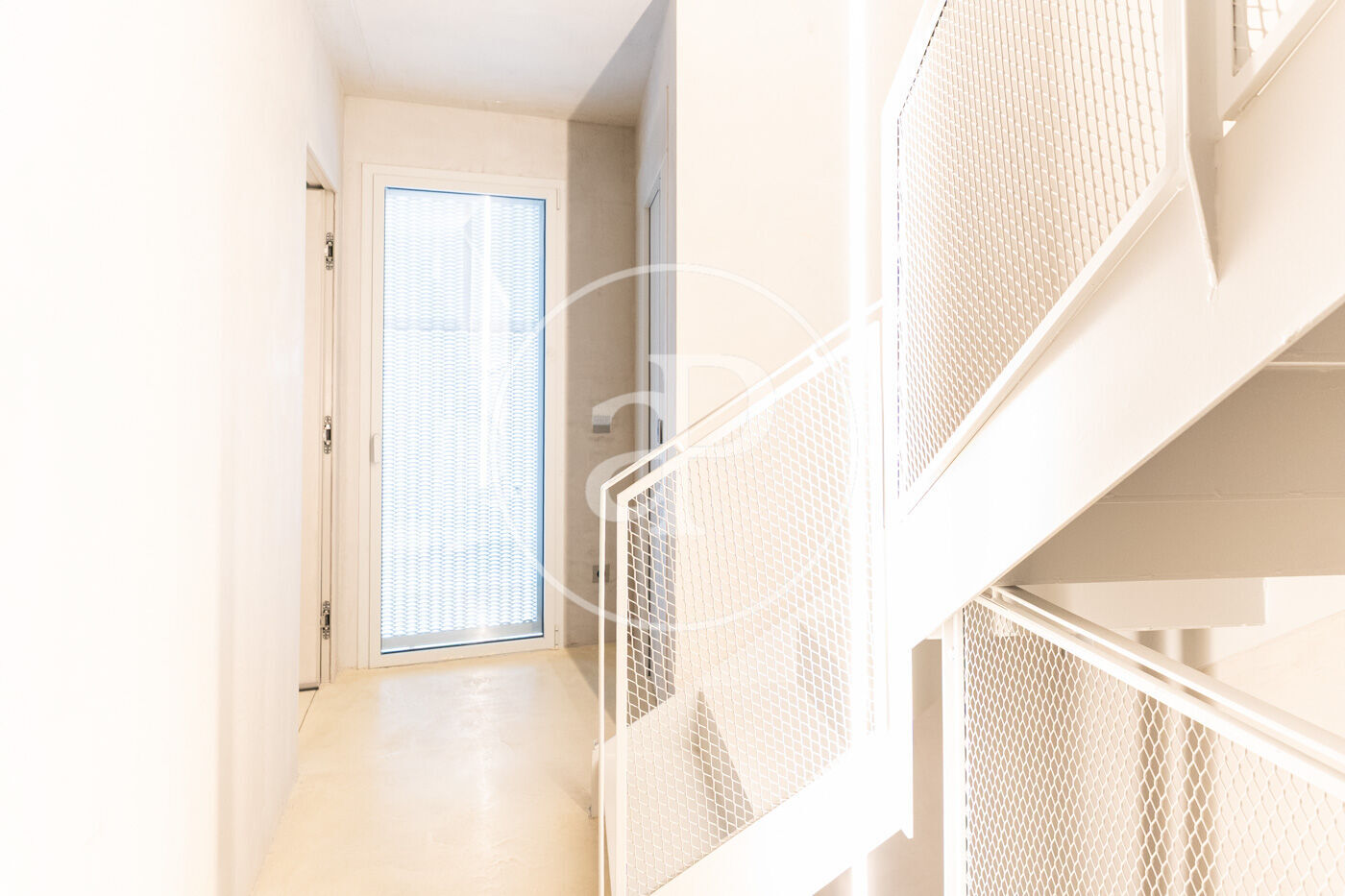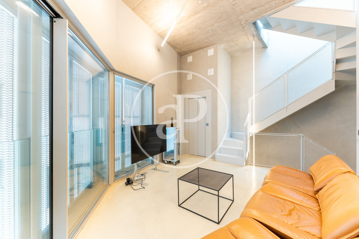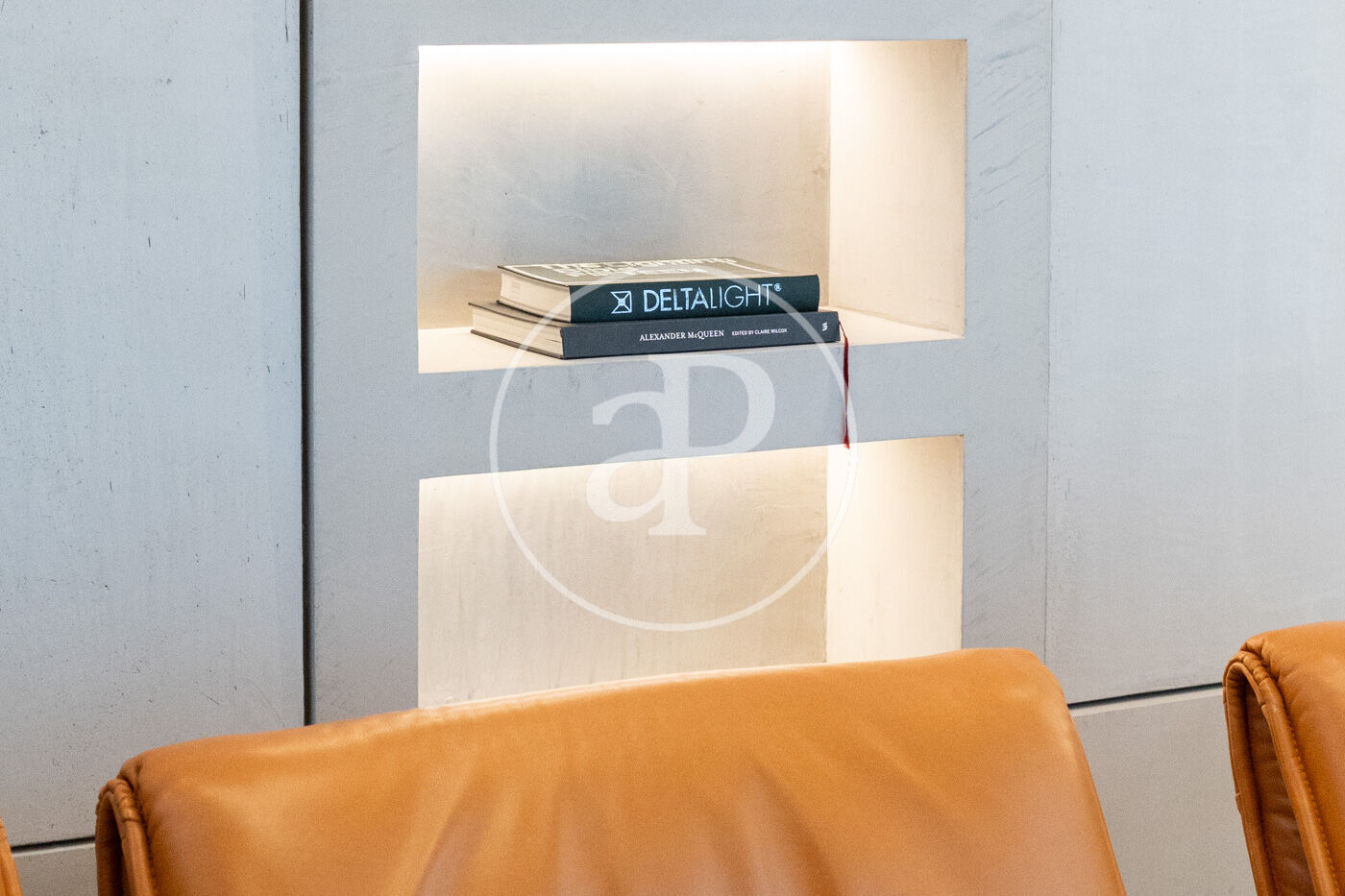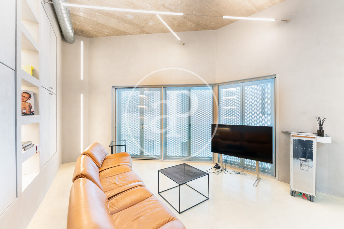 Compta amb garatge privat de disseny industrial, amb terres de formigó polit, parets d’acer inoxidable i accés directe mitjançant escala metàl·lica lacada o ascensor interior.