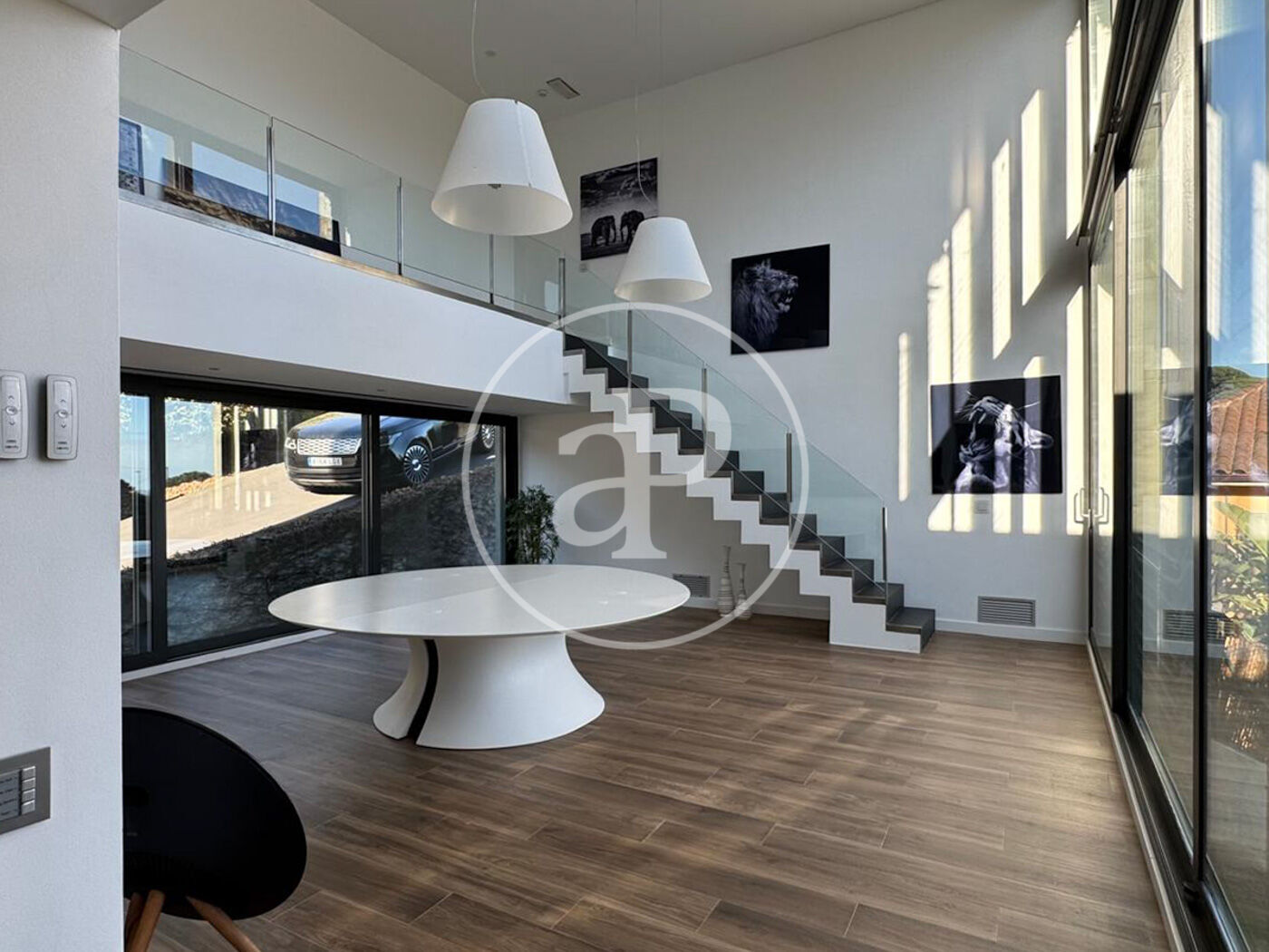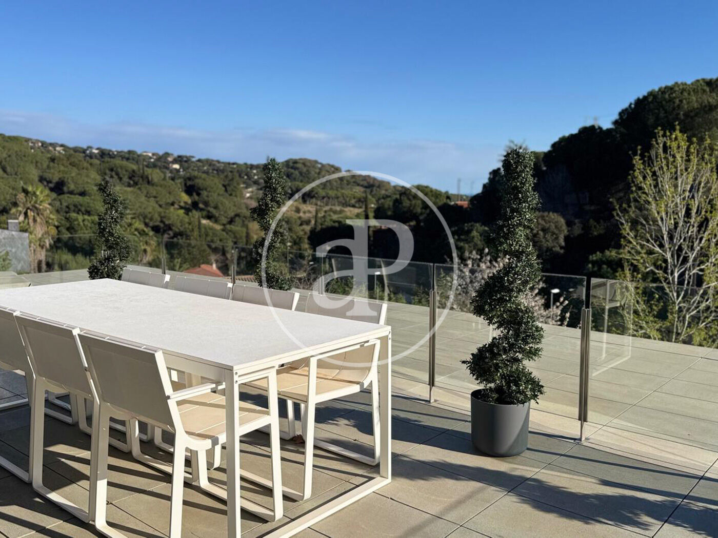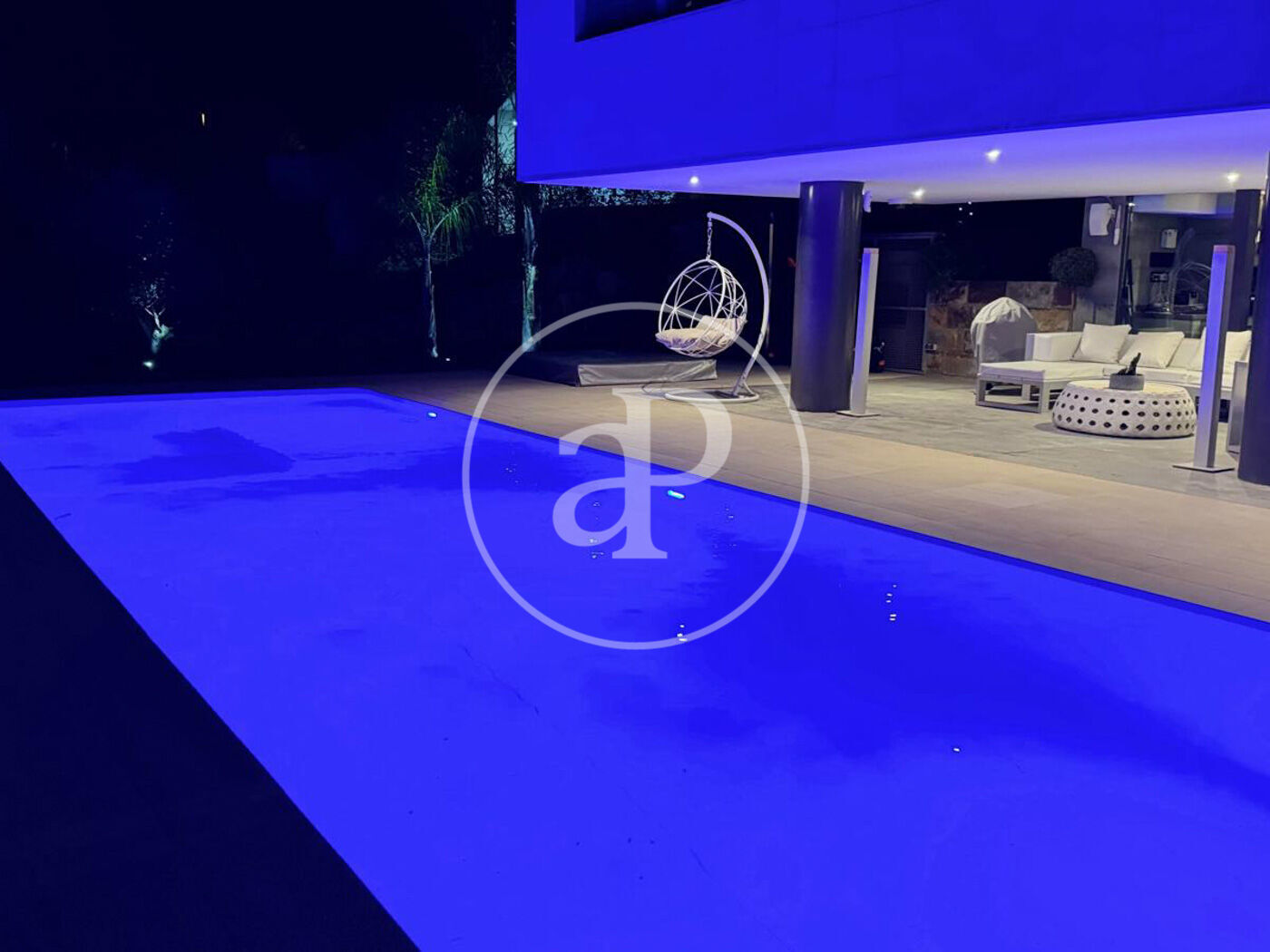 La casa disposa de quatre àmplies habitacions i sis banys, tots ells dissenyats amb materials de primer nivell i acabats de la firma Porcelanosa, garantint un ambient sofisticat i atemporal. Els terres de fusta d’alta qualitat reforcen la calidesa dels espais interiors, mentre que la integració de sistemes avançats de domòtica permet un control intel·ligent i eficient de l’habitatge.