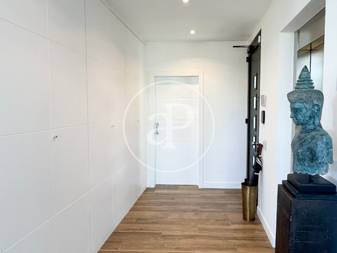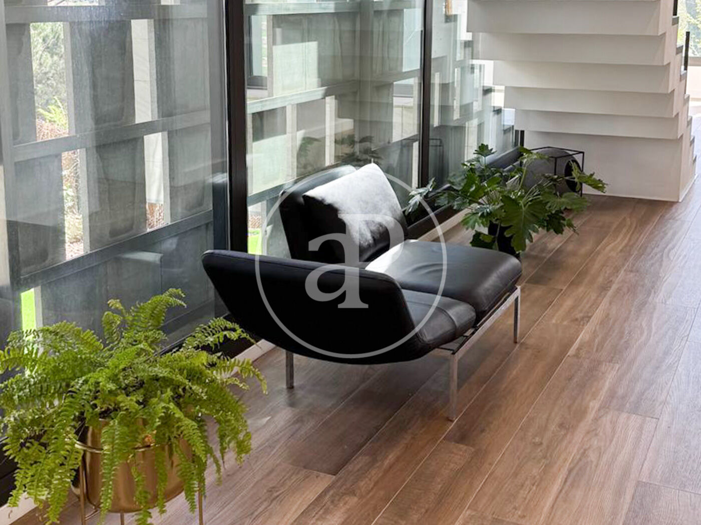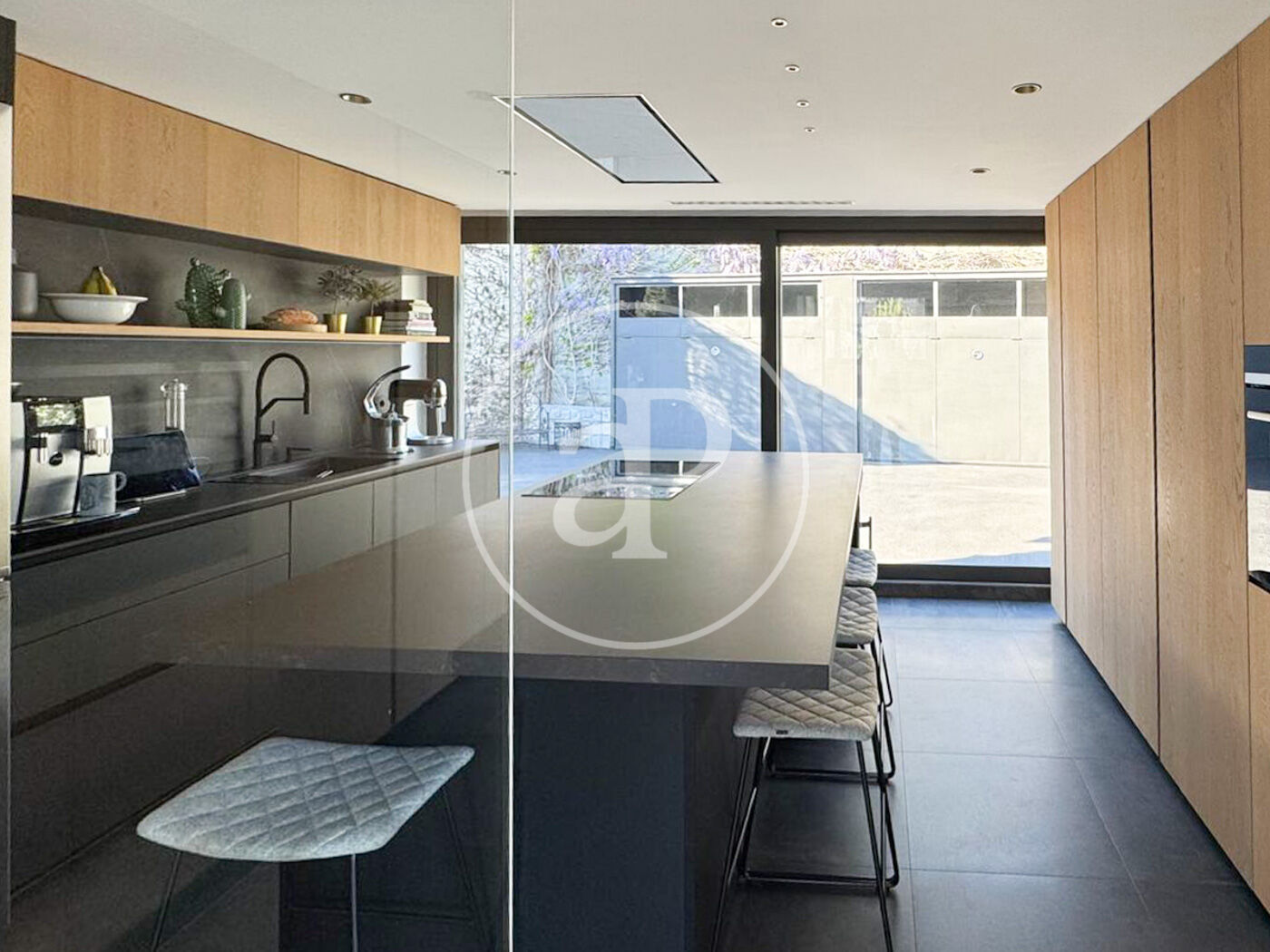La casa disposa de quatre àmplies habitacions i sis banys, tots ells dissenyats amb materials de primer nivell i acabats de la firma Porcelanosa, garantint un ambient sofisticat i atemporal. Els terres de fusta d’alta qualitat reforcen la calidesa dels espais interiors, mentre que la integració de sistemes avançats de domòtica permet un control intel·ligent i eficient de l’habitatge.