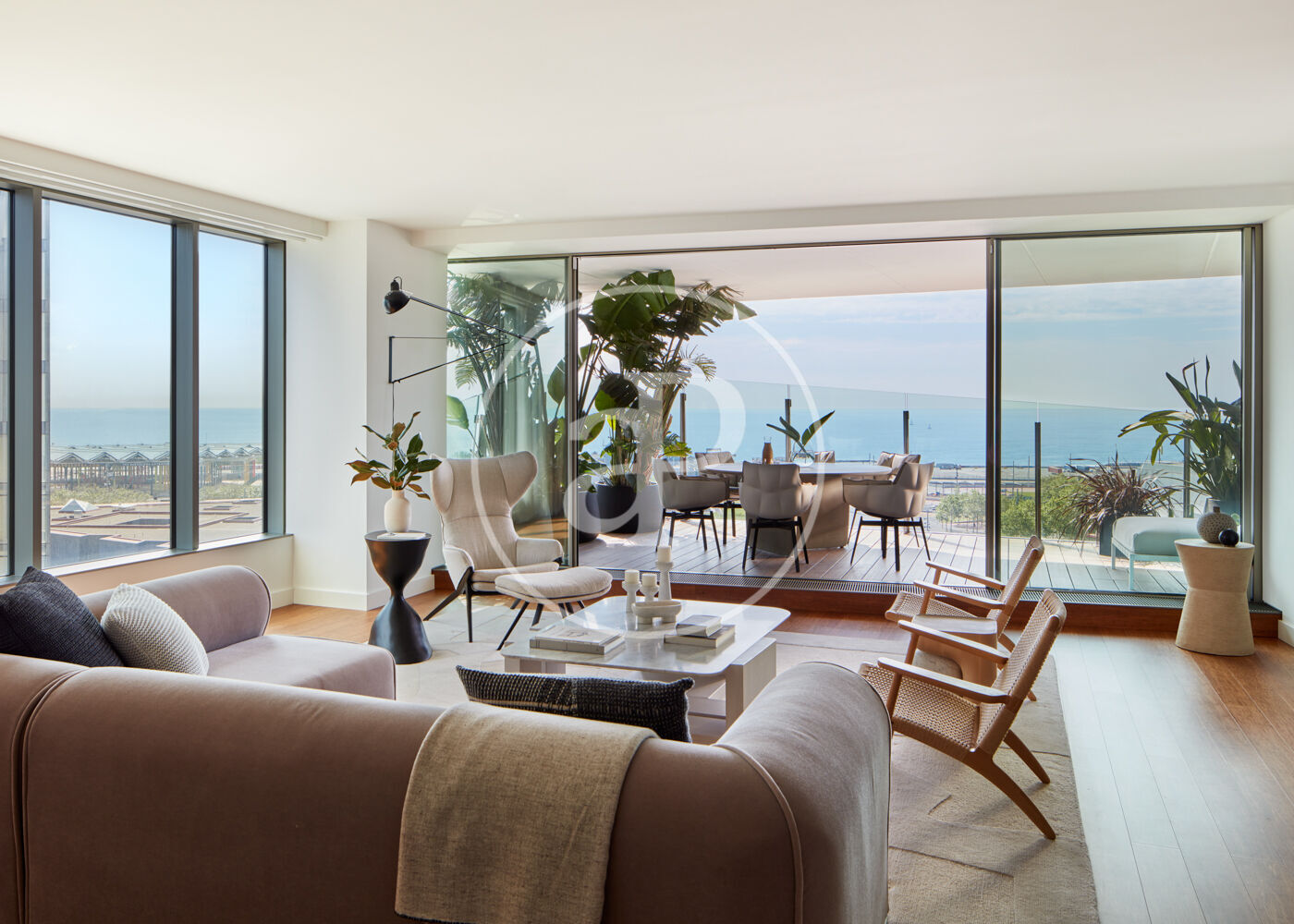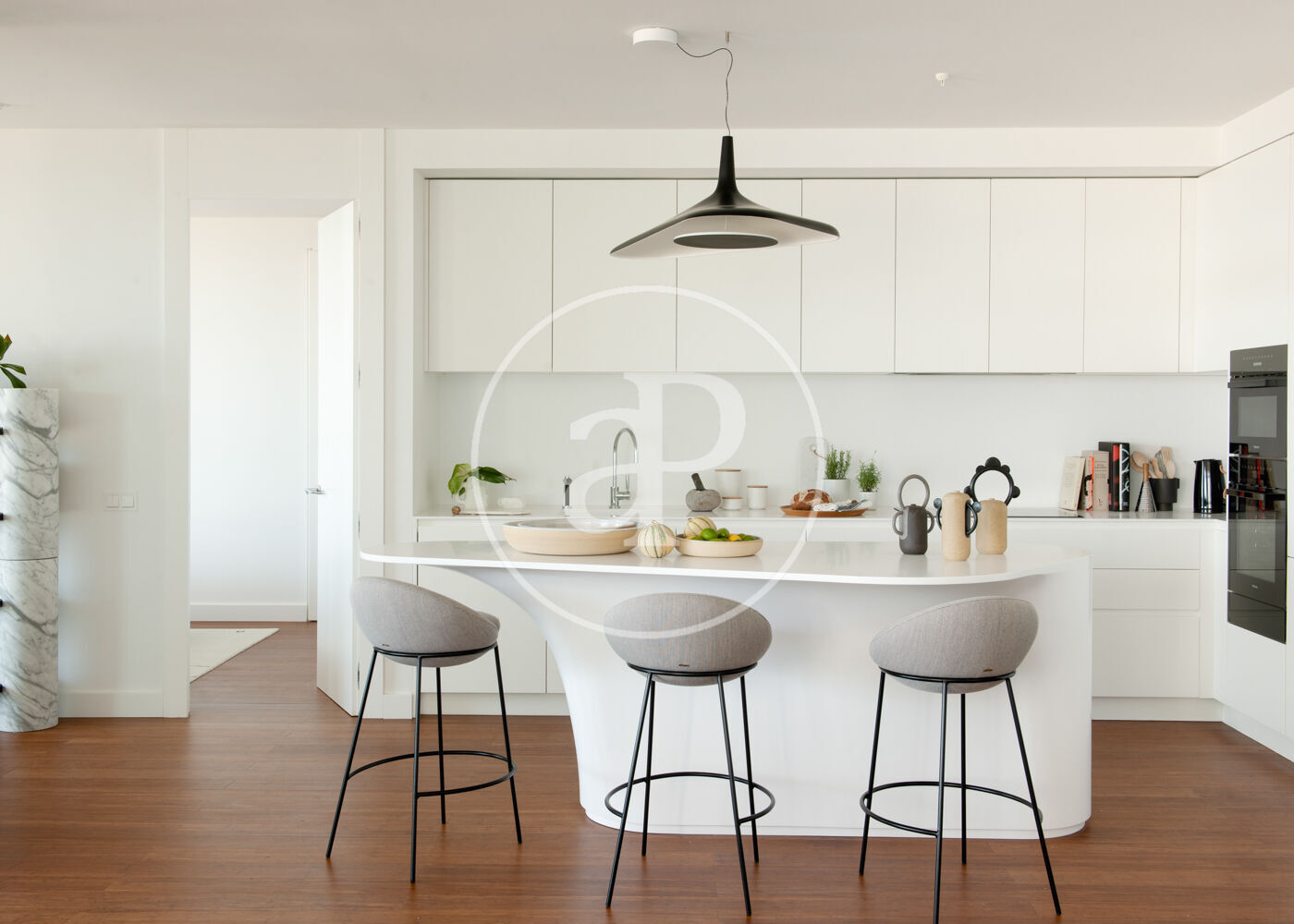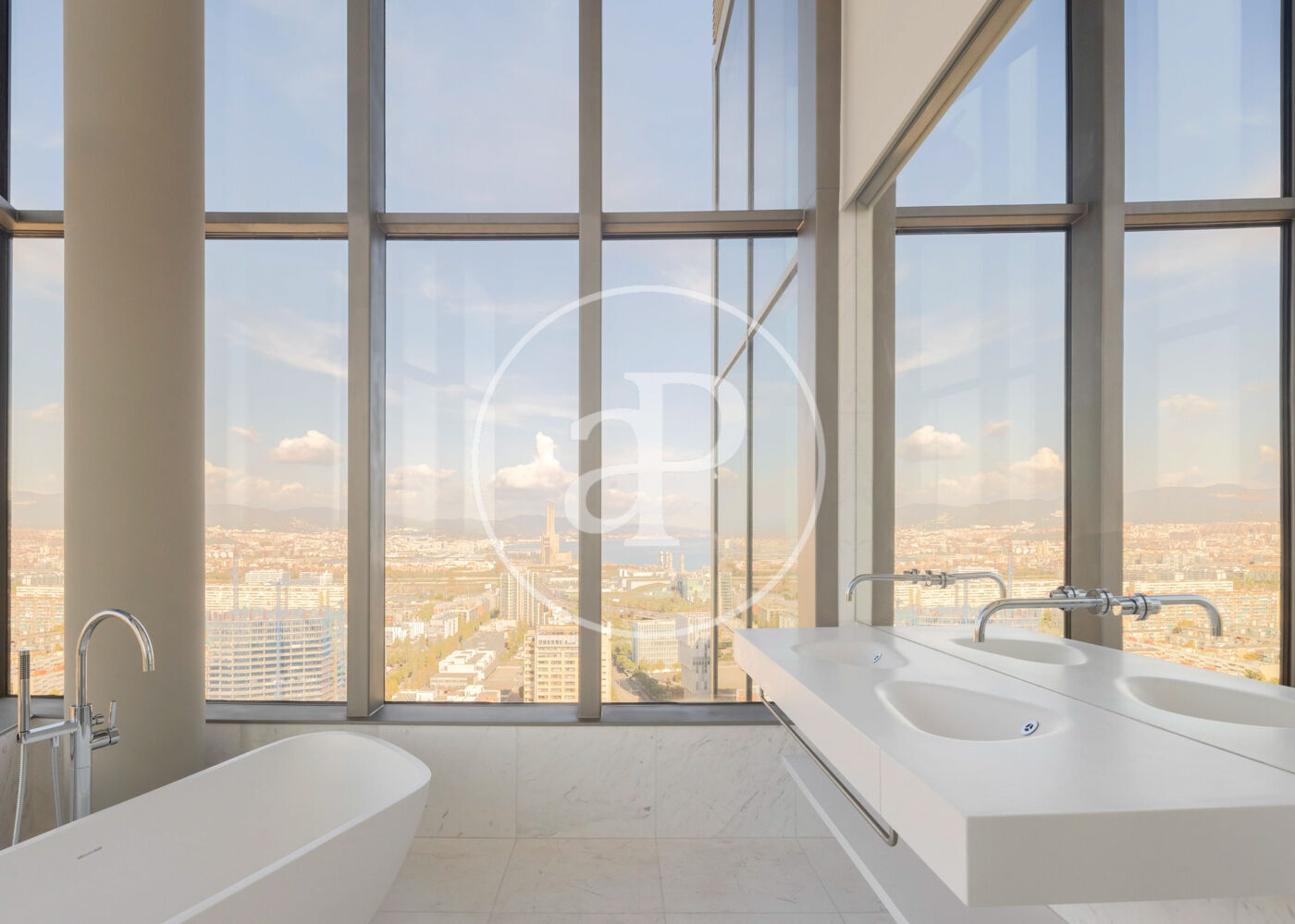 Elegant pis de luxe situat a l’icònic Edifici Antares, ubicat en una de les zones més exclusives de Barcelona. L'immoble compta amb un disseny modern i sofisticat, amb grans finestrals que permeten l’entrada d’abundant llum natural i ofereixen impressionants vistes panoràmiques de la ciutat i del mar Mediterrani. La distribució és àmplia i funcional, amb espais oberts que inclouen una sala-menjador connectada a una cuina moderna equipada amb electrodomèstics d’alta gamma.