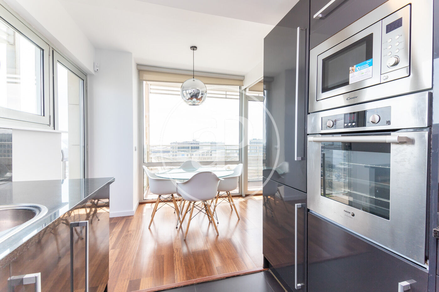 L’apartament està situat a la planta alta d’un edifici exclusiu i modern, tot exterior i molt lluminós, amb vistes des de qualsevol espai del pis i sòl de parquet. La cuina està equipada amb tots els electrodomèstics.