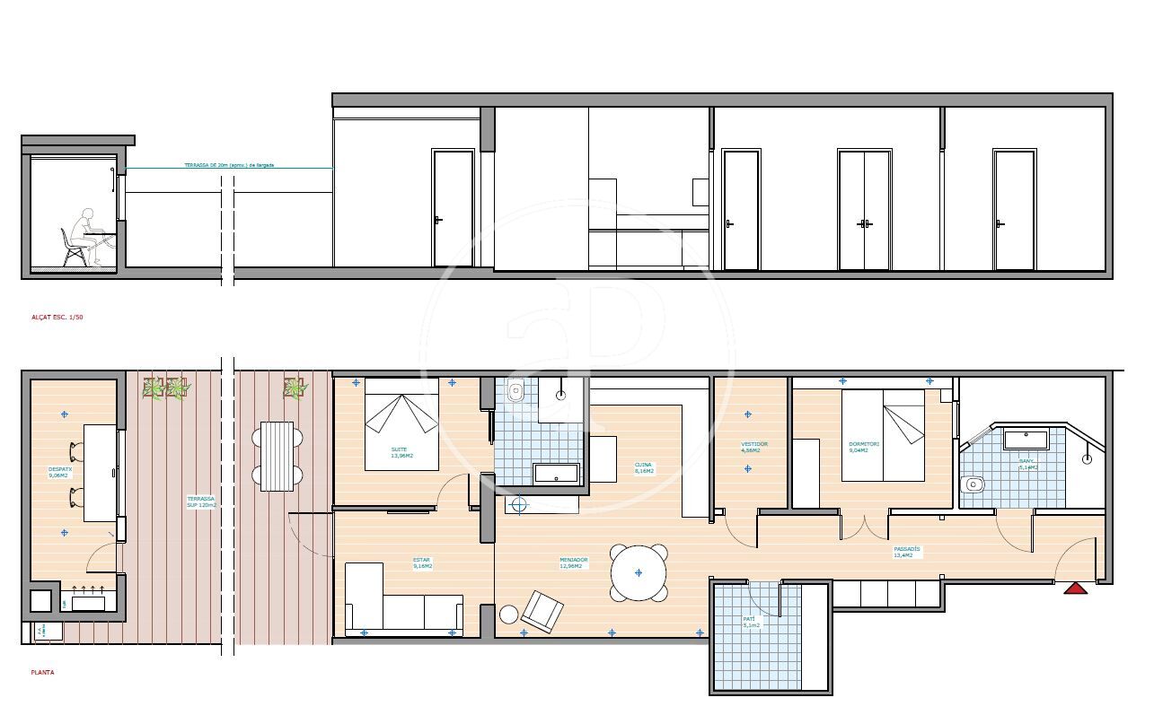 La propietat disposa de 85 m² interiors distribuïts en dos dormitoris dobles: el principal en suite amb bany totalment reformat, acabats de luxe i vestidor; el segon, també doble, disposa d’un bany complet amb plat de dutxa.