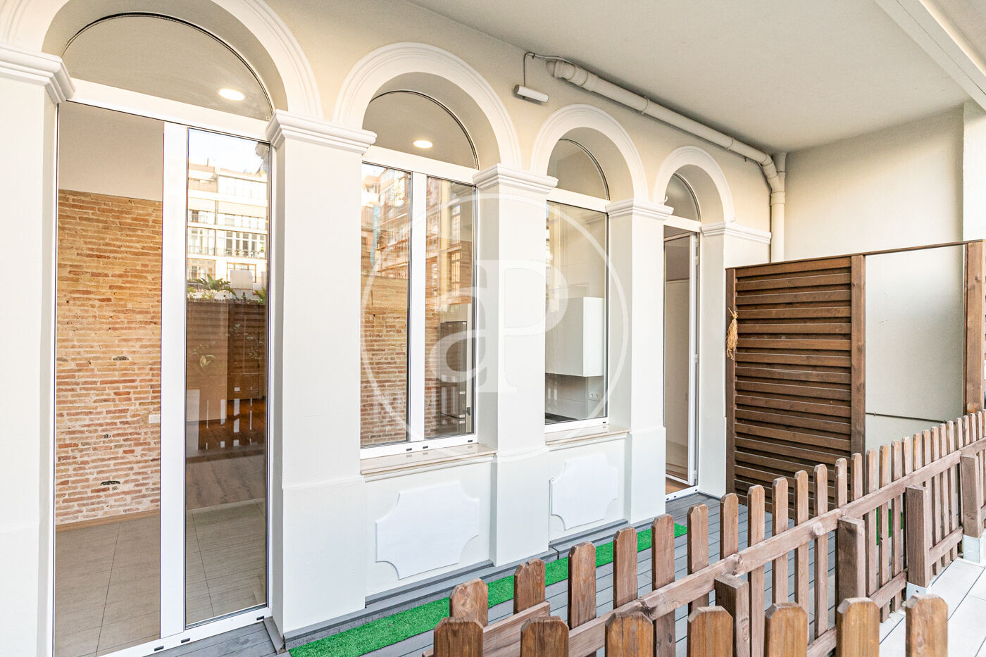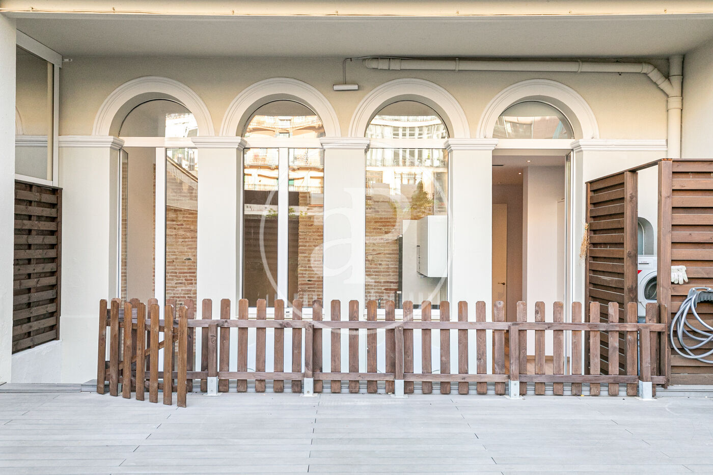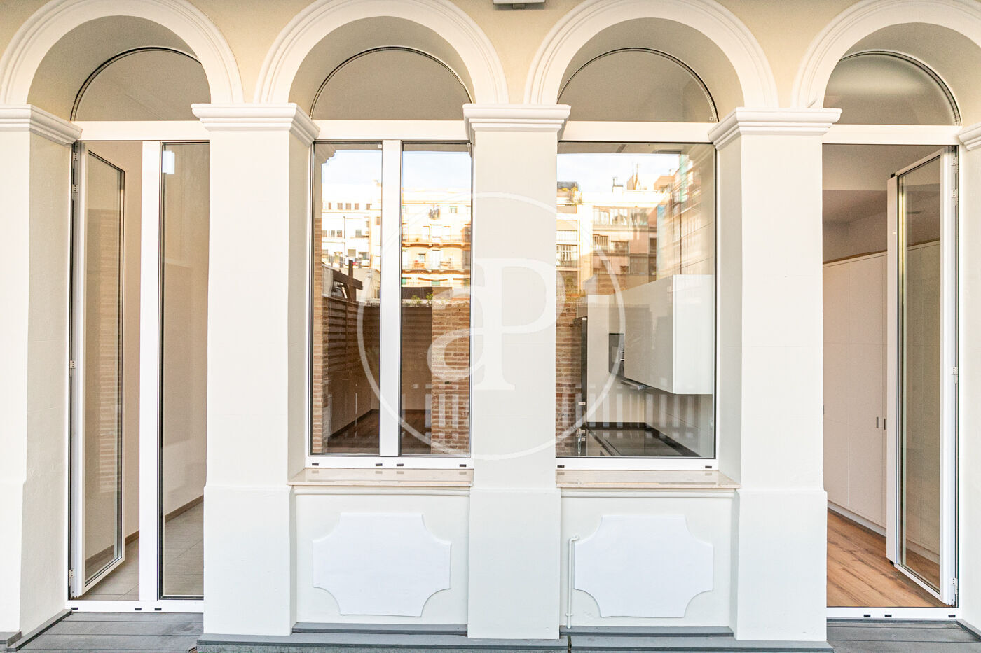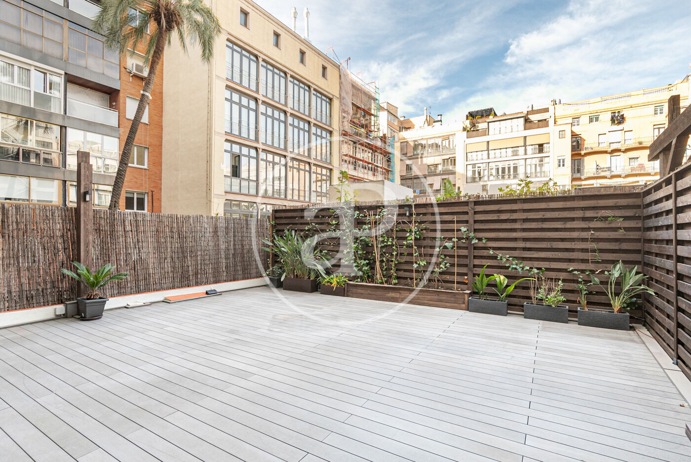 Situat en Plaza Urquinaona, al costat del Tall anglès i pròxim al Passeig de Gràcia es troba aquesta propietat de 100m2 i 50m2 de terrassa, completament reformada amb materials de gran qualitat, combinat amb excel·lent gust i disseny.