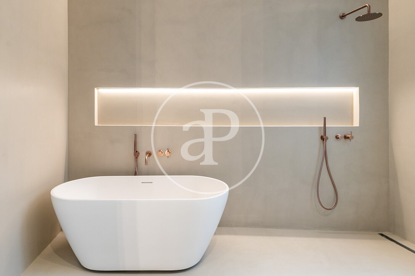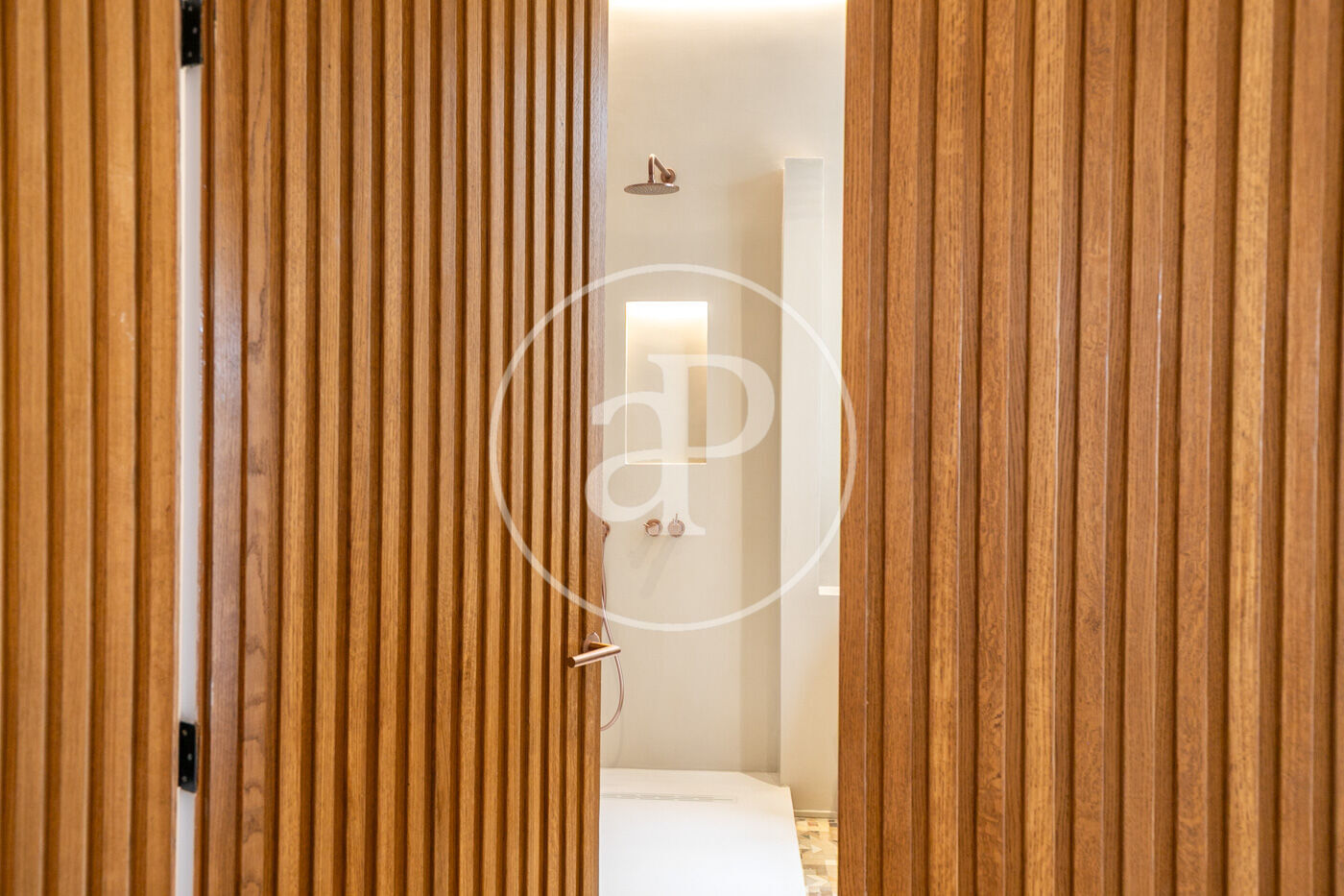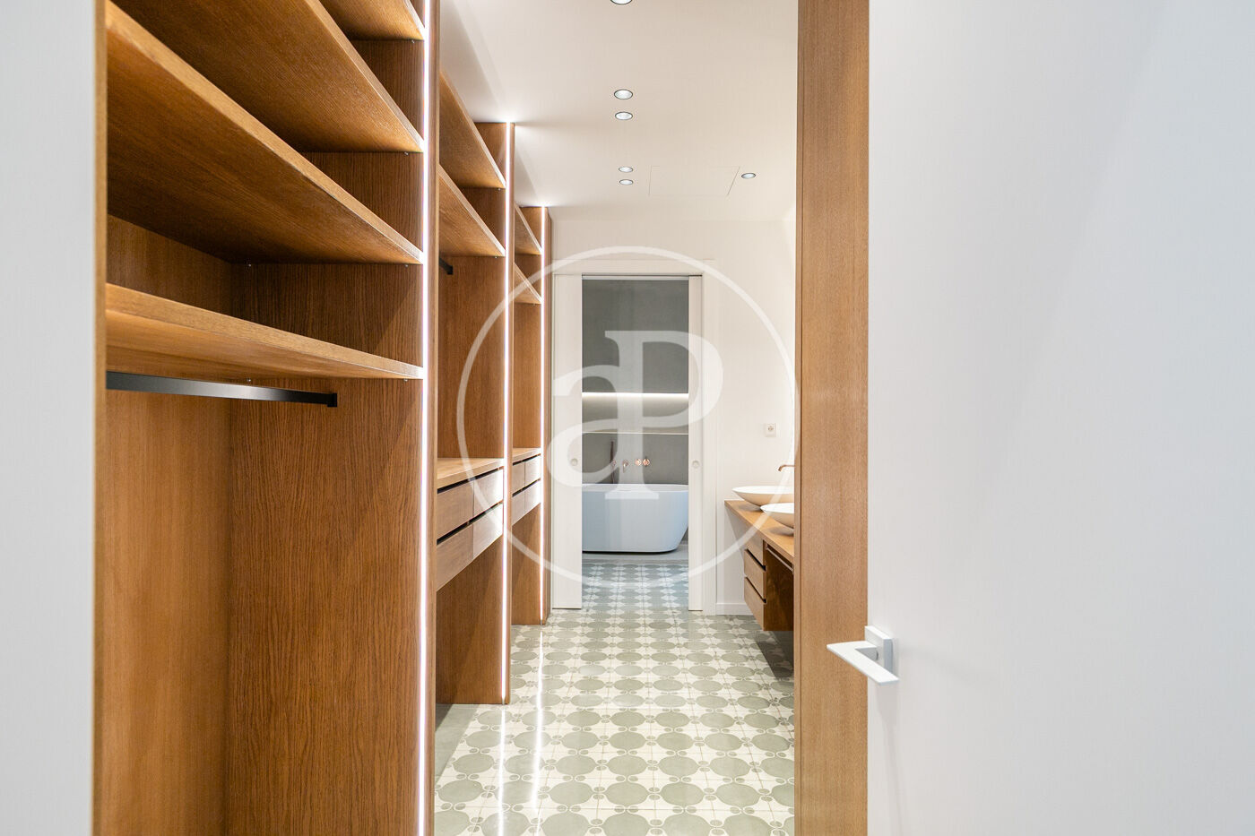 Presentem aquest exclusiu àtic, a estrenar, situat en una finca règia a l’Eixample Dret, entre Pau Claris i el Passeig de Gràcia, a 2 carrers de la Plaça Catalunya. Aquest pis de luxe és únic i està ubicat al cinquè pis real, ocupant tota l’última planta de l’edifici que data de 1900. L’edifici compta amb un ascensor modern i una bonica entrada senyorial. La finca disposa d’una terrassa comunitària a la coberta amb vistes impressionants. La superfície de la propietat és de 161 metres quadrats perfectament distribuïts, amb 7 finestres amb balcons al carrer i 4 finestres que donen accés a la seva terrassa privada al pati interior, molt tranquil, assolellat i envoltat de plantes i palmeres. El pis disposa de 3 dormitoris dobles, tots en suite amb els seus propis banys i armaris encastats, un vestidor independent, un gran saló-menjador amb vistes clares a la ciutat, cuina semioberta de 17 m² i un safareig. La propietat es lliura totalment moblada i decorada, a punt per entrar a viure. Tot el mobiliari està inclòs en el preu. La cuina, de la marca italiana Doimo Cucine, està totalment equipada amb electrodomèstics Siemens, celler de vins i encimera i terres de marbre natural. Aquesta propietat és el resultat d’una reforma integral amb materials excepcionals com parquet de fusta natural, marbres i granits. Tota la fusteria és nova, garantint un alt nivell d’aïllament tèrmic i acústic. Els sostres, de 360 centímetres d’alçada, aporten una sensació d’amplitud i grandesa. La il·luminació indirecta ressalta l’increïble treball dels sostres i motllures de guix artesanal. Tot el mobiliari ha estat dissenyat i fabricat a mida, amb algunes peces recuperades d’antiquaris. L’apartament compta amb sistema de so integrat, terres radiants als banys, aire condicionat de 2 zones, calefacció per radiadors, home cinema, jacuzzi en una de les màster suites i una xemeneia de marbre natural amb cremador de bioetanol. El disseny i execució d’aquesta magnífica propietat és obra del prestigiós estudi d’interiorisme Victoria Interiors. Es tracta d’una oportunitat única per adquirir una propietat excepcional en una ubicació immillorable, amb totes les comoditats, on els residents tindran accés a serveis premium i podran gaudir de restaurants gurmet, botigues i marques de luxe als carrers propers. L’edifici té la ITE i el certificat d’idoneïtat.