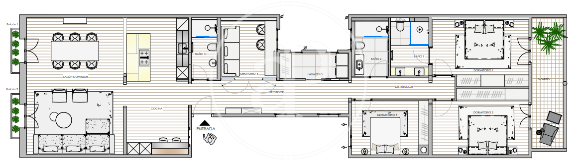 Amb una superfície de 187 m², el pis presenta una distribució moderna i equilibrada, diferenciant de manera natural la zona de dia i la de nit.