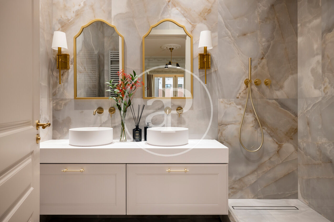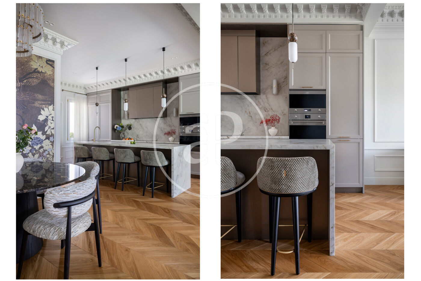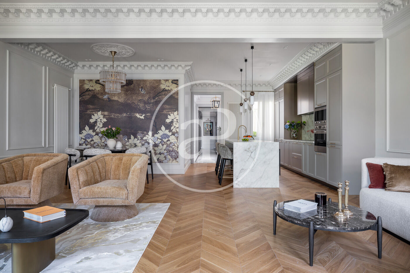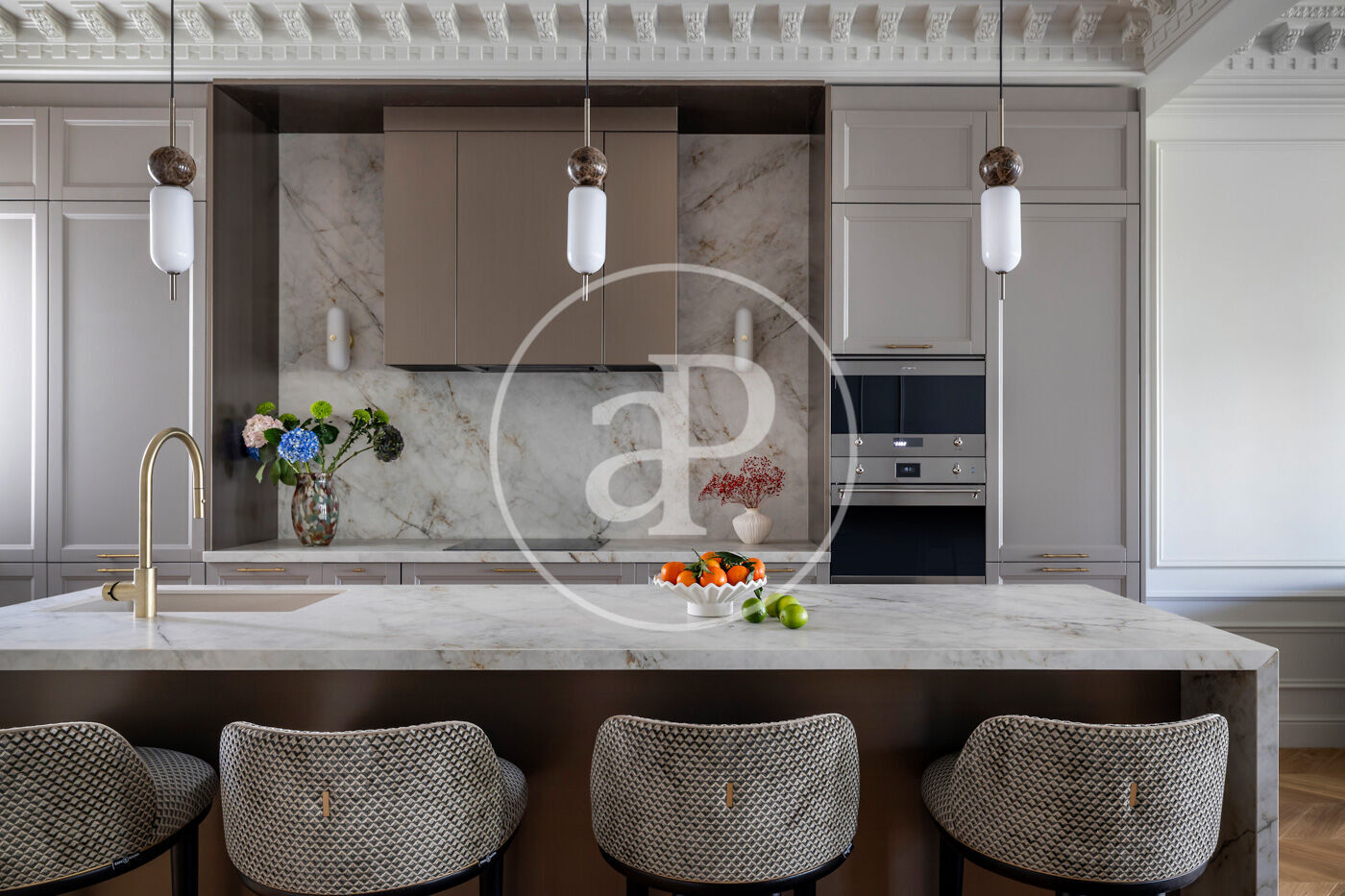 Accedim a l’habitatge per un elegant rebedor que dona pas a un espectacular espai de 68 m² que inclou una cuina oberta totalment equipada amb electrodomèstics d’alta gamma, així com una gran illa revestida de porcellànic italià Florim, i un saló menjador amb sortida directa a dos balcons i espectaculars vistes a l’Hotel Majestic i al Passeig de Gràcia.