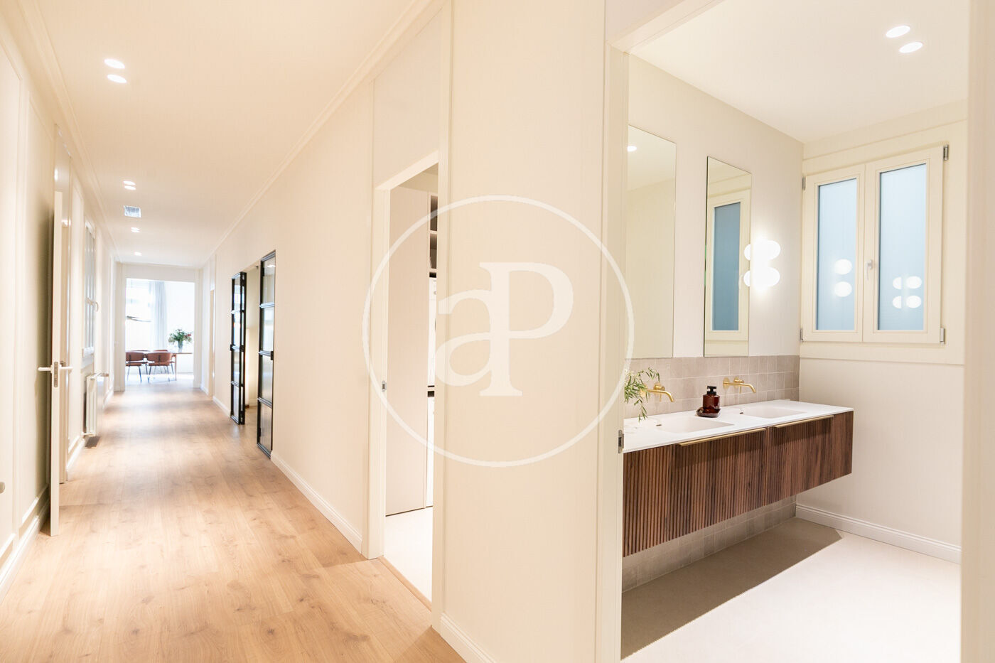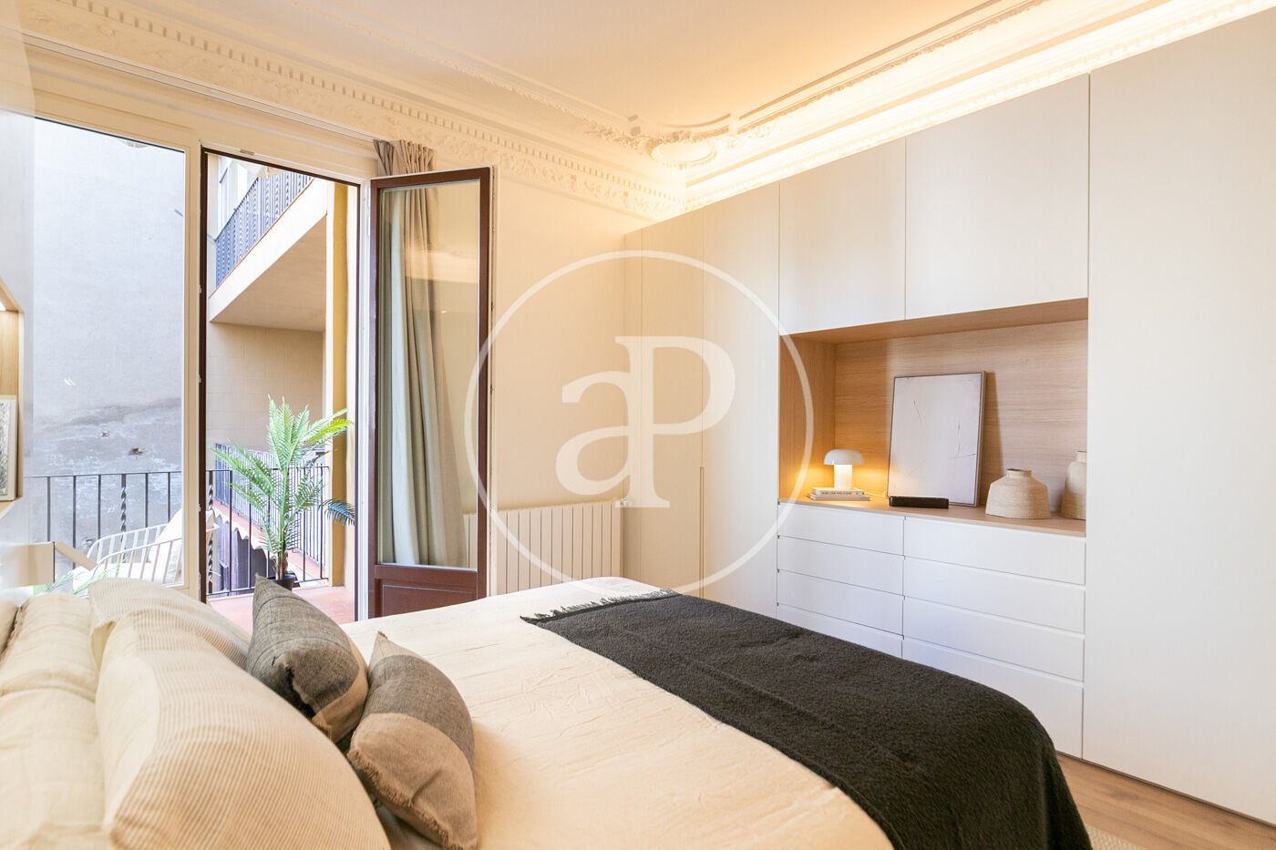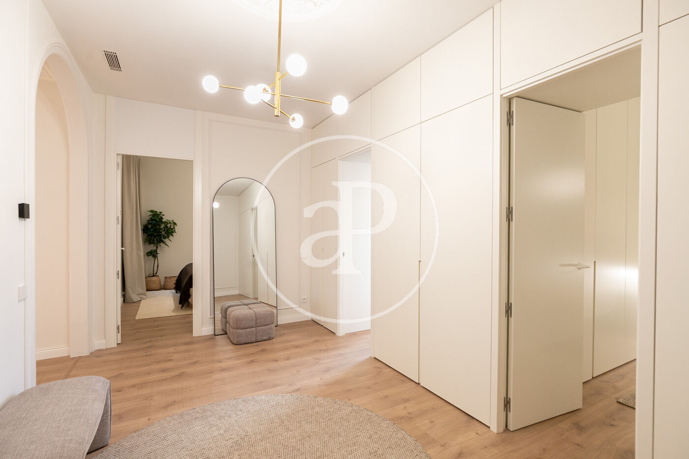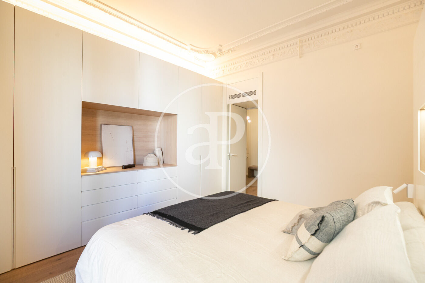 • Portes interiors corredisses i abatibles, armaris encastats a mida amb acabats en fusta o tèxtil i il·luminació LED.
