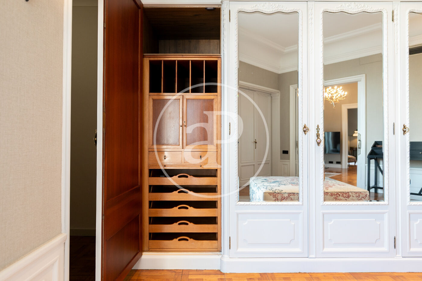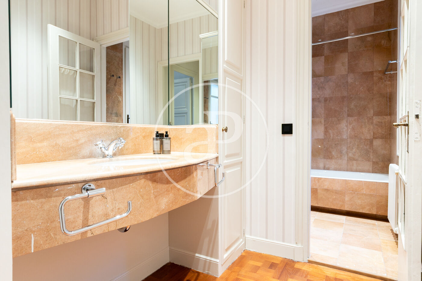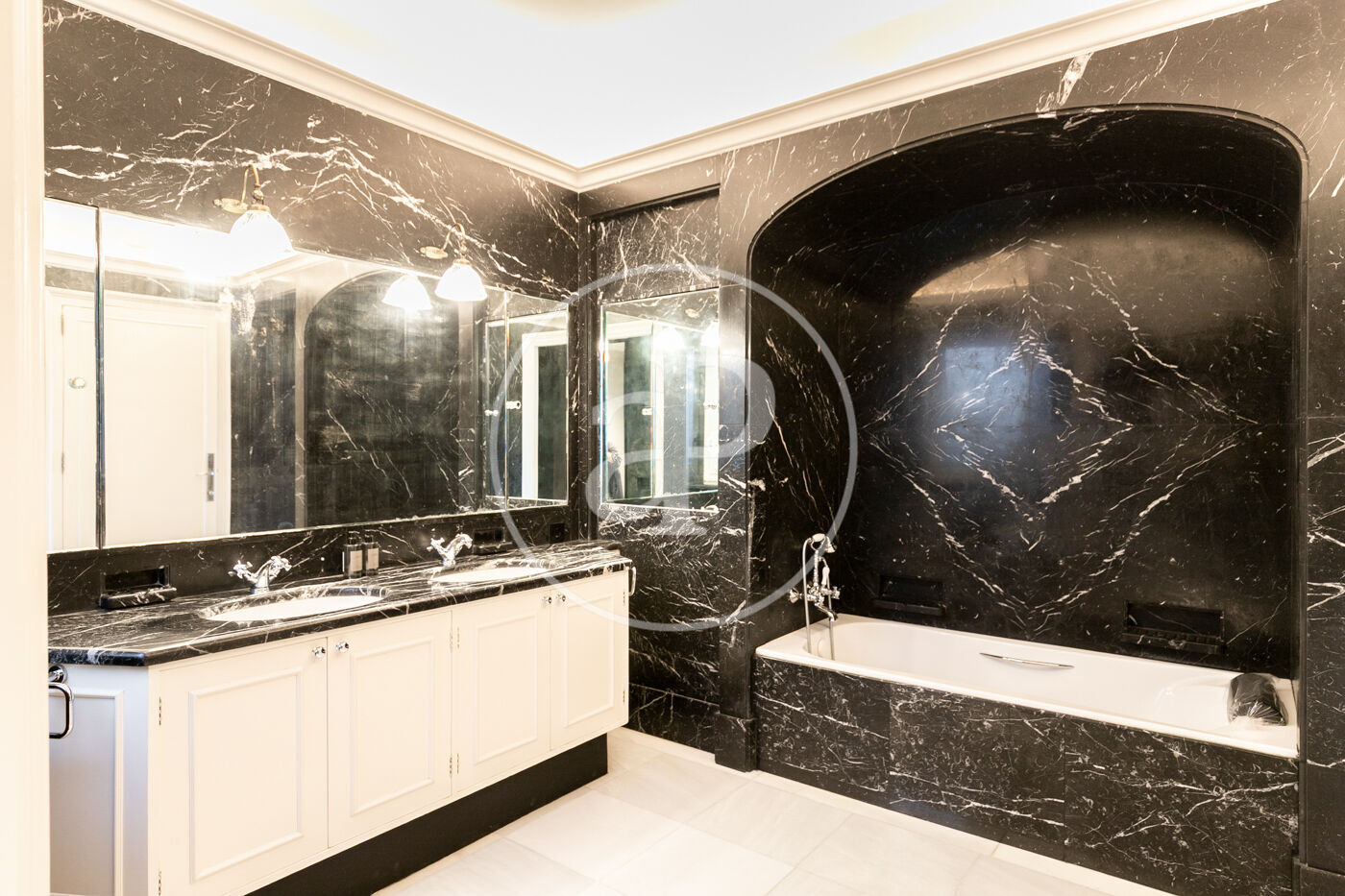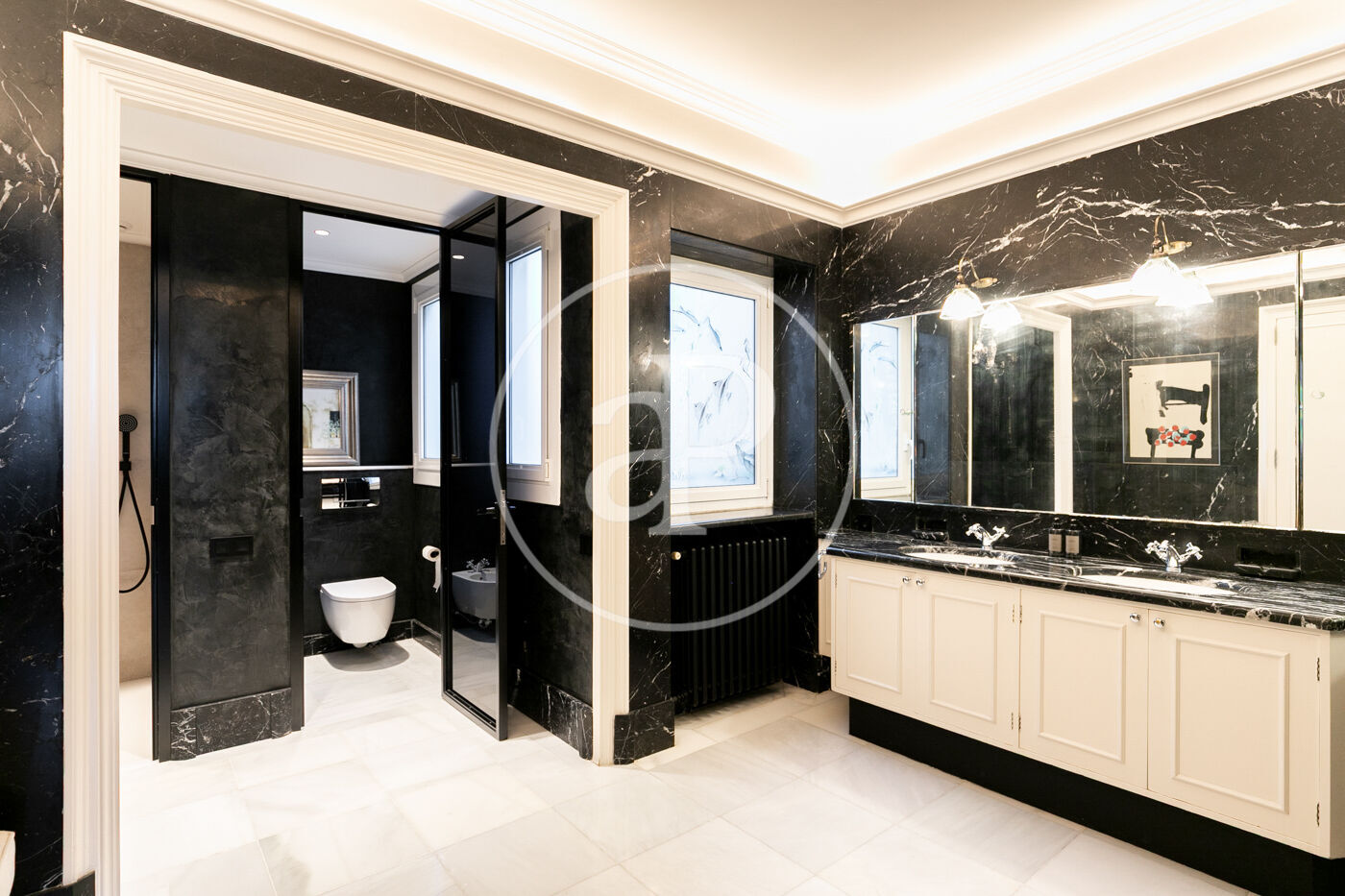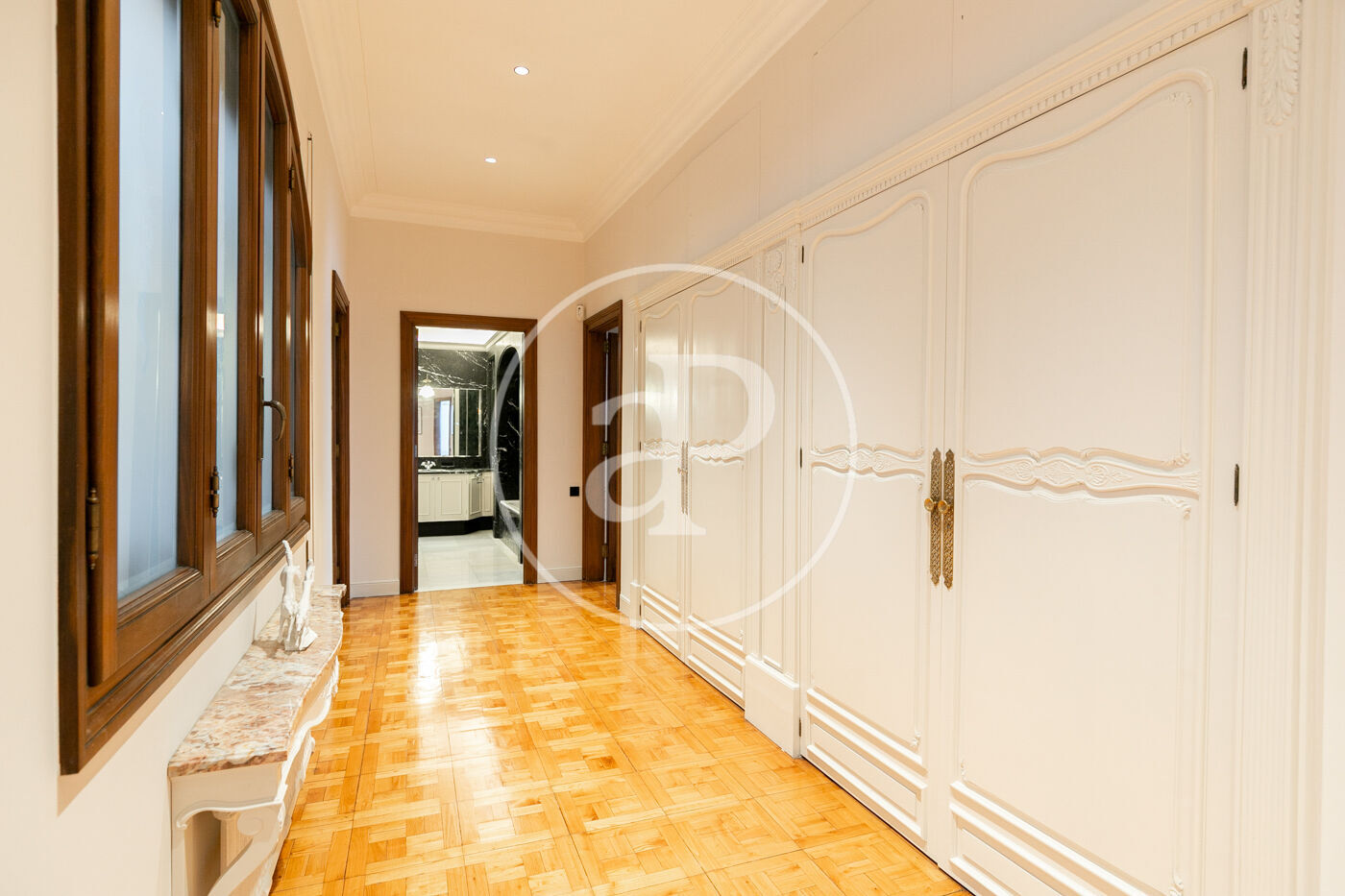 La zona de nit ofereix cinc suites, totes amb armaris encastats i bany privat. La suite principal, d’aproximadament 60 m², compta amb vestidor, sala d’estar i un elegant bany de marbre amb dutxa i banyera. El pis es lloga totalment moblat i equipat, amb possibilitat de plaça d’aparcament propera.