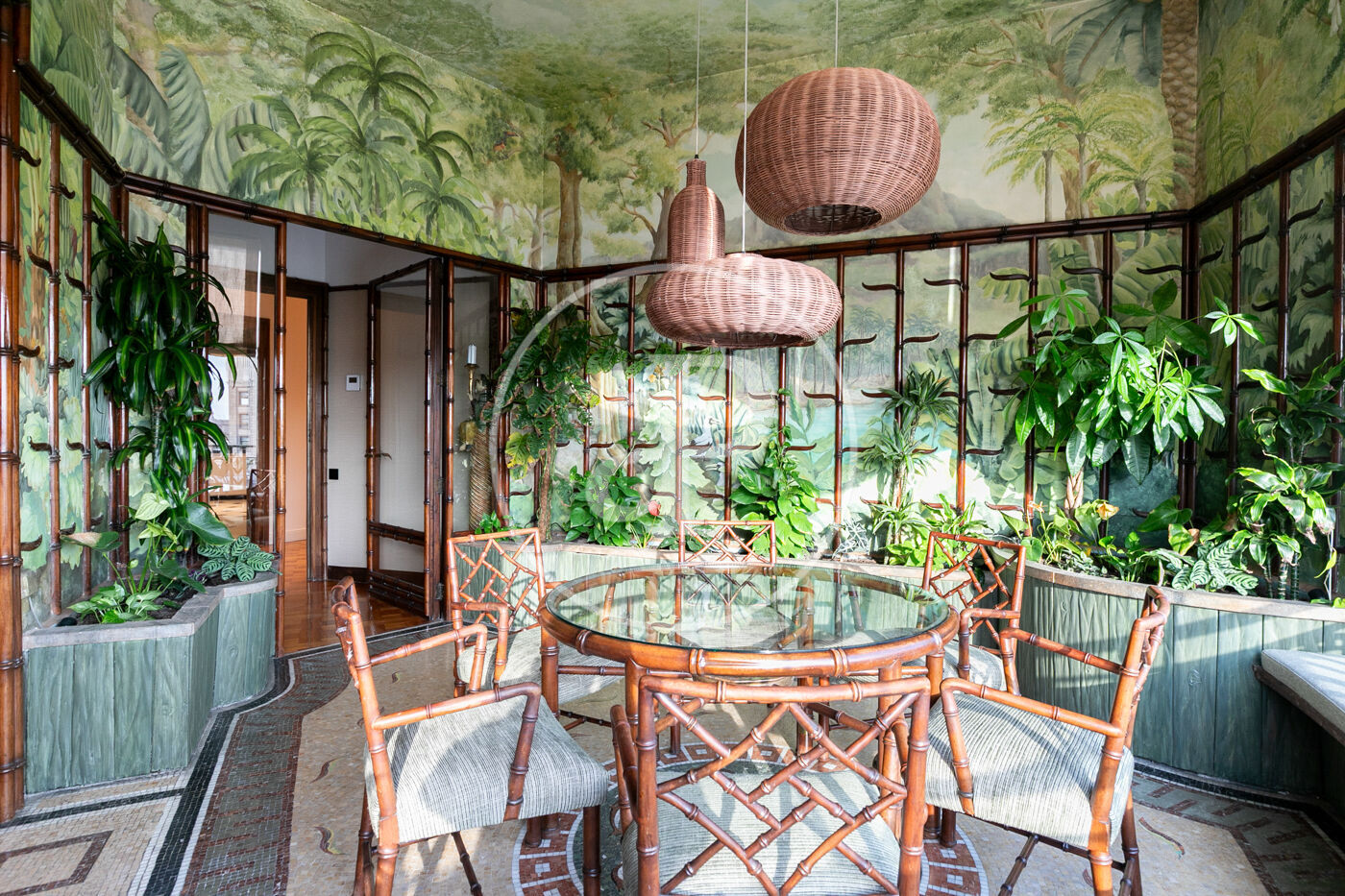 L’ampli vestíbul d’accés distribueix els diferents espais, entre els quals destaquen un saló principal amb vistes al Passeig de Gràcia, una biblioteca o sala de televisió, un menjador per a 12 comensals i una estança lluminosa amb inspiració tropical que actua com a mirador sobre l’avinguda.