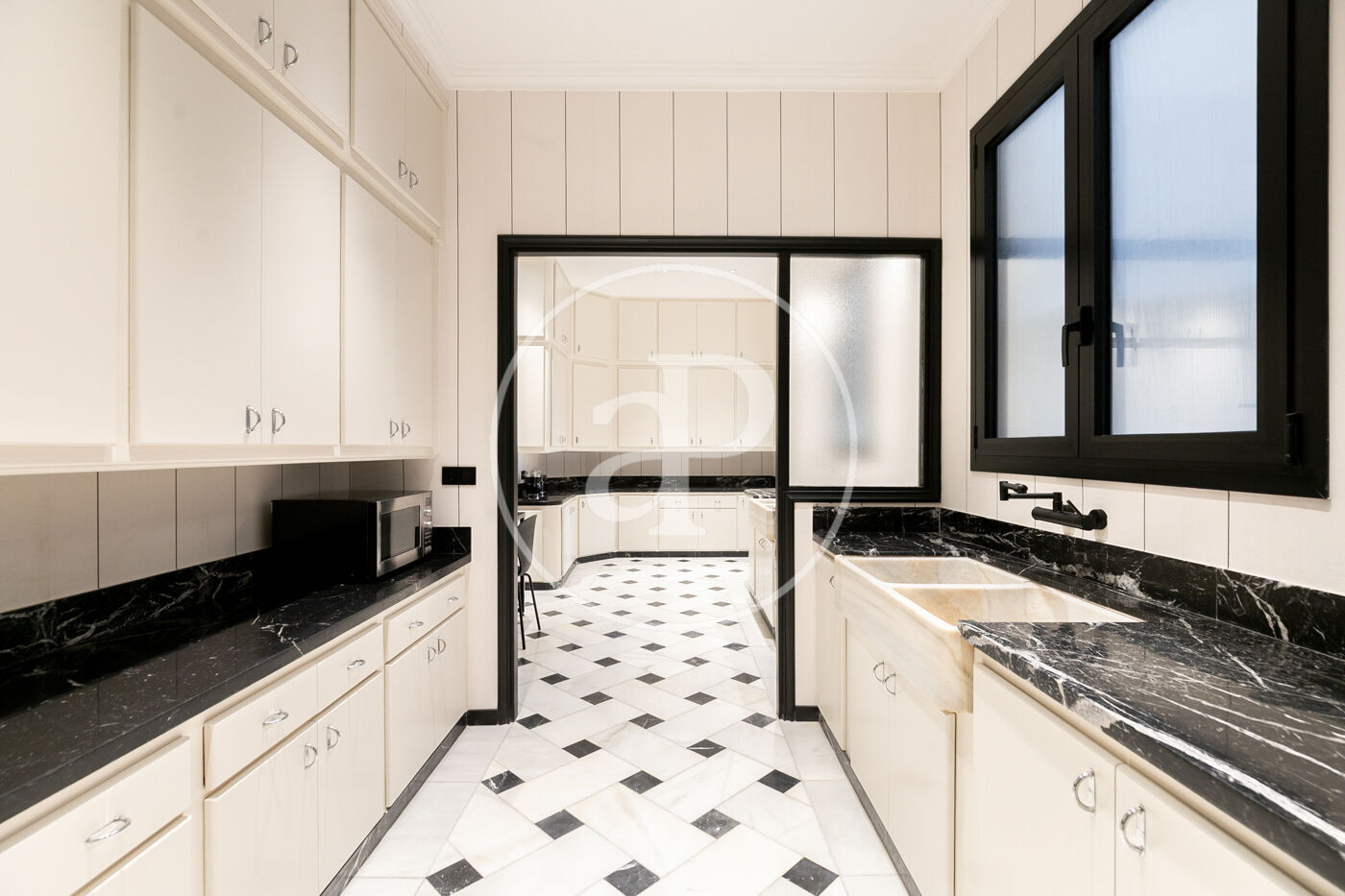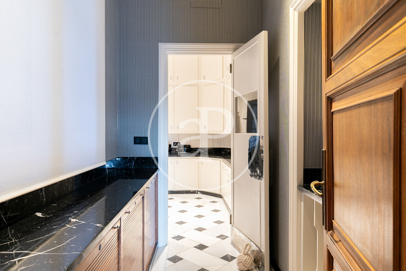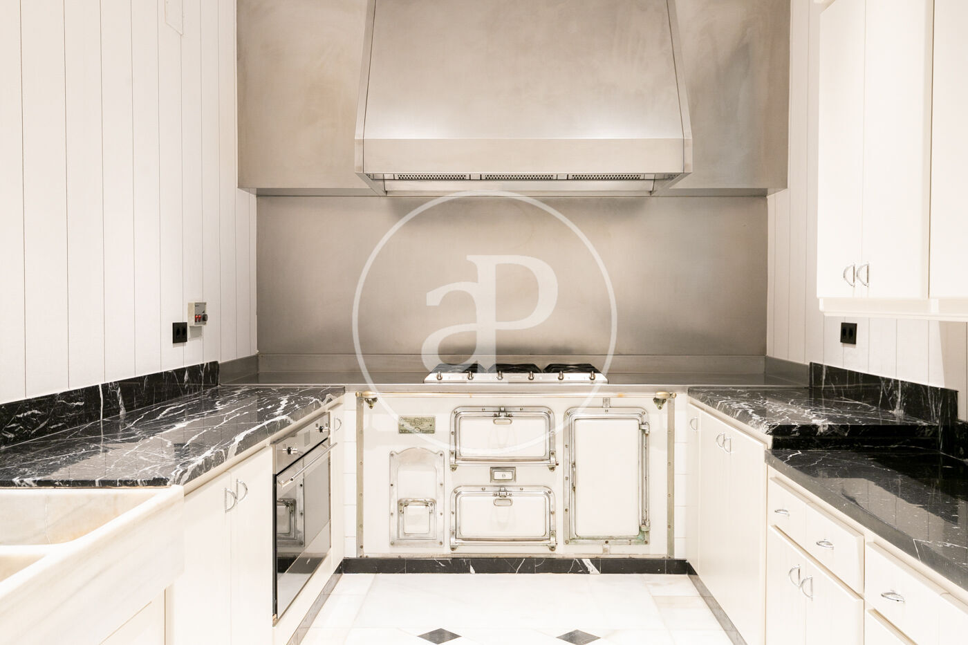 La cuina tipus office ha estat restaurada respectant el disseny original de principis del segle XX: taulells de marbre, terres, mobiliari i la cuina econòmica nacarada de porcellana. Aquesta ha estat equipada amb electrodomèstics d’alta gamma i disposa de zona d’esmorzar, safareig independent i lavabo de servei.