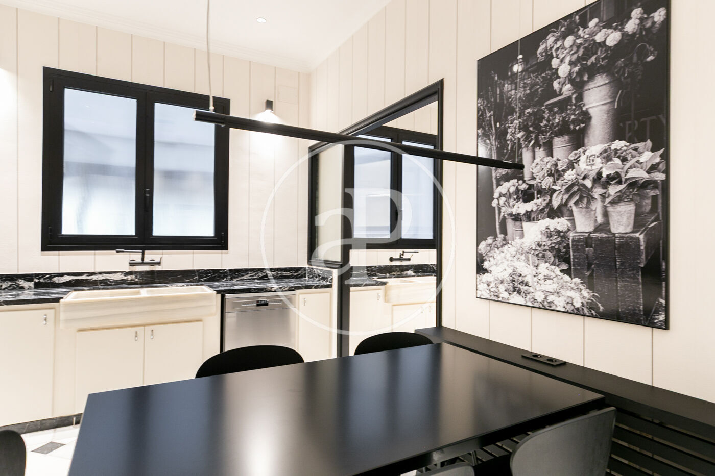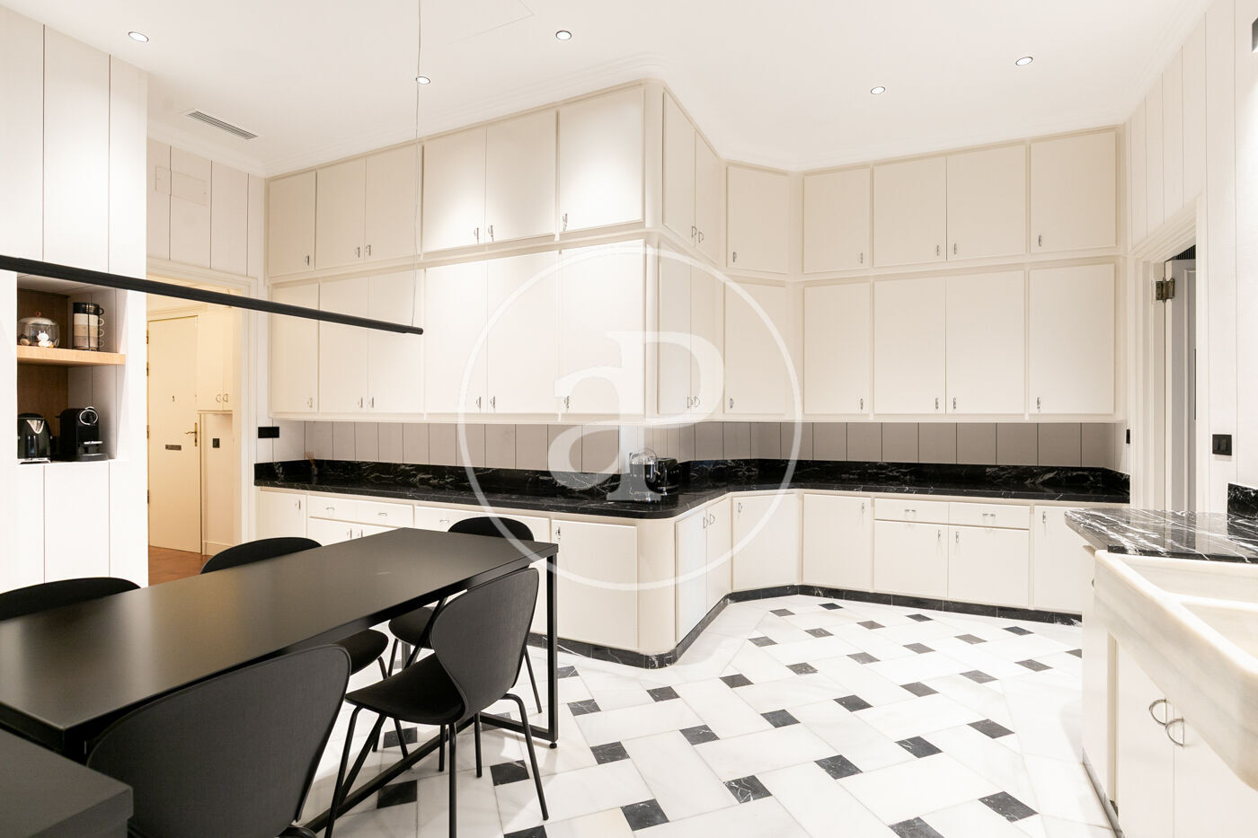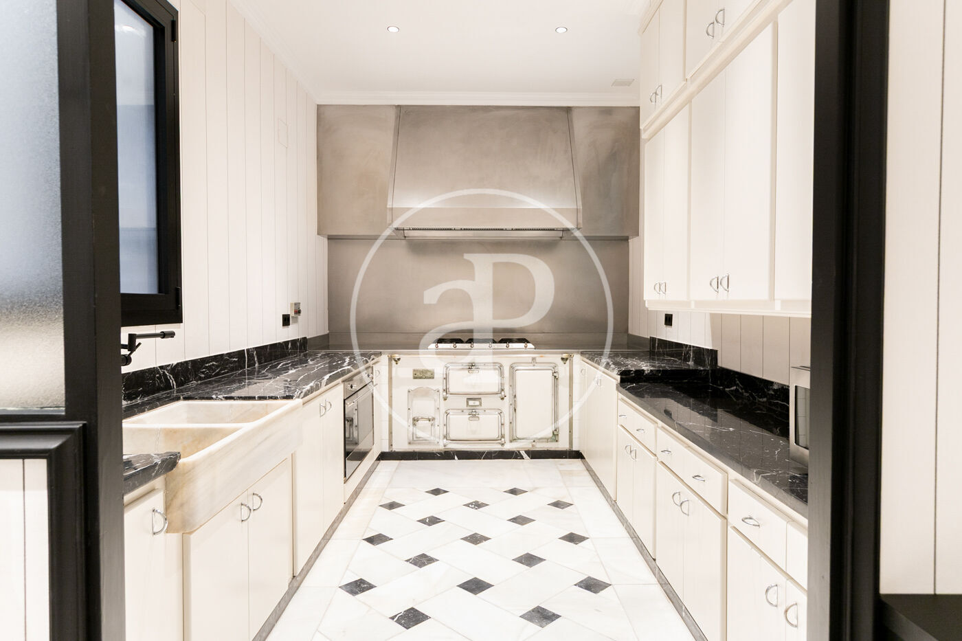 La cuina tipus office ha estat restaurada respectant el disseny original de principis del segle XX: taulells de marbre, terres, mobiliari i la cuina econòmica nacarada de porcellana. Aquesta ha estat equipada amb electrodomèstics d’alta gamma i disposa de zona d’esmorzar, safareig independent i lavabo de servei.
