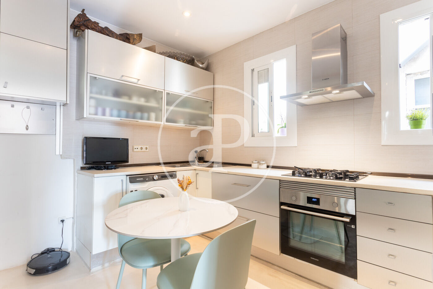 La cuina, independent del saló, està totalment equipada amb electrodomèstics moderns, entre ells una cuina de gas, rentavaixelles i cafetera espresso, oferint tot el necessari per a aquells que gaudeixen del dia a dia o de cuinar a casa. El saló, ampli i molt lluminós, destaca per la seva sortida directa al balcó, un racó perfecte per relaxar-se i gaudir de l’ambient urbà.
