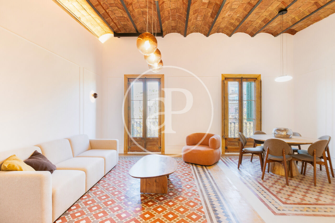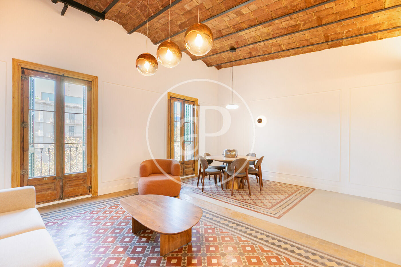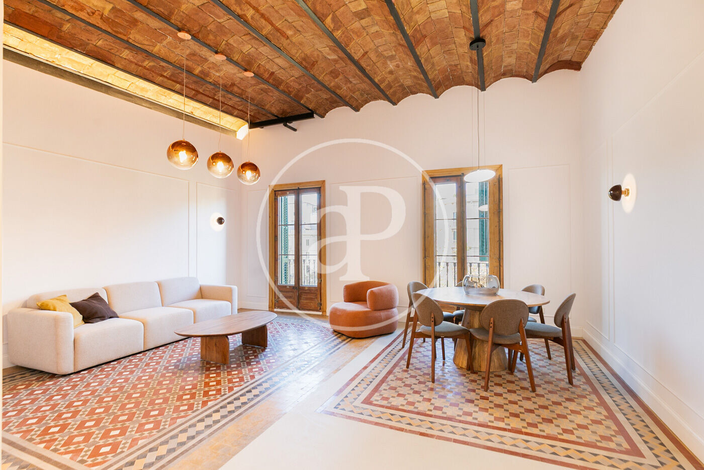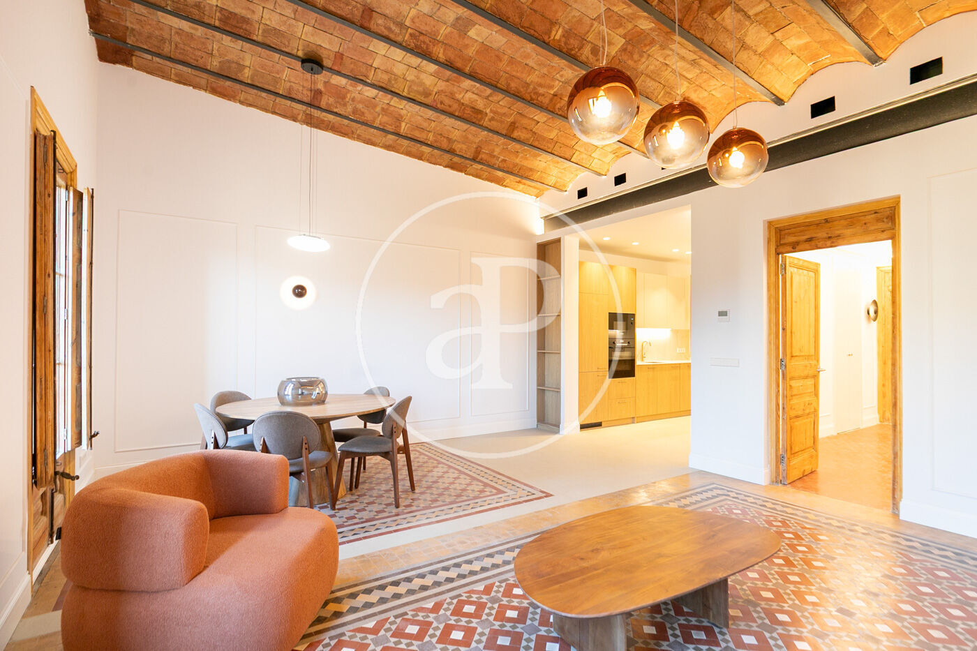 El pis s’entrega totalment moblat, amb mobiliari de disseny i una reforma integral que respecta l’essència arquitectònica de la finca: paviments hidràulics, volta catalana i detalls artesanals que doten la vivenda d’una personalitat única.