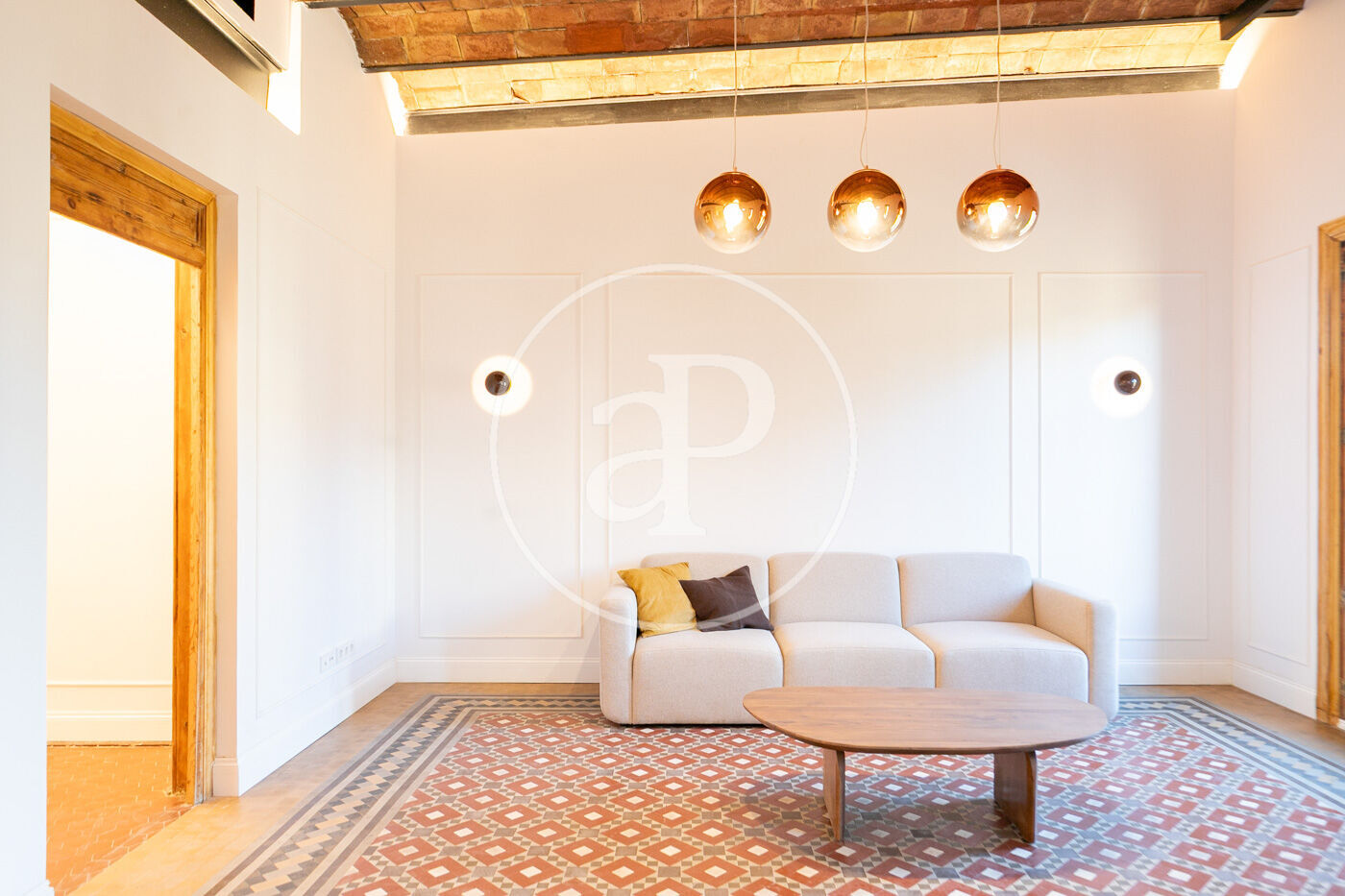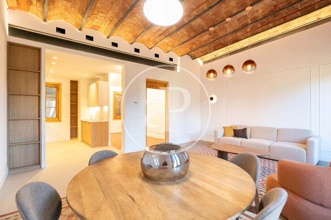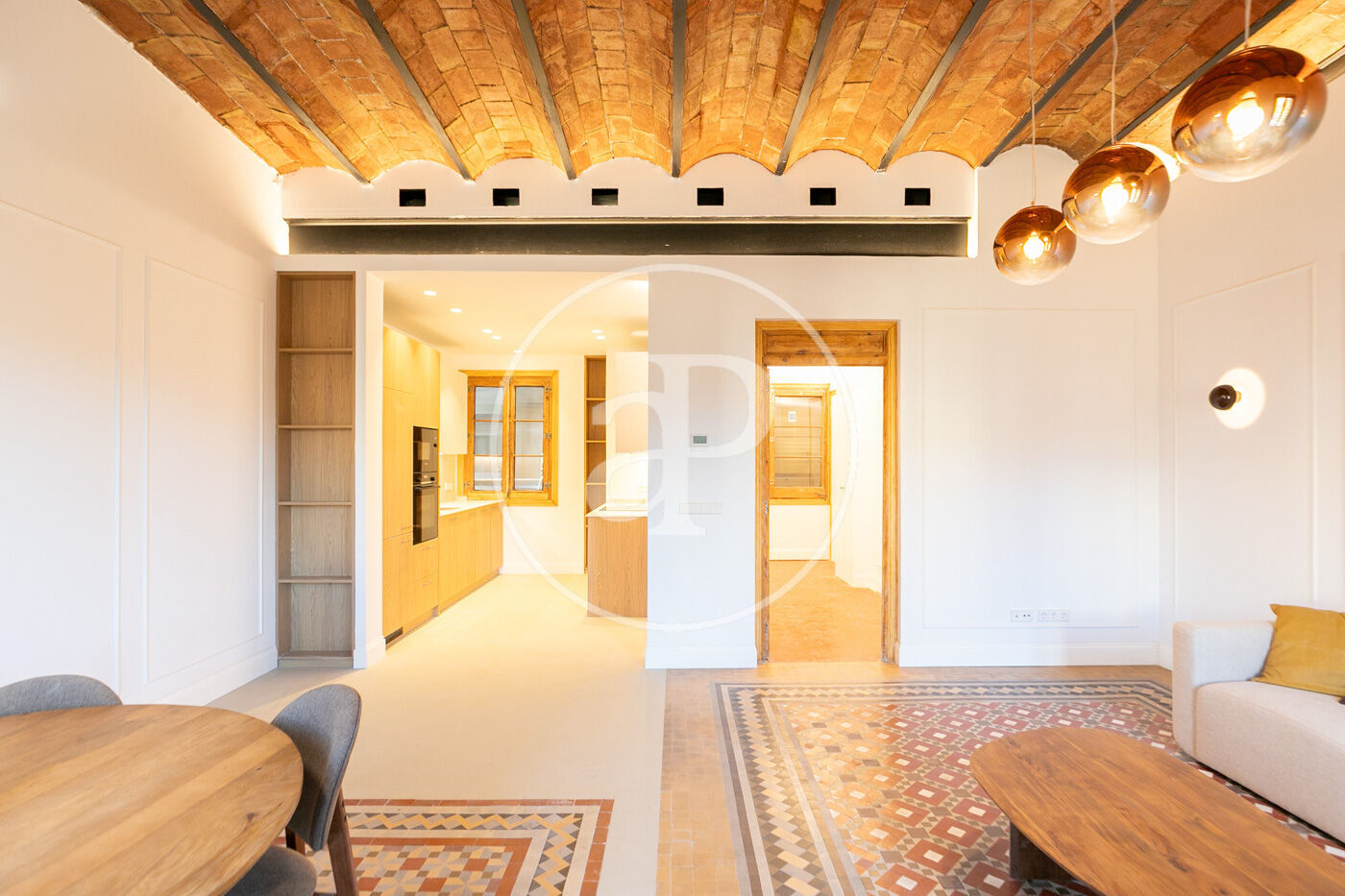 El pis s’entrega totalment moblat, amb mobiliari de disseny i una reforma integral que respecta l’essència arquitectònica de la finca: paviments hidràulics, volta catalana i detalls artesanals que doten la vivenda d’una personalitat única.