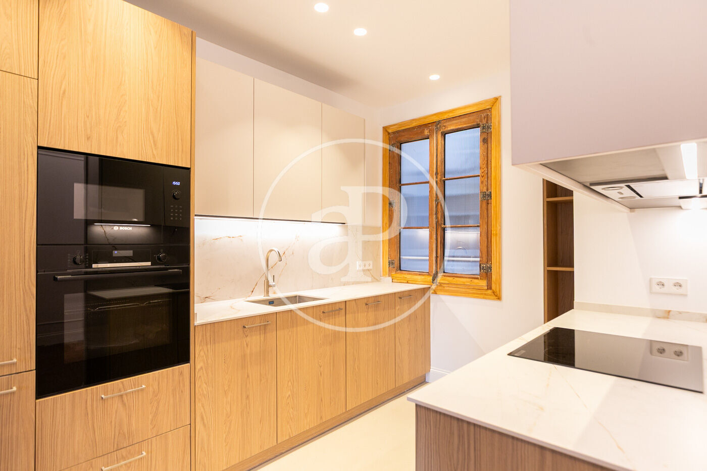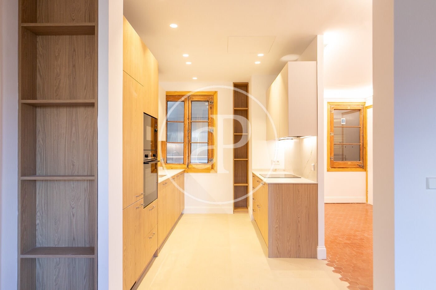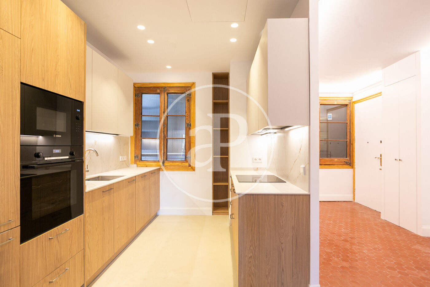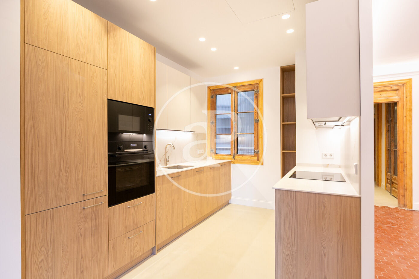 En accedir-hi, un ampli rebedor amb armari de cortesia dona la benvinguda a una vivenda elegant i lluminosa. El saló–menjador destaca pel seu espectacular paviment hidràulic original, la volta catalana i les motllures restaurades, que aporten caràcter i autenticitat a l’espai. La cuina oberta, totalment equipada amb electrodomèstics integrats i un disseny de línies pures, integra l’ambient social amb una harmonia excepcional. La vivenda disposa d’aire condicionat i calefacció per conductes per a un màxim confort.