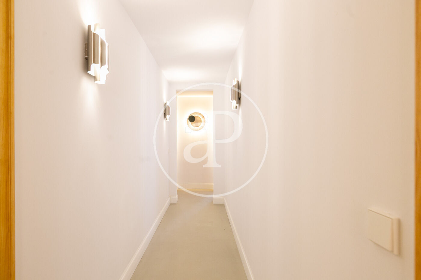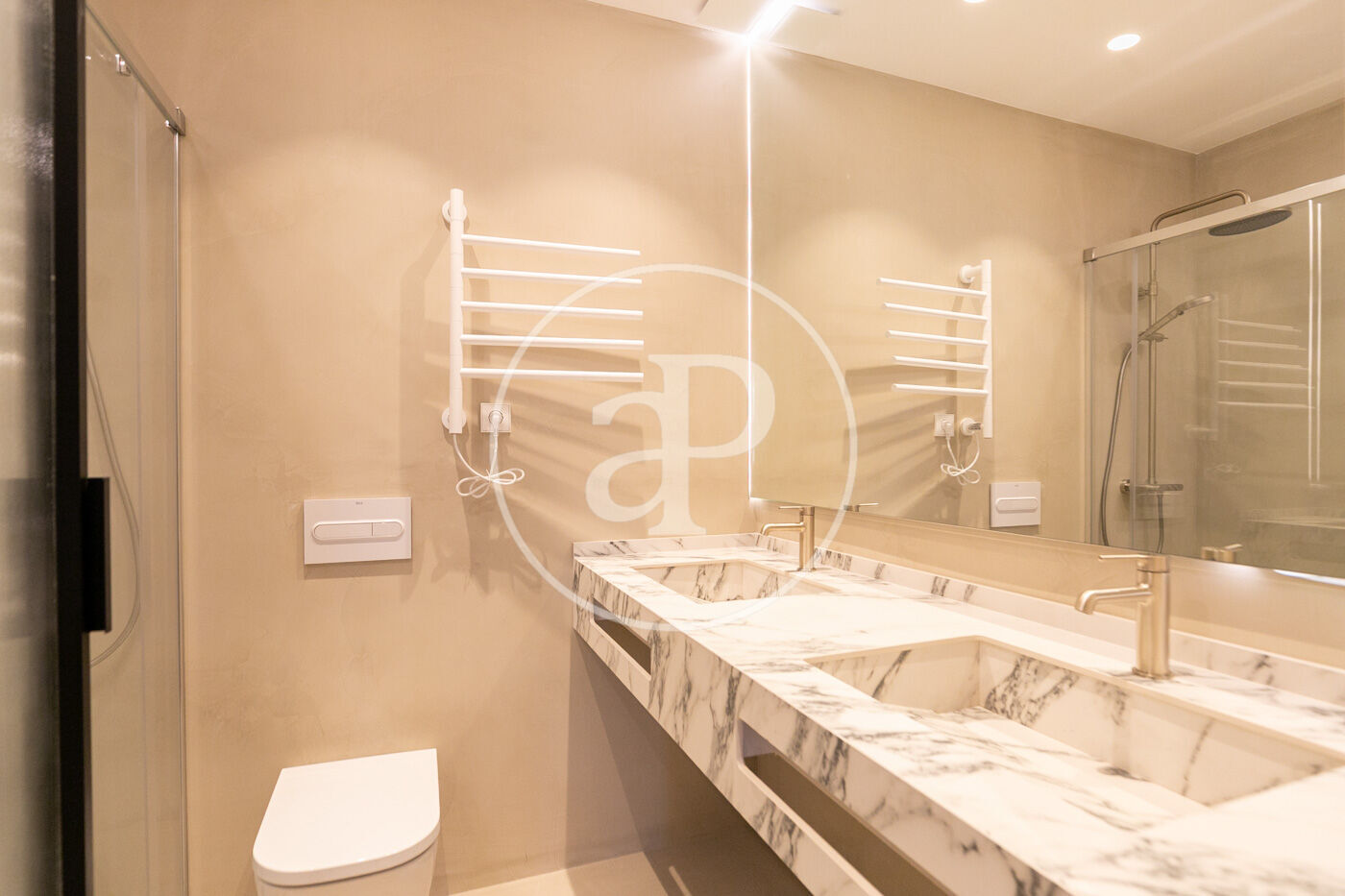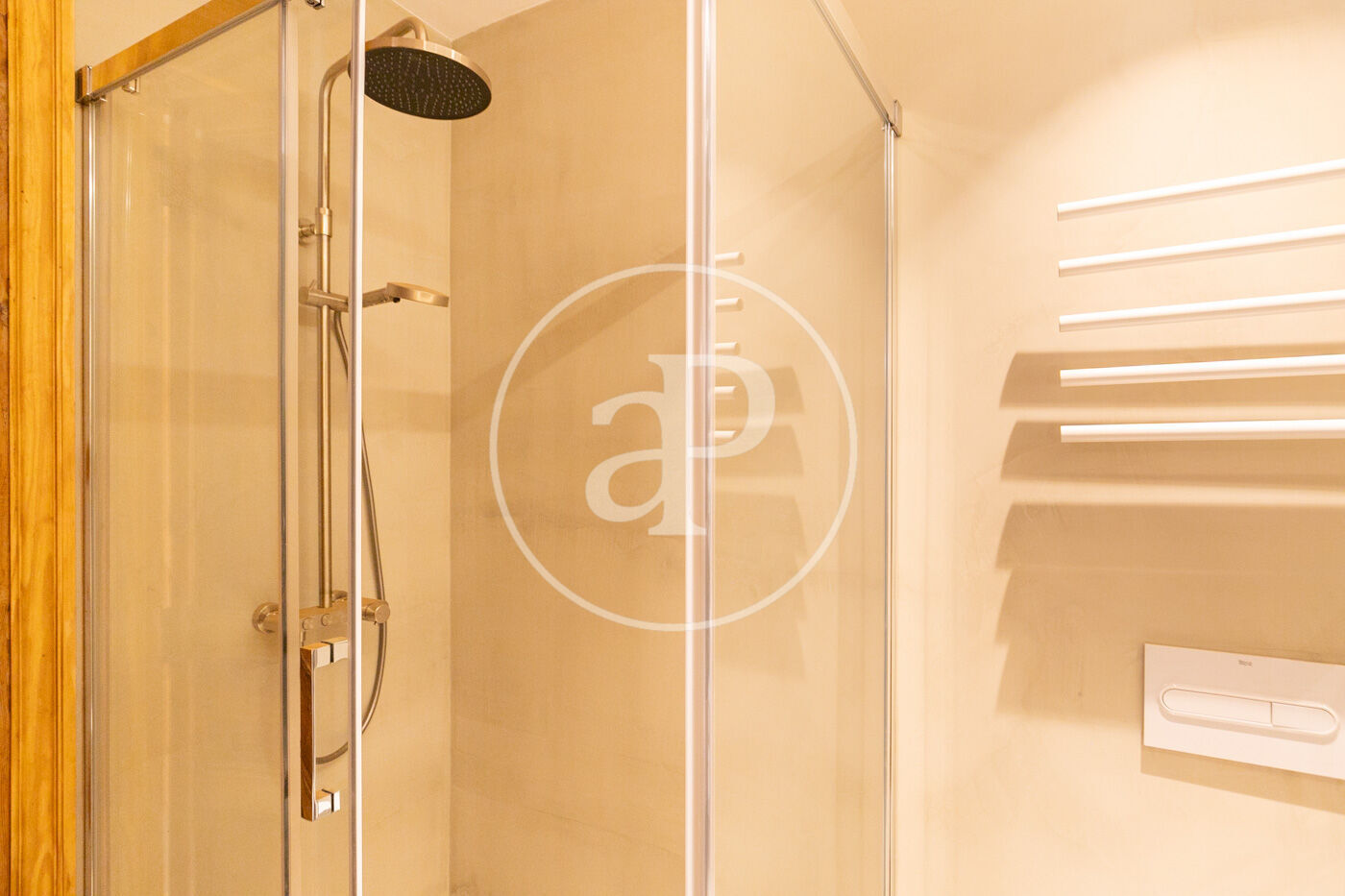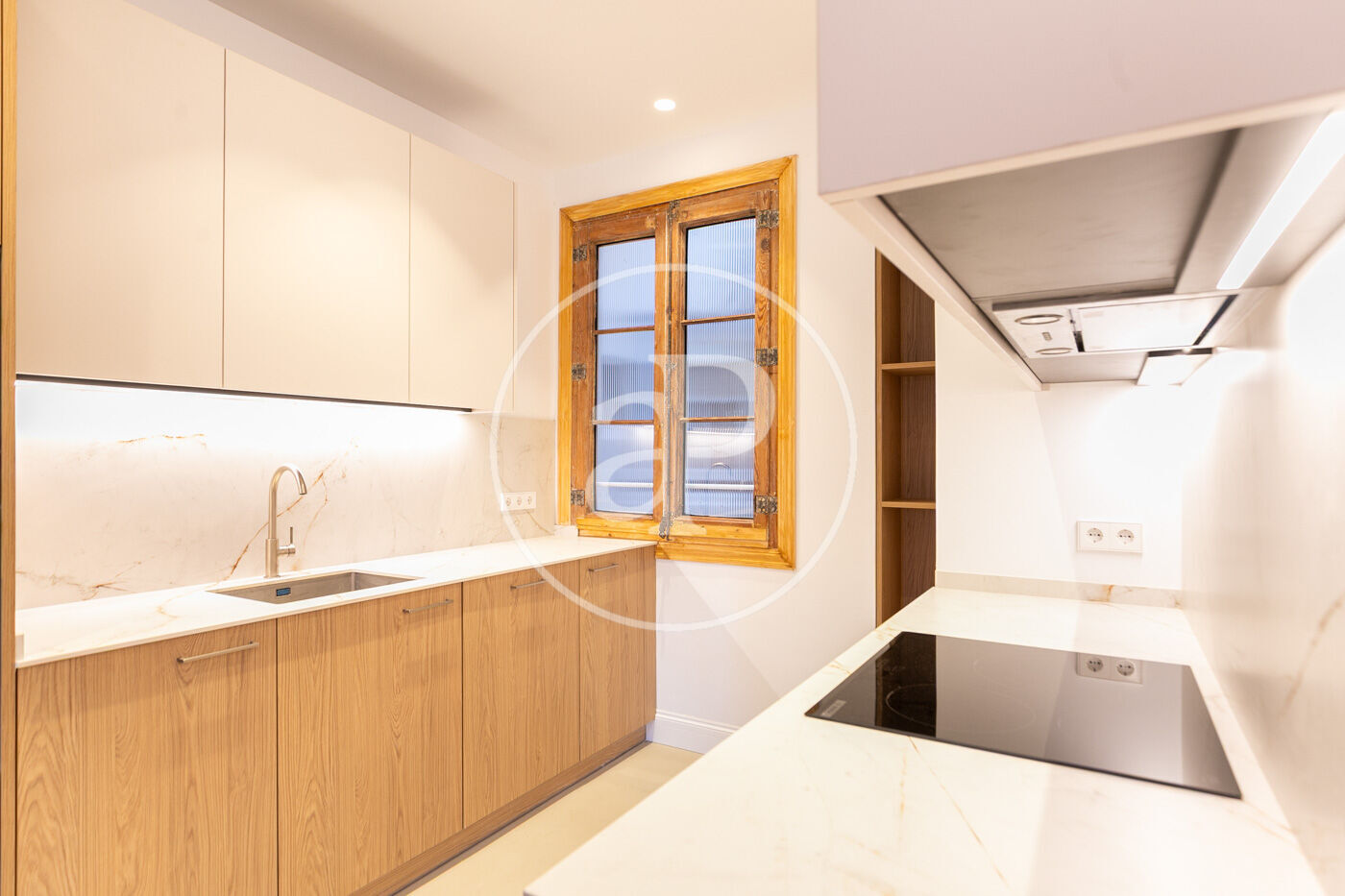 En accedir-hi, un ampli rebedor amb armari de cortesia dona la benvinguda a una vivenda elegant i lluminosa. El saló–menjador destaca pel seu espectacular paviment hidràulic original, la volta catalana i les motllures restaurades, que aporten caràcter i autenticitat a l’espai. La cuina oberta, totalment equipada amb electrodomèstics integrats i un disseny de línies pures, integra l’ambient social amb una harmonia excepcional. La vivenda disposa d’aire condicionat i calefacció per conductes per a un màxim confort.