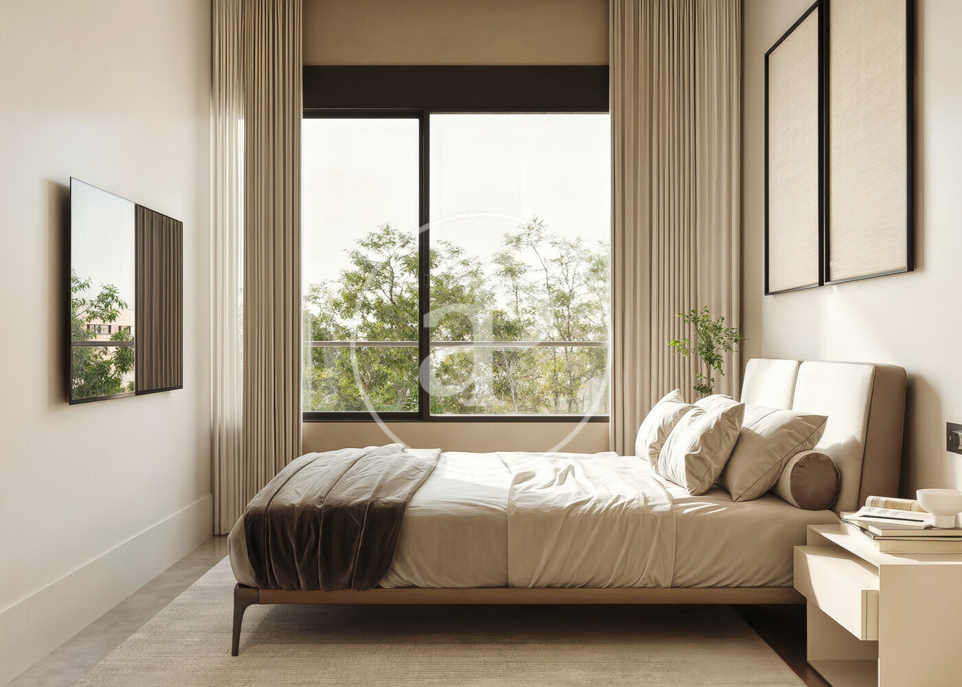 Els terres estan revestits amb microciment de primera qualitat. El dormitori compta amb un armari encastat de terra a sostre, amb portes, calaixos i prestatges en roure clar. Els banys presenten un acabat integral en microciment tant a les parets com als terres, amb aixetes encastades i sanitaris suspesos.