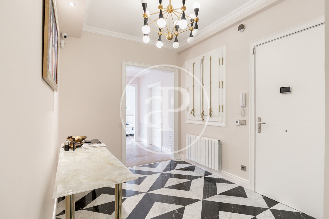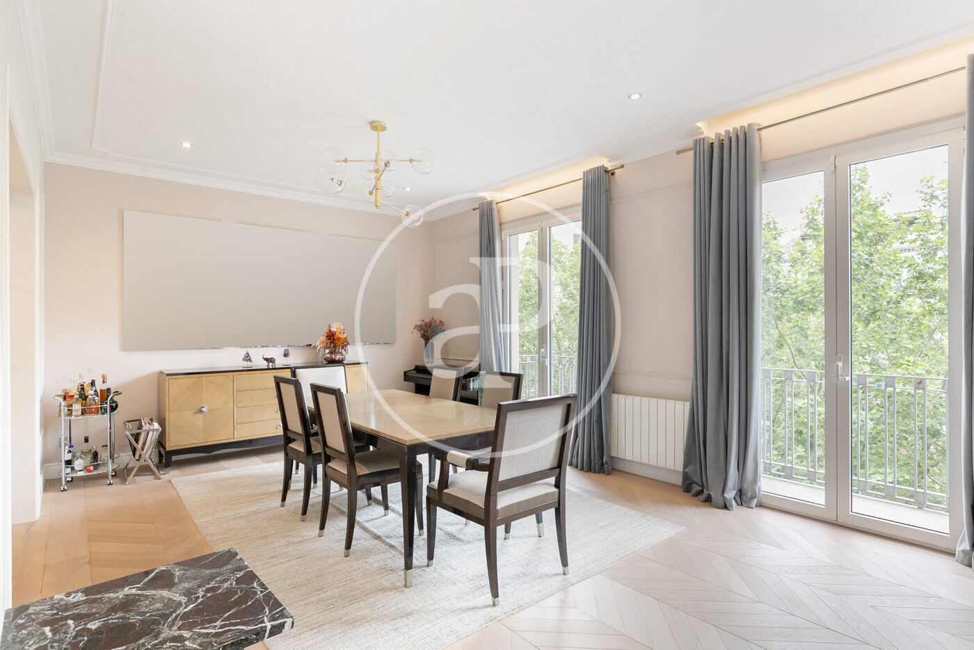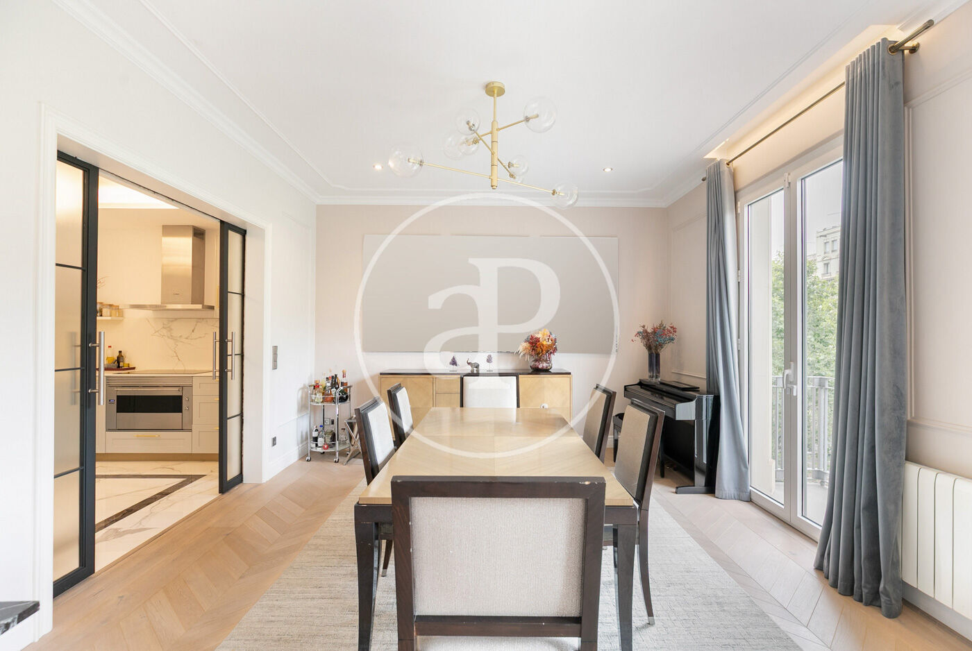 A la prestigiosa Avinguda Diagonal i en una majestuosa finca règia de mitjan segle passat, trobem aquest preciós pis de 225 m² que dona tant a la façana principal com a la posterior, a través de tres balcons al carrer i una petita terrassa i una galeria orientades a un pati interior d’illa. Els seus sostres alts i la gran quantitat de llum emmarquen una reforma amb acabats extremadament acurats i materials d’alta qualitat, tot amb un lleuger toc Art Decó. La distribució, lògica i racional, marca una clara diferència entre la zona de dia i la zona de nit. A la zona de dia, trobem un ampli saló-menjador en una sola peça amb sortida a diversos balcons, juntament amb una àmplia cuina amb zona d’aigües independent i un quart vestidor. A la zona de nit trobem tres dormitoris dobles en suite amb bany i vestidor, dos dels quals són exteriors; un amb sortida a una terrassa d’uns 4 m² i l’altre, el principal, amb galeria envidrada.