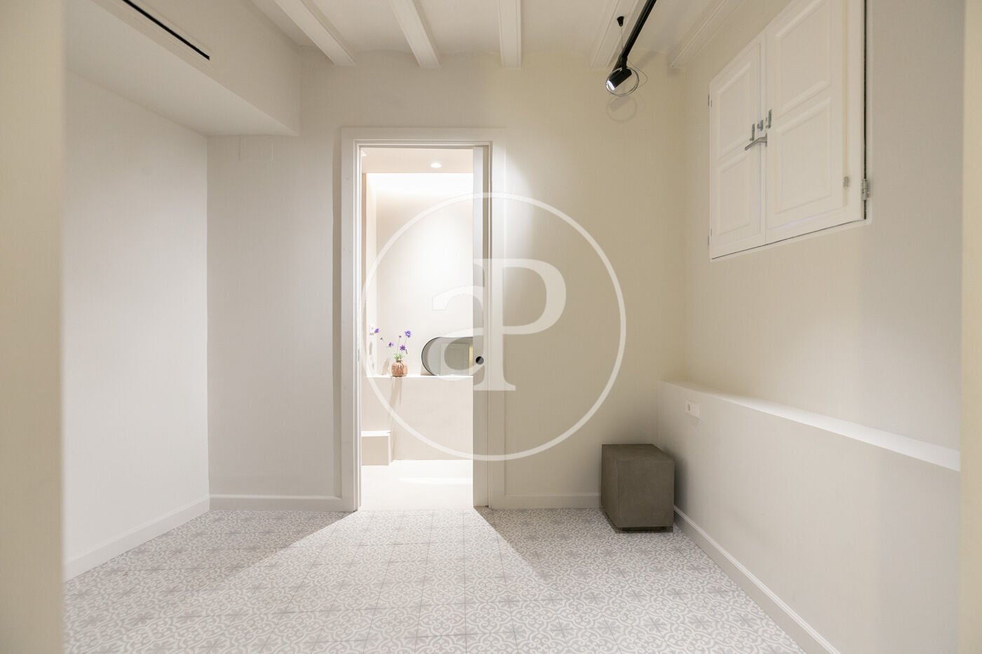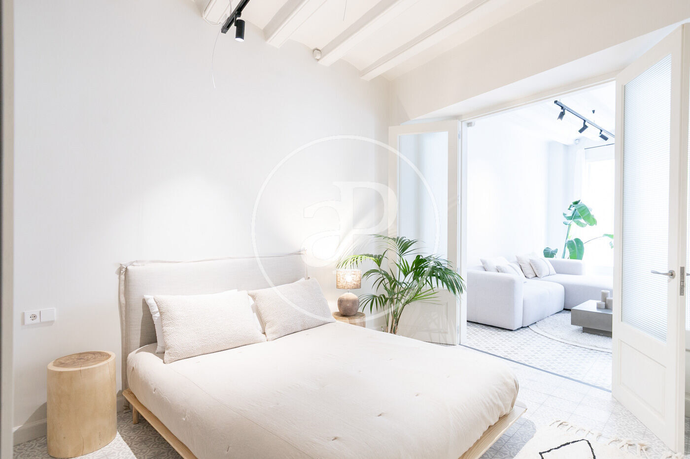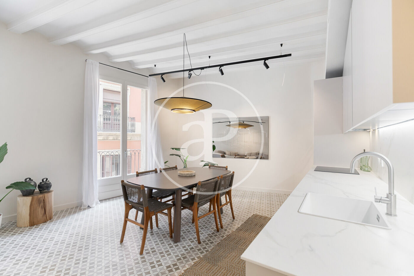 La vivenda compta amb una superfície útil de 90 m² distribuïts de forma funcional i lluminosa. L'ampli saló, banyat per llum natural gràcies a la seva orientació sud-est, s'obre a un balcó que recorre tota la façana principal i ofereix vistes a l'encantadora carrer Sant Pere Més Alt, respirant l'autèntica essència del Born. La cuina americana, integrada en l'espai, està completament equipada amb electrodomèstics d'alta qualitat i mobiliari de disseny.