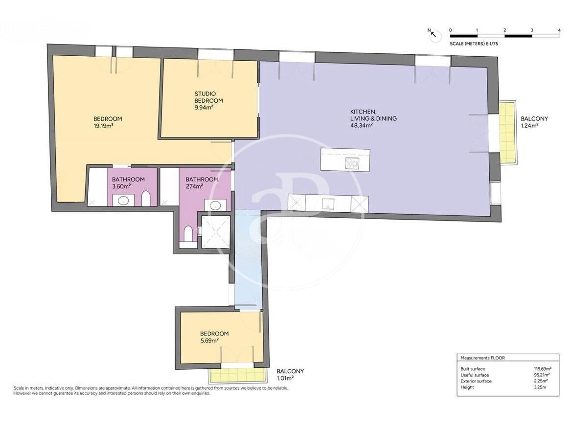 Aquest pis de 3 habitacions (2 suites i un despatx) s’obre a tres balcons al carrer. La zona de saló-menjador-cuina és un espai diàfan amb sortida a dos balcons i sostres molt alts amb bigues vistes... una autèntica meravella! Electrodomèstics d’última generació conviuen amb maó vist, bigues i balcons. Una gran illa a la cuina articula l’espai social, deixant lloc a una àmplia zona de menjador i sala d’estar.