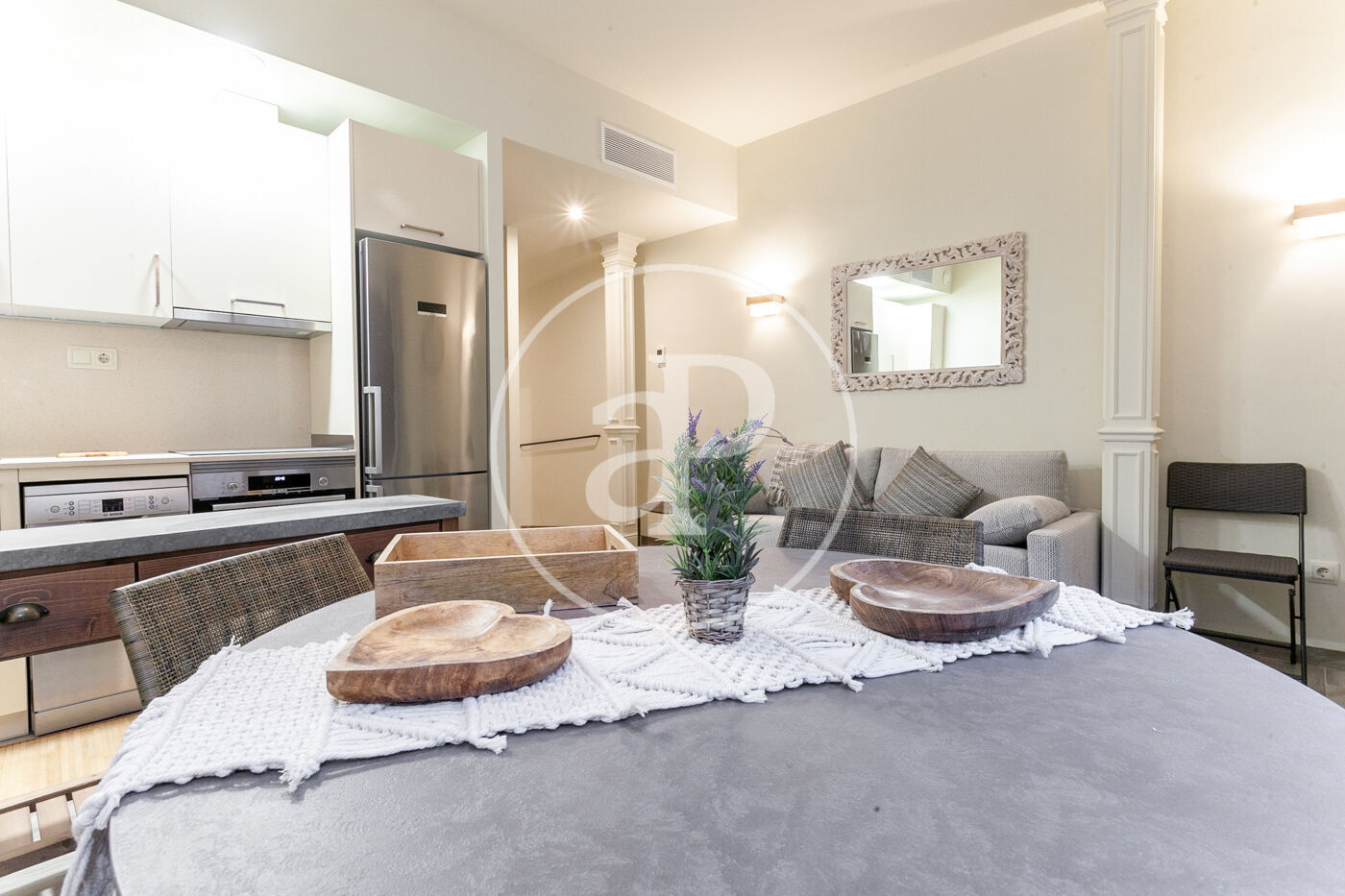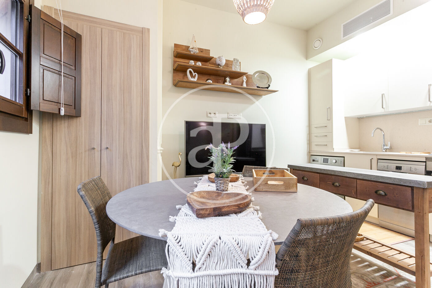 La zona de dia consta de saló-menjador amb sortida a un balcó, cuina americana oberta al saló totalment equipada amb forn/microones/grill, rentavaixelles, rentadora/assecadora marca Bosch i parament.