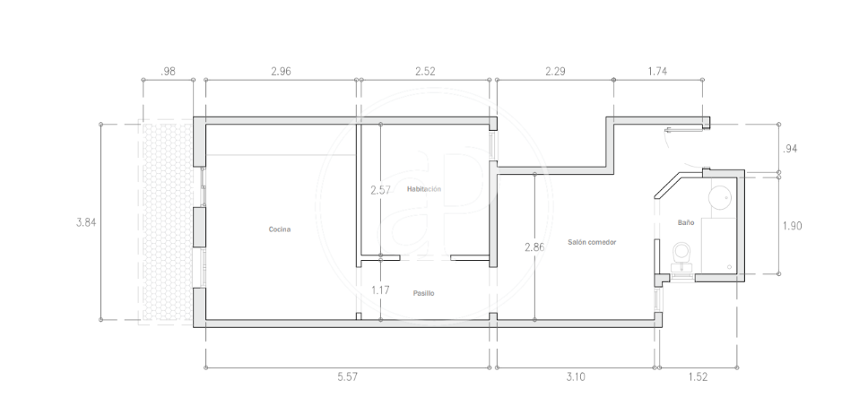 Es distribueix en una zona de sala d’estar, una habitació doble, un bany amb dutxa i una zona diàfana amb cuina americana i menjador que donen accés a un assolellat balcó de 4 m² amb orientació sud.