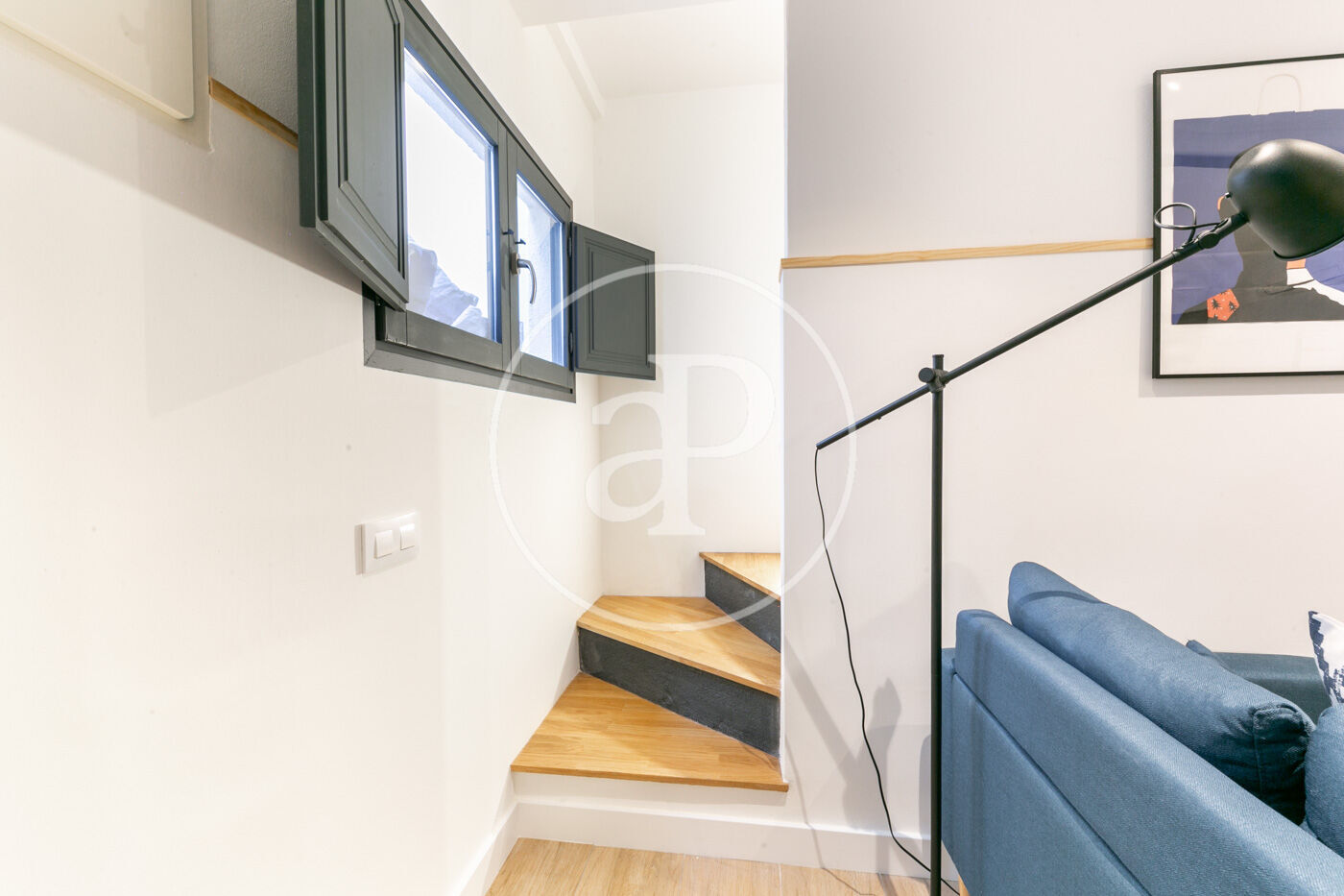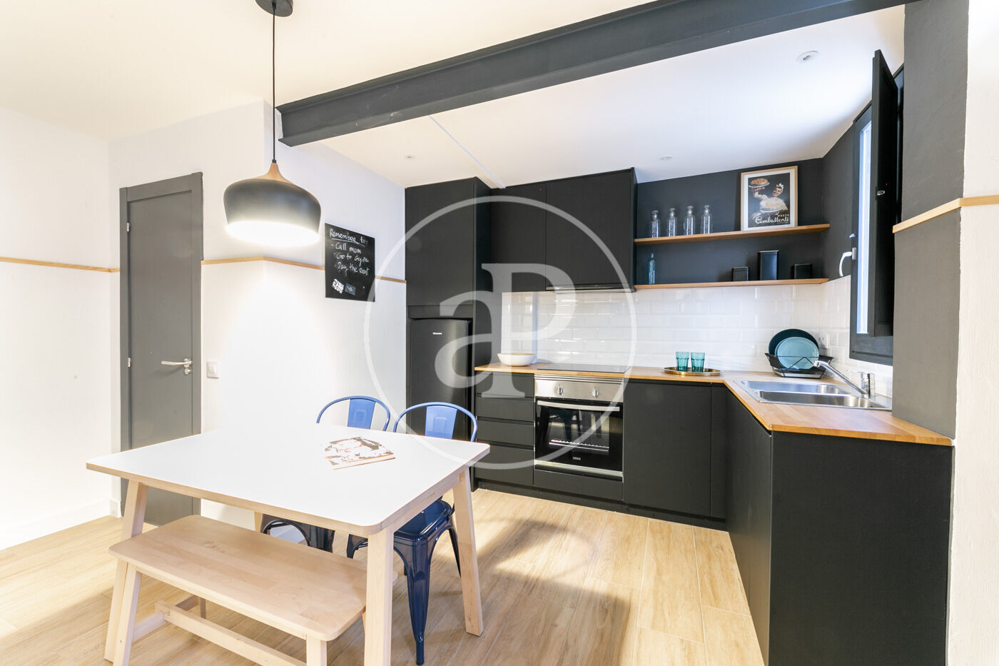 A la planta baixa hi ha un lavabo de cortesia i una cuina oberta al saló. Sota l’escala hi ha un petit armari/traster.