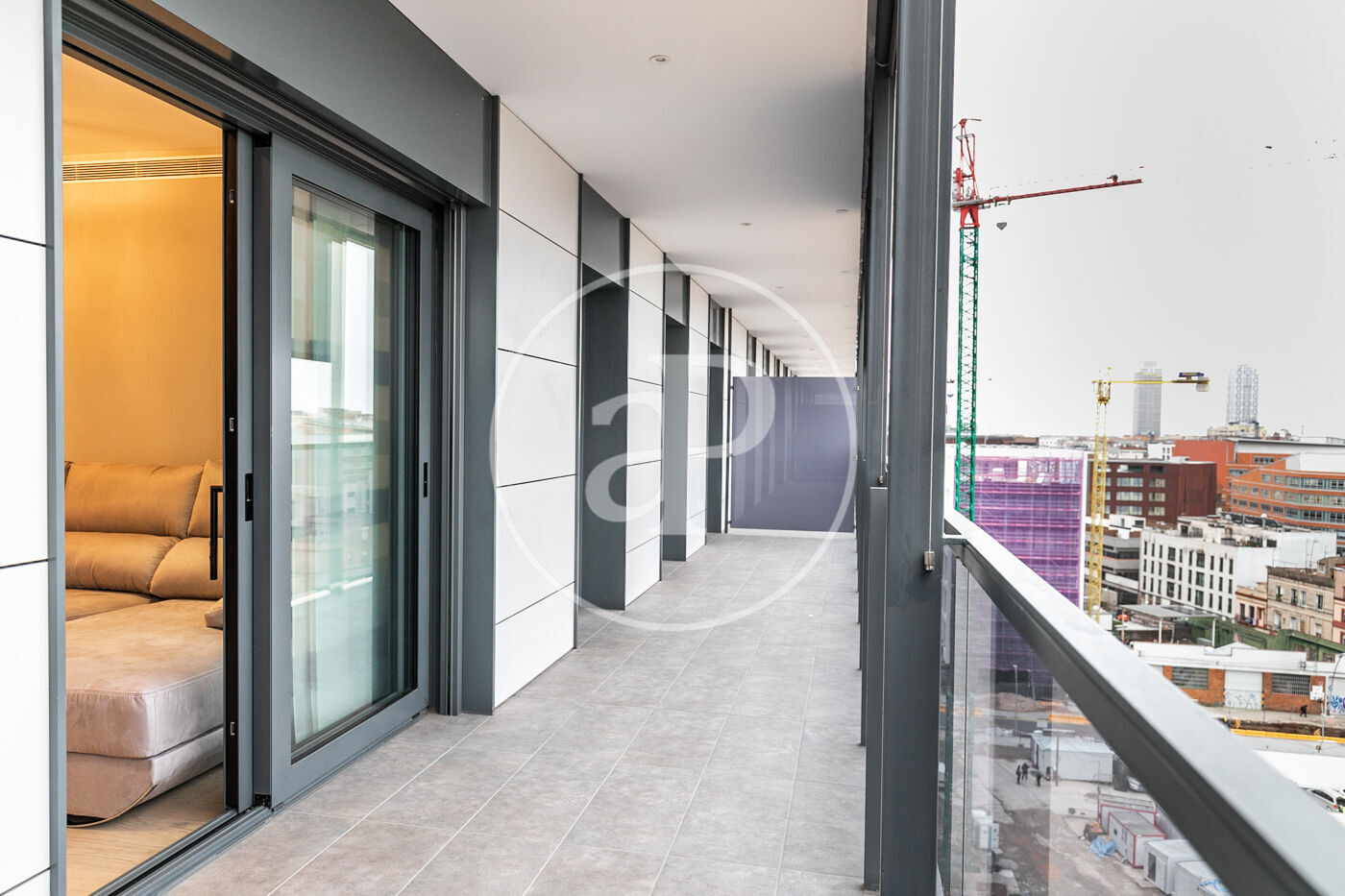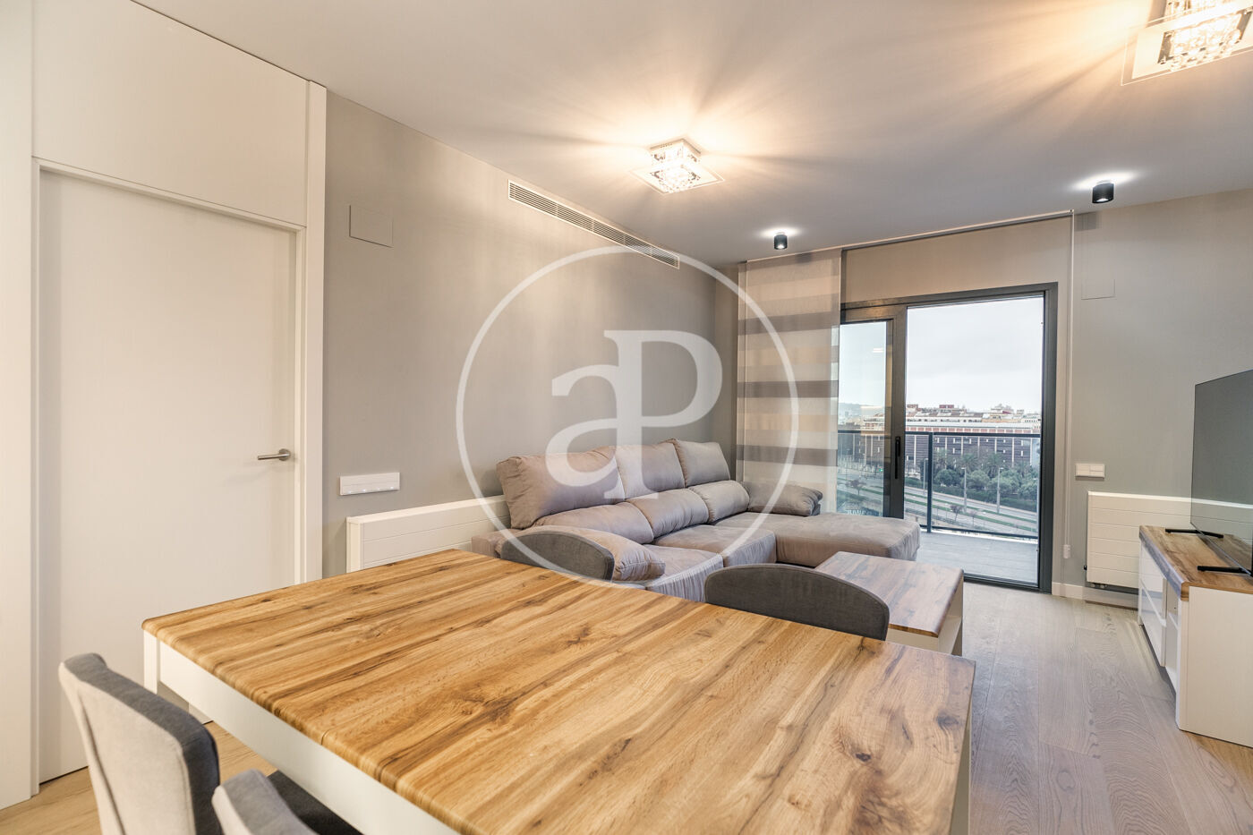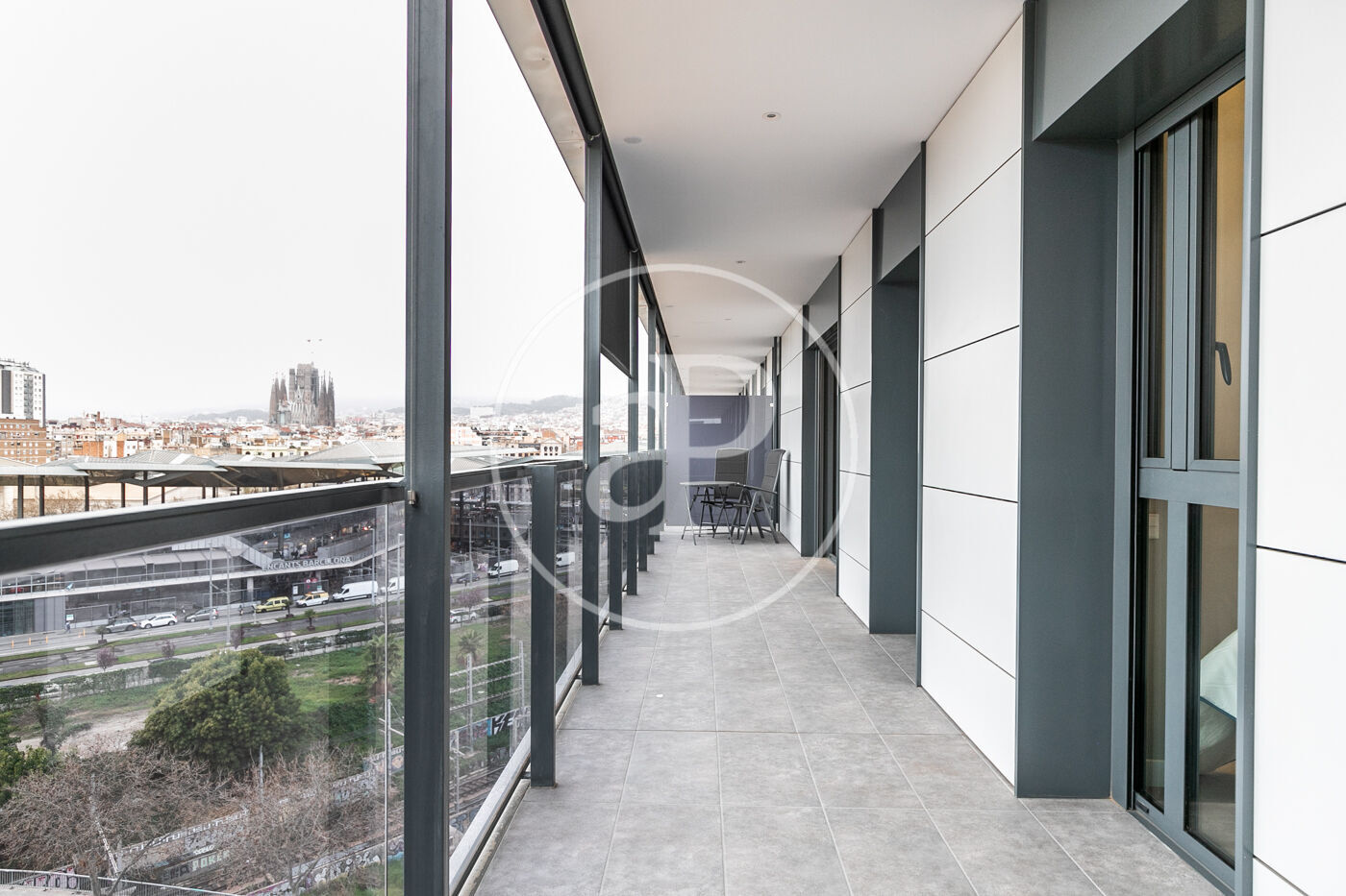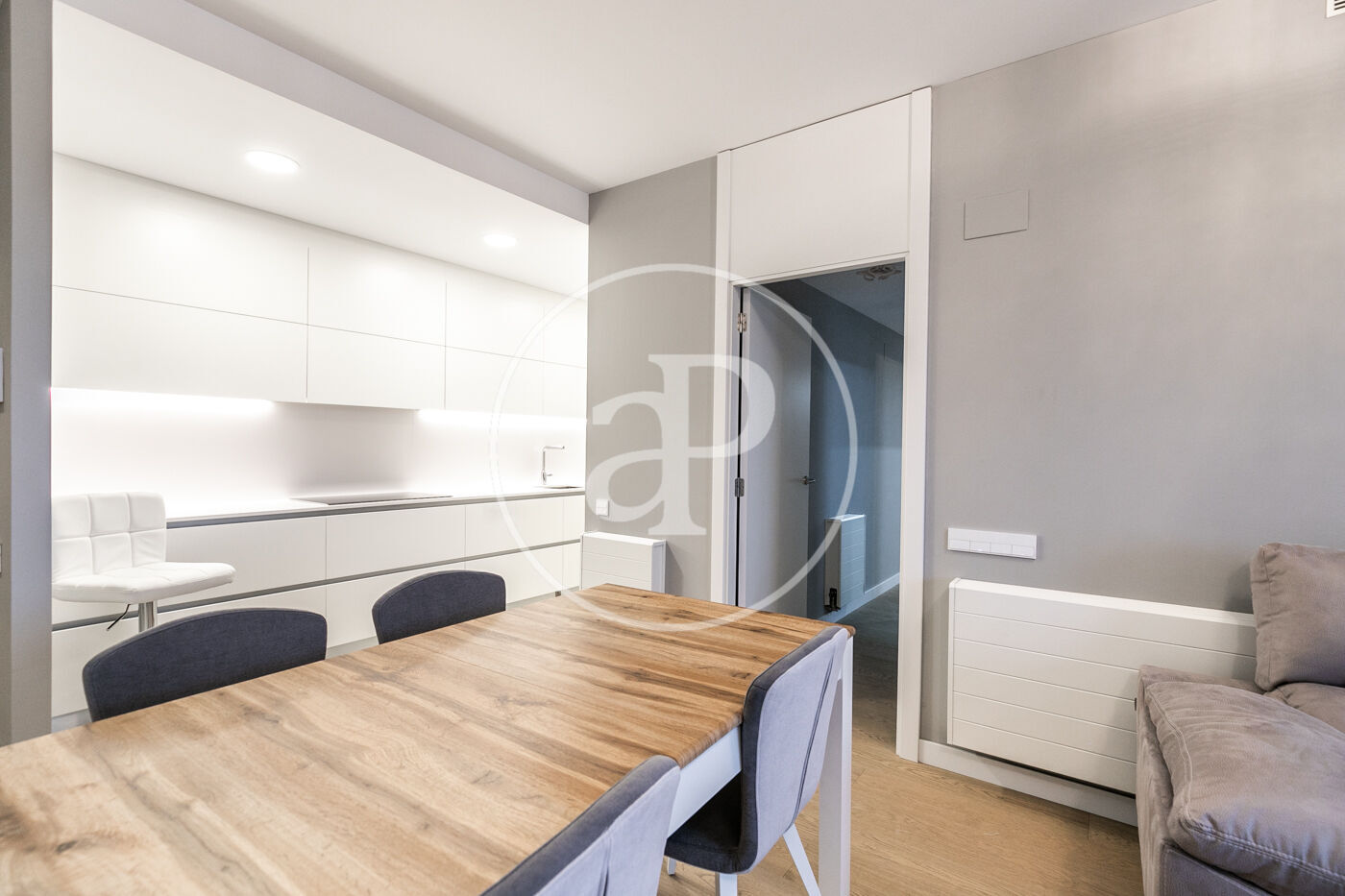 A la zona de dia trobem un ampli saló-menjador amb accés a una terrassa orientada a l’oest, la qual gaudeix de molta llum natural i vistes al Tibidabo, la Sagrada Família i Montjuïc. Des de la terrassa es pot veure la posta de sol. La cuina està totalment equipada amb rentadora-assecadora i tots els electrodomèstics.