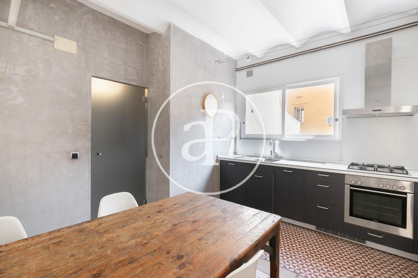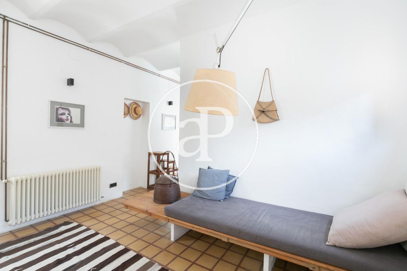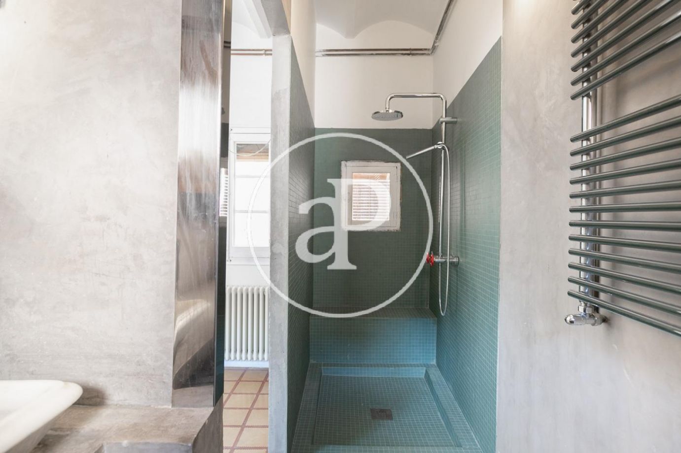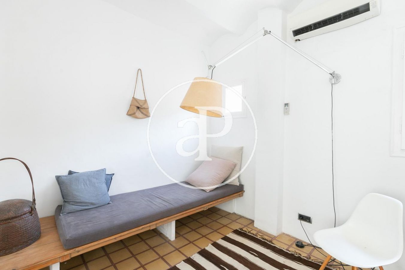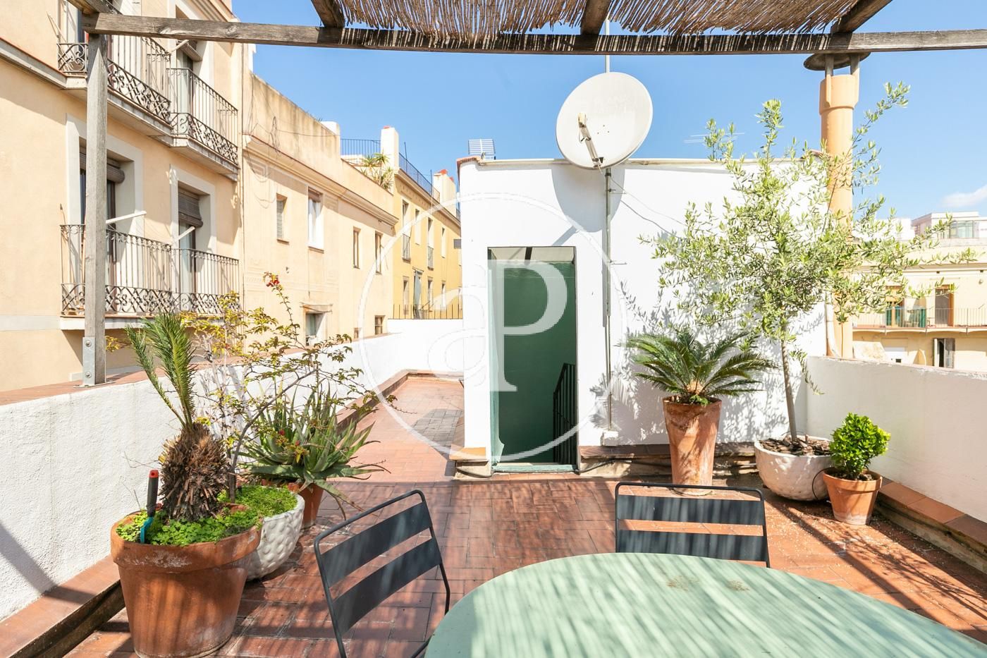 L'àtic està reformat i distribuït en dos nivells: el primer nivell són 59m2, amb un ampli saló, un dormitori doble, cuina – menjador i un bany complet amb dutxa. L'àtic és molt lluminós per tenir finestres cap a dues diferents orientacions, que permet l'entrada de llum natural durant tot el dia. El sòl conserva els seus baldosines originals, que contrasten amb les seves parets grisa i blanc. El sostre conserva la volta catalana que està pintat en blanc. Hi ha radiadors en totes les habitacions i un split amb A/C situat en el saló. A la porta principal trobem una escala que ens condueix al segon nivell, on hi ha una terrassa d'ús privatiu de 59m2. És una terrassa molt tranquil·la, on no hi ha soroll de veïns, i conserva la seva privacitat, per estar envoltat d'edificis que són hotels, els qui mantenen normatives estrictes per als seus hostes que no permeten fer festes o soroll de cap mena.