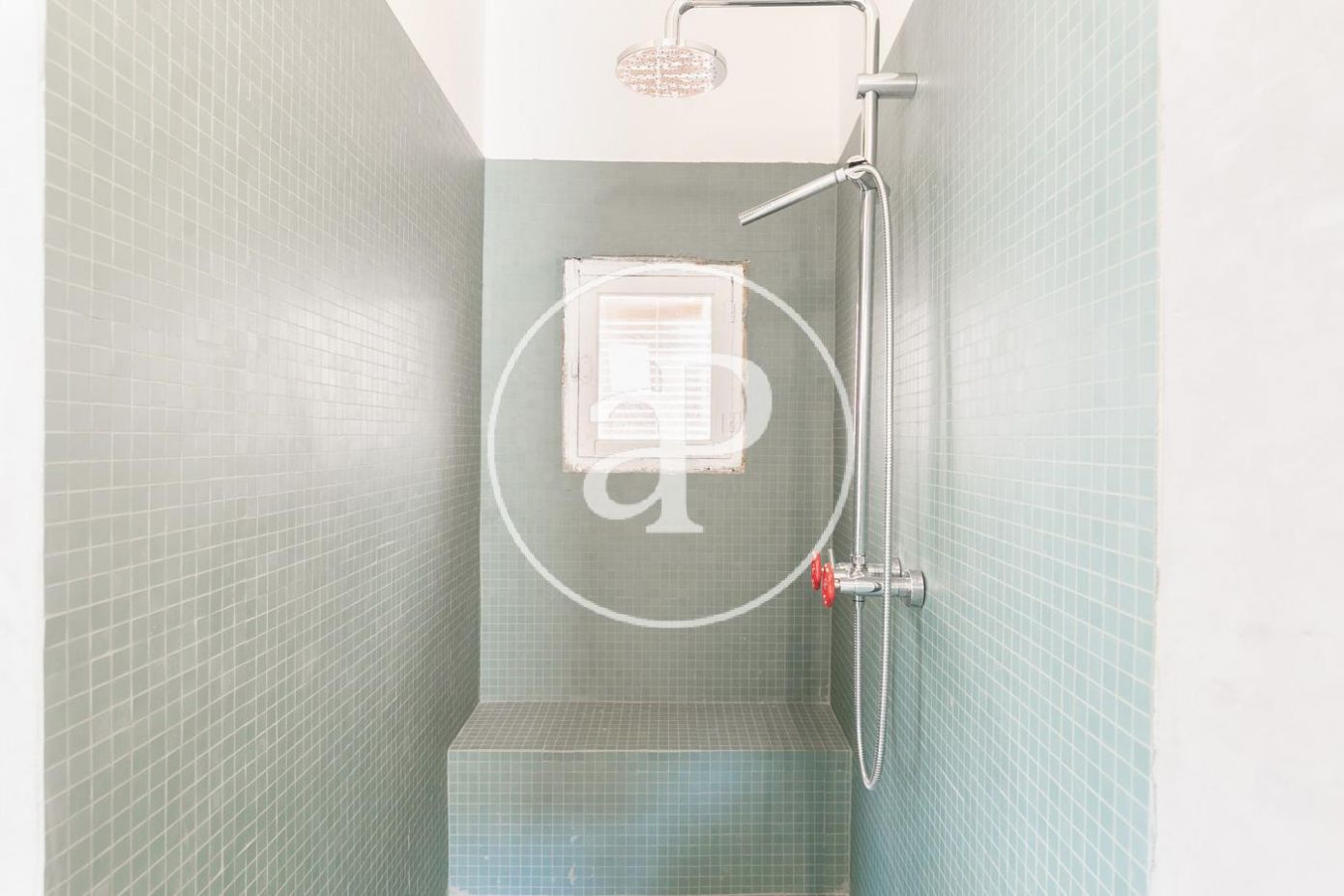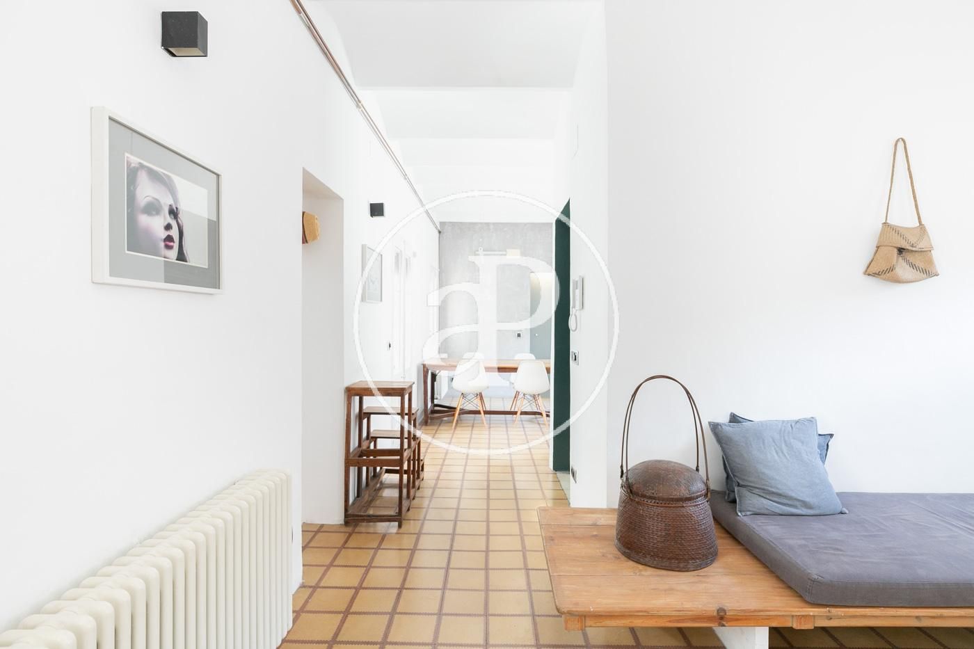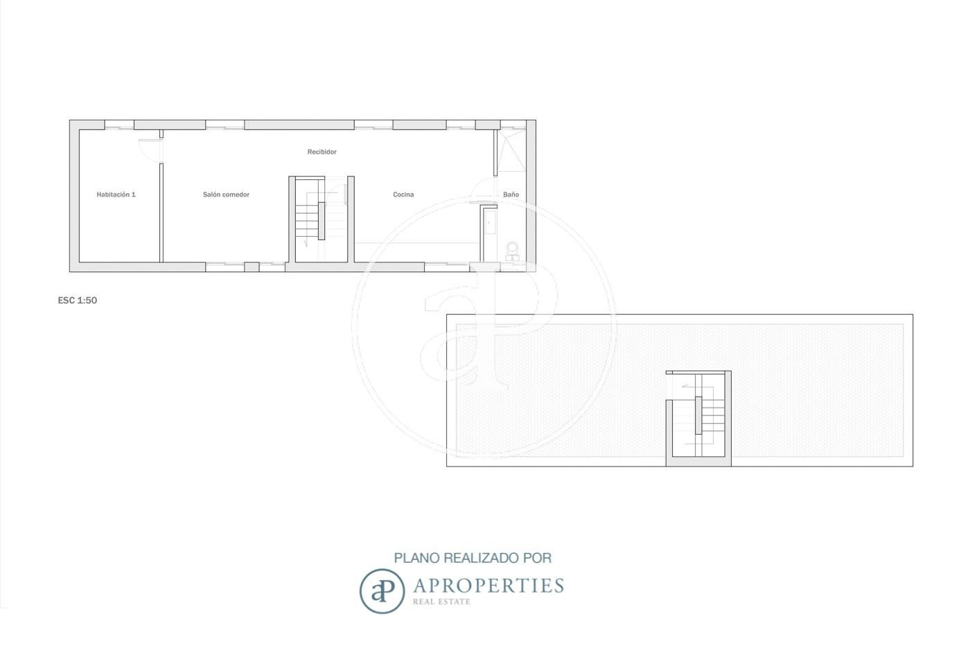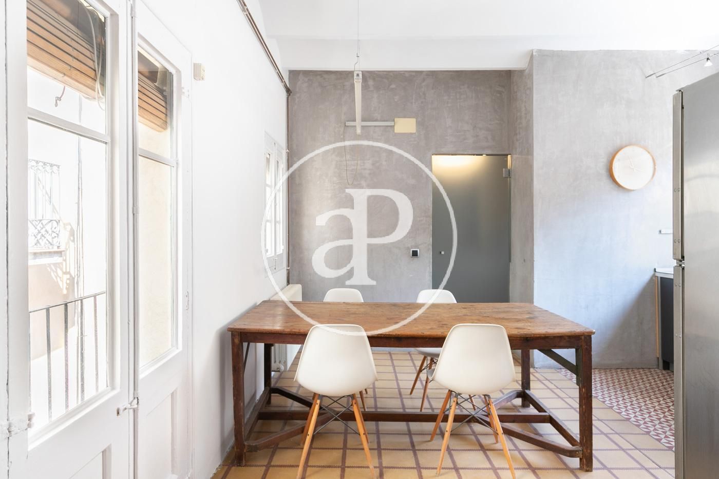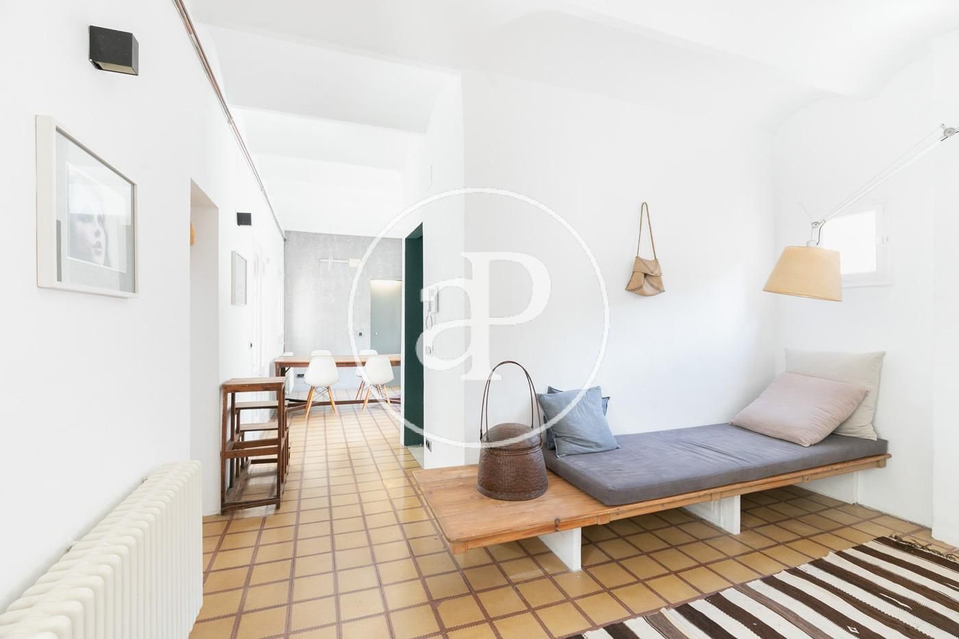 L'àtic està reformat i distribuït en dos nivells: el primer nivell són 59m2, amb un ampli saló, un dormitori doble, cuina – menjador i un bany complet amb dutxa. L'àtic és molt lluminós per tenir finestres cap a dues diferents orientacions, que permet l'entrada de llum natural durant tot el dia. El sòl conserva els seus baldosines originals, que contrasten amb les seves parets grisa i blanc. El sostre conserva la volta catalana que està pintat en blanc. Hi ha radiadors en totes les habitacions i un split amb A/C situat en el saló. A la porta principal trobem una escala que ens condueix al segon nivell, on hi ha una terrassa d'ús privatiu de 59m2. És una terrassa molt tranquil·la, on no hi ha soroll de veïns, i conserva la seva privacitat, per estar envoltat d'edificis que són hotels, els qui mantenen normatives estrictes per als seus hostes que no permeten fer festes o soroll de cap mena.