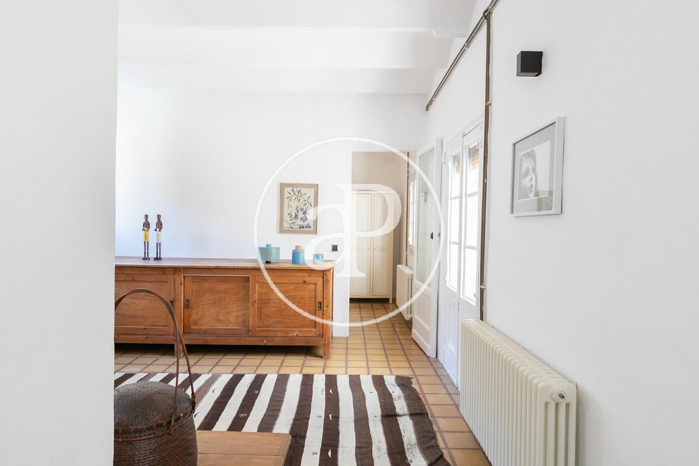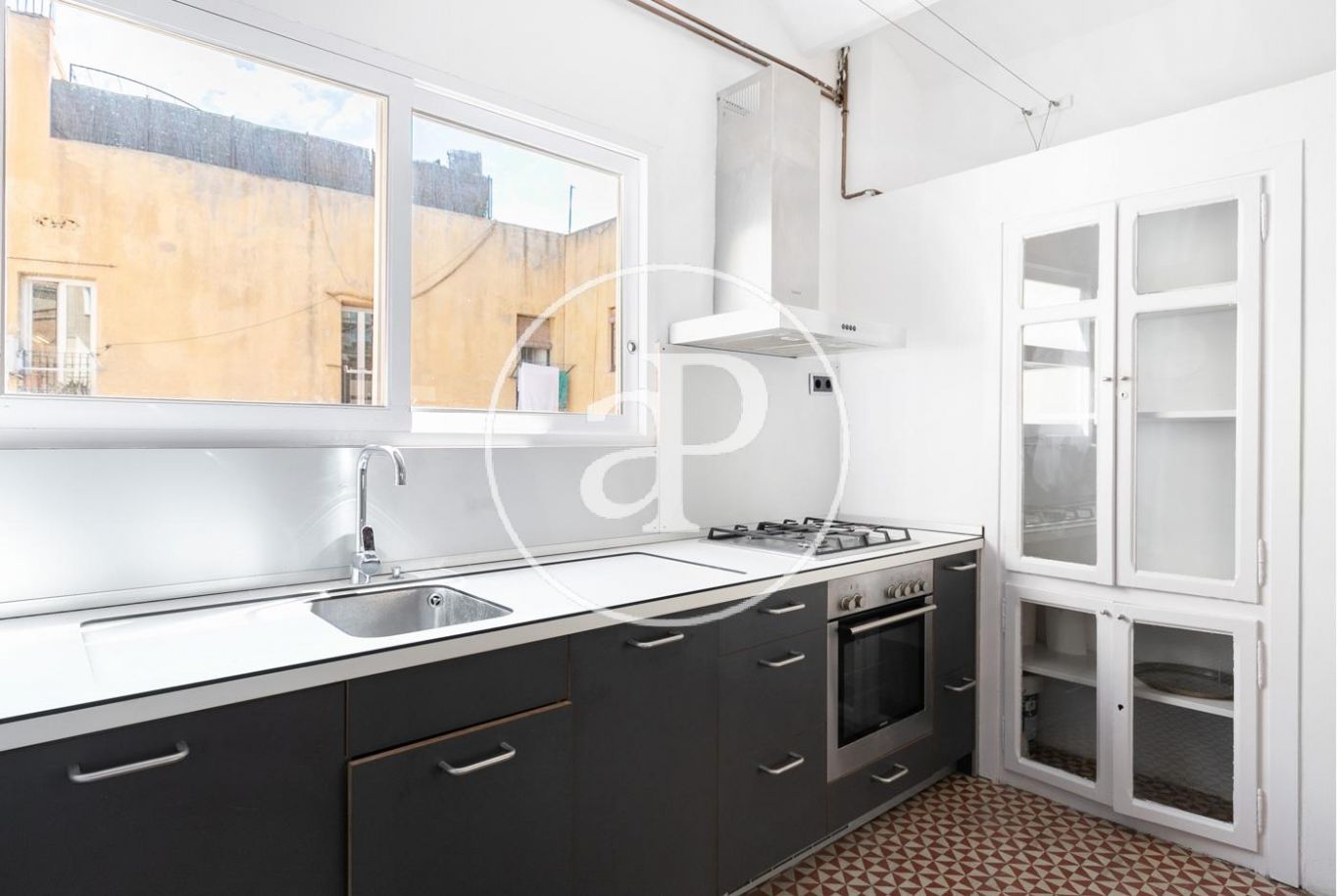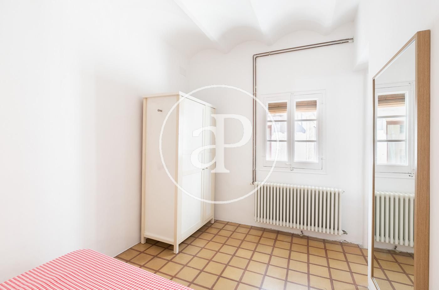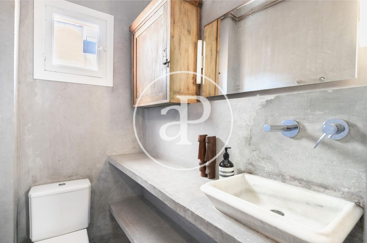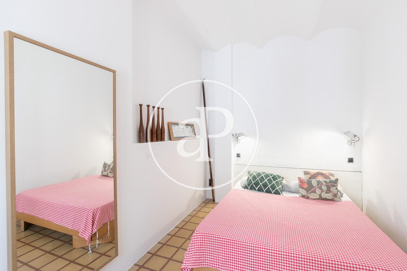 L'àtic està reformat i distribuït en dos nivells: el primer nivell són 59m2, amb un ampli saló, un dormitori doble, cuina – menjador i un bany complet amb dutxa. L'àtic és molt lluminós per tenir finestres cap a dues diferents orientacions, que permet l'entrada de llum natural durant tot el dia. El sòl conserva els seus baldosines originals, que contrasten amb les seves parets grisa i blanc. El sostre conserva la volta catalana que està pintat en blanc. Hi ha radiadors en totes les habitacions i un split amb A/C situat en el saló. A la porta principal trobem una escala que ens condueix al segon nivell, on hi ha una terrassa d'ús privatiu de 59m2. És una terrassa molt tranquil·la, on no hi ha soroll de veïns, i conserva la seva privacitat, per estar envoltat d'edificis que són hotels, els qui mantenen normatives estrictes per als seus hostes que no permeten fer festes o soroll de cap mena.