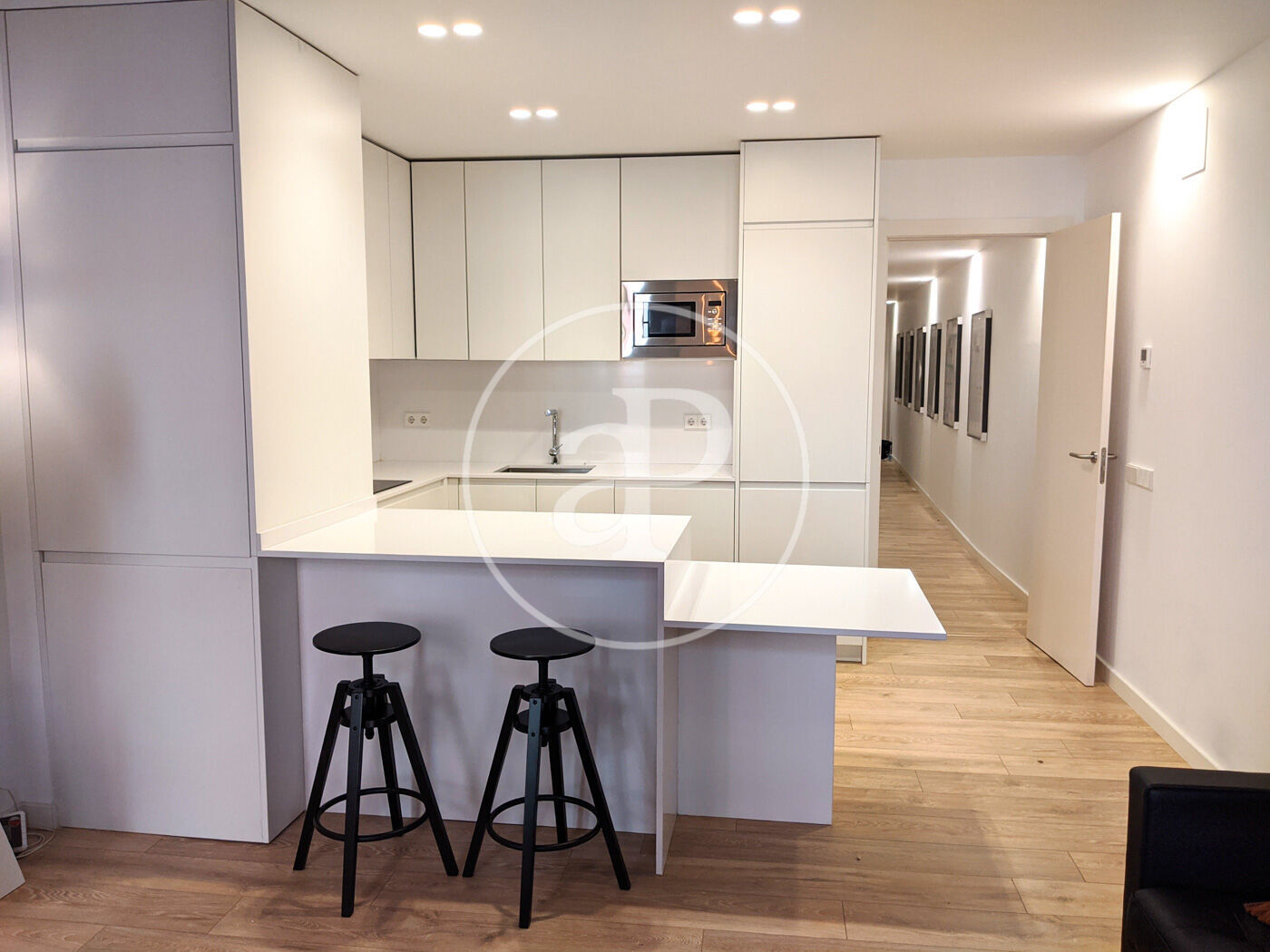 Saló-menjador diàfan amb cuina oberta totalment equipada (placa d’inducció, rentavaixelles, forn, microones, frigorífic/congelador integrat, rentadora i assecadora)