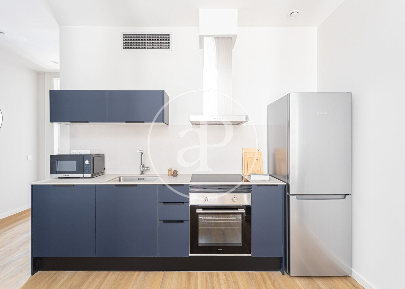 Aquest modern i acollidor pis de 83 m² al barri Gòtic de Barcelona destaca per la seva elegant paleta de colors i la seva excel·lent ubicació. En entrar-hi, et rep un saló menjador lluminós amb un sofà còmode i una zona de menjador al costat d’un finestral amb marcs de fusta. La cuina americana, totalment equipada amb electrodomèstics d’alta gamma, s’integra perfectament a l’espai.