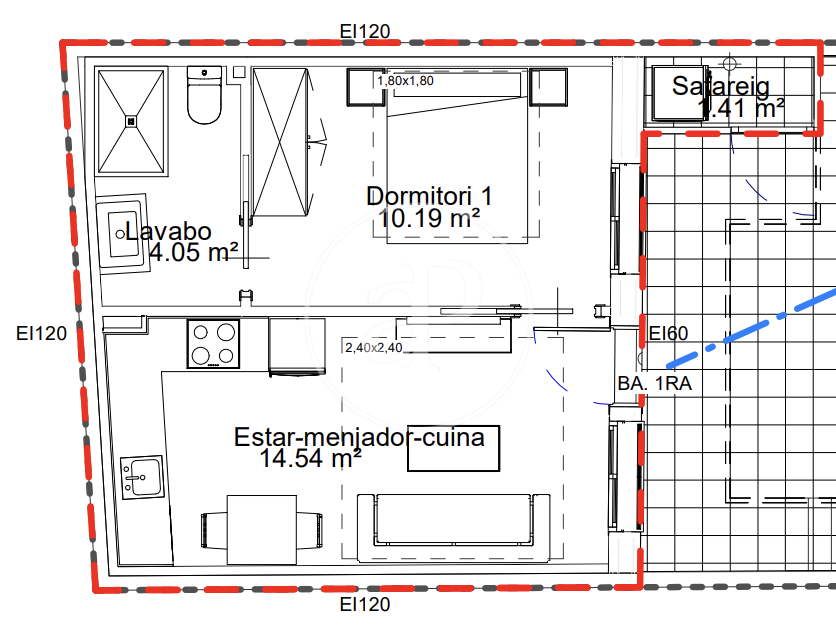 La superficie de 36 m2 se distribuye en un amplia y cómoda sala de estar con cocina abierta y un amplio dormitorio en suite con un amplio baño. La zona de aguas se encuentra en la zona exterior, que a su vez puede utilizarse de trastero.
