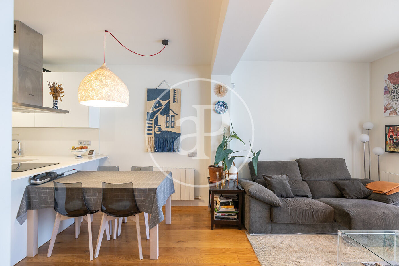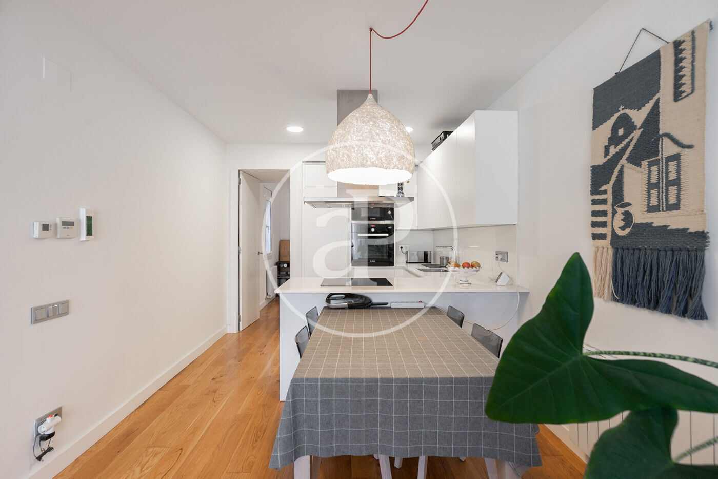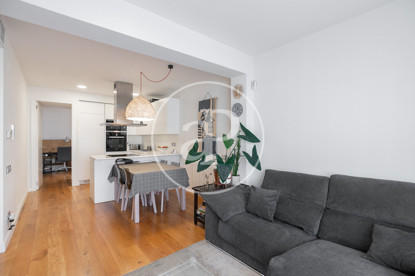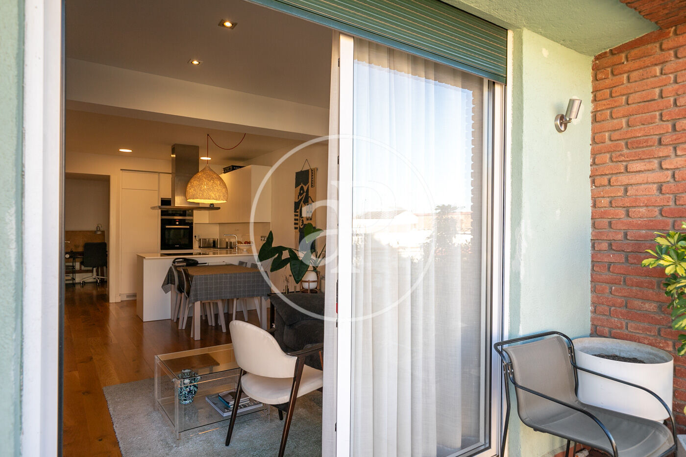 L’habitatge consta d’un lluminós saló-menjador amb sortida a un espaiós balcó amb vistes a Montjuïc, amb cuina oberta equipada amb tots els electrodomèstics.