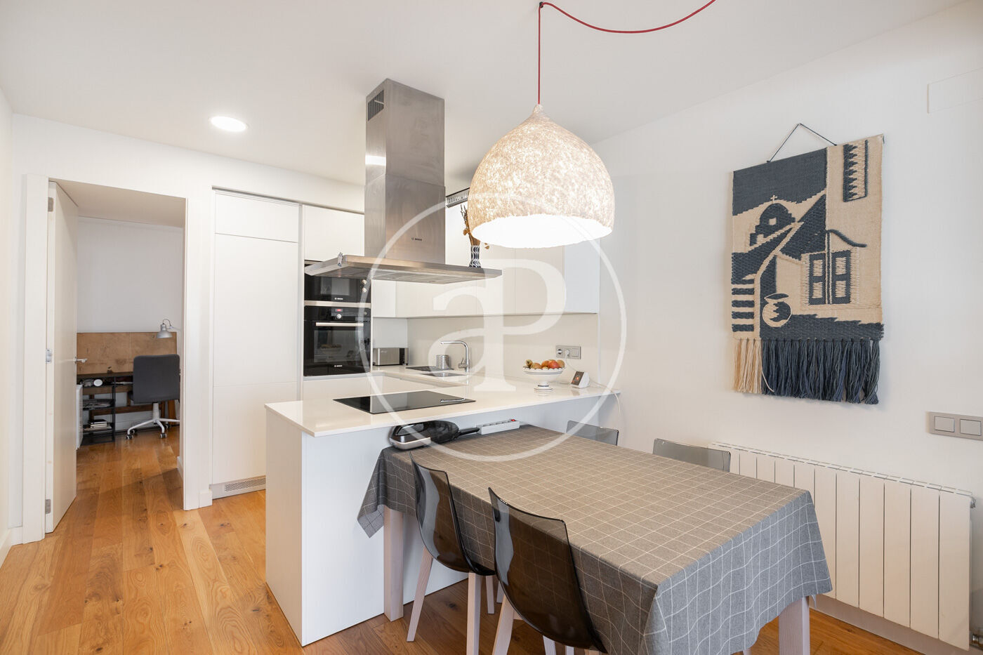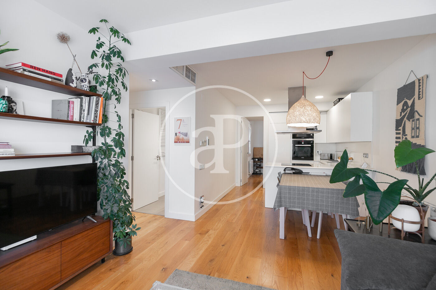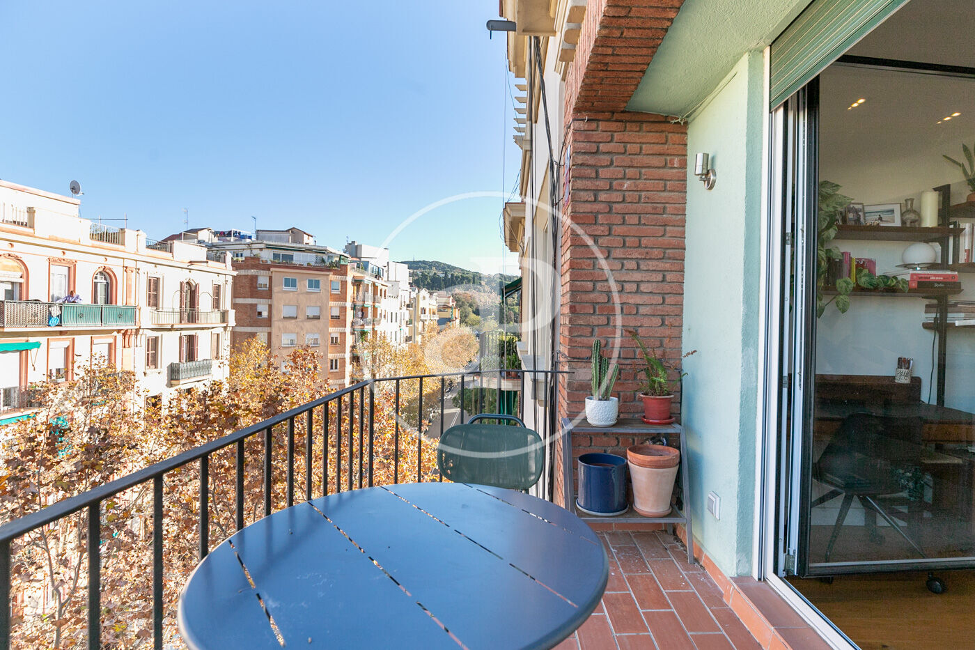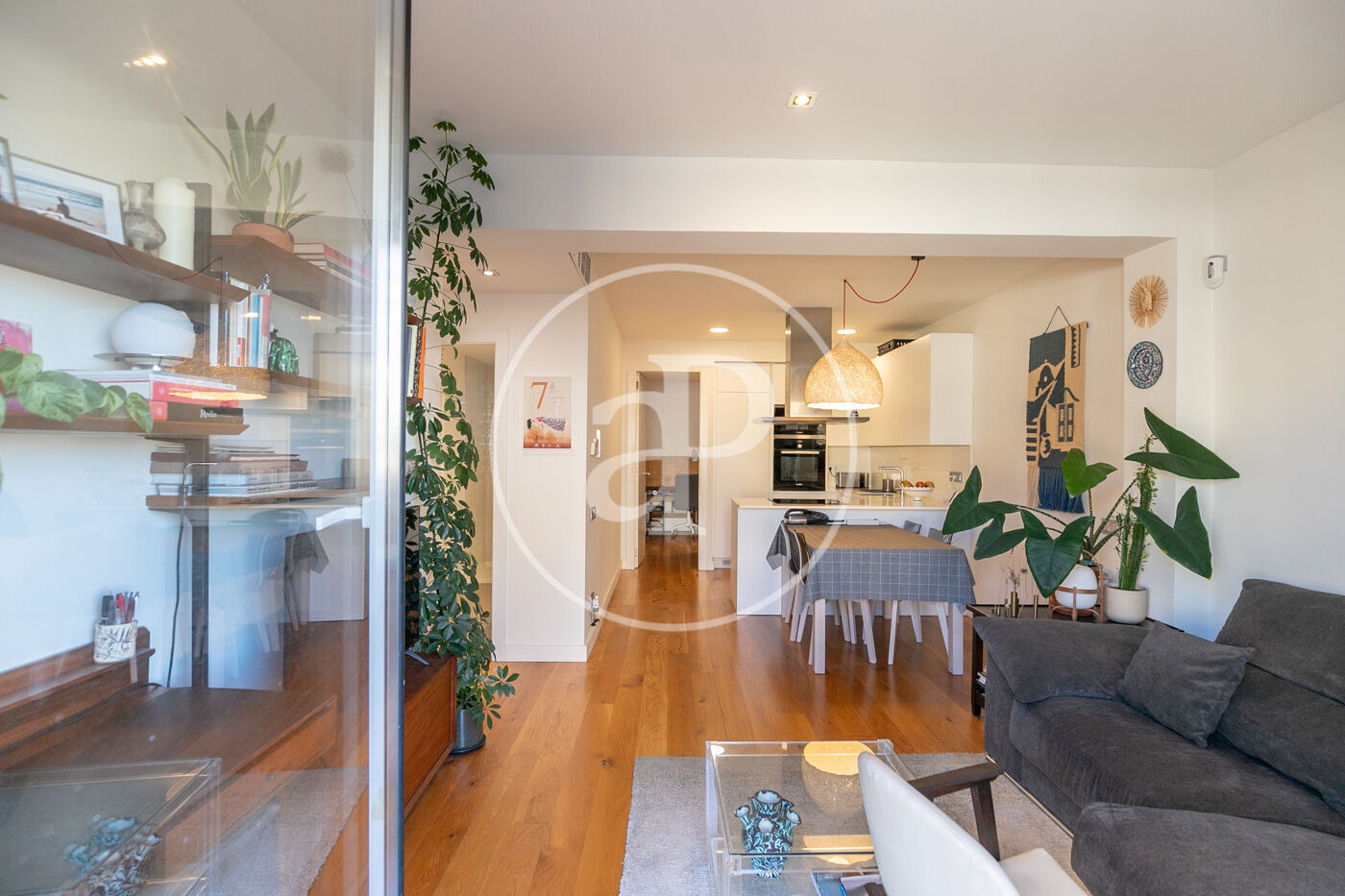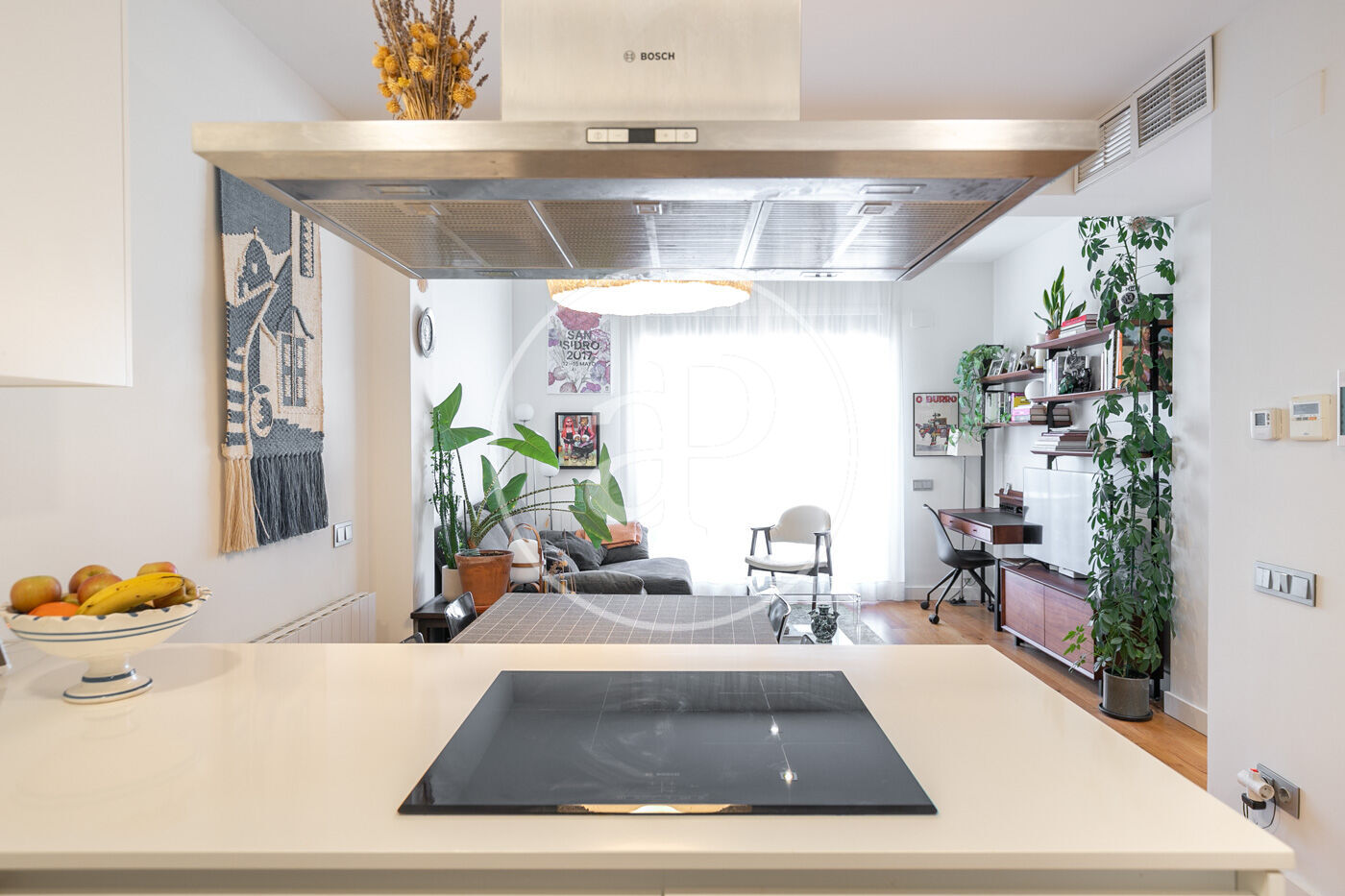 L’habitatge consta d’un lluminós saló-menjador amb sortida a un espaiós balcó amb vistes a Montjuïc, amb cuina oberta equipada amb tots els electrodomèstics.