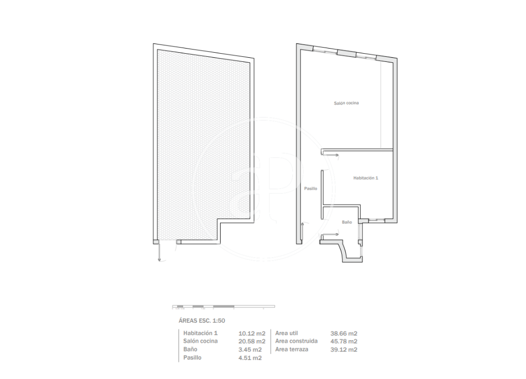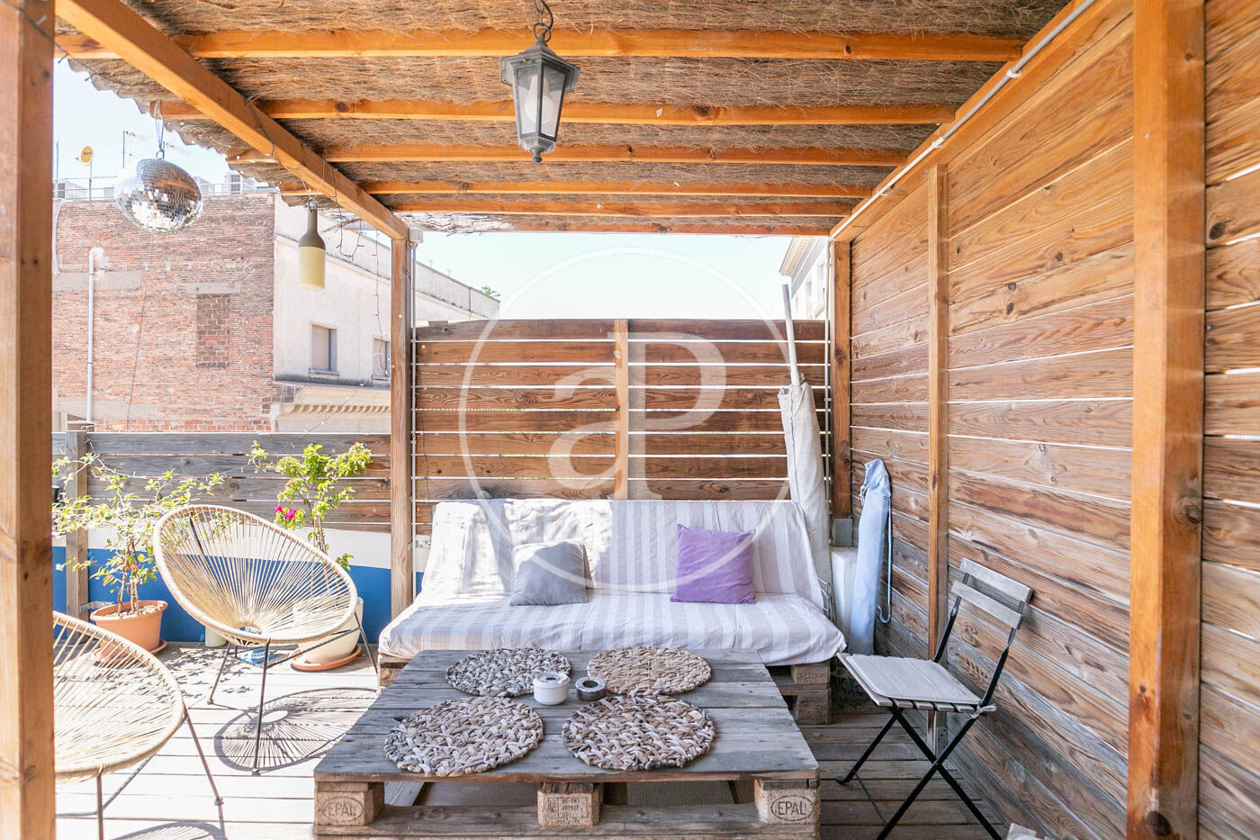 La distribució, pràctica i funcional, compta amb un rebedor-passadís a través del qual accedim a la sala d’estar amb cuina integrada i sortida a un balcó on gaudir d’un cafè al sol amb vistes al Mercat de Sant Antoni, un acollidor dormitori doble i un bany complet. Totes les estances gaudeixen de magnífica llum natural i bones vistes. Pujant a la planta superior per les escales comunitàries descobrim la fantàstica terrassa d’ús privatiu, equipada amb dutxa exterior, tarima i pèrgola de fusta per gaudir de les vistes magnífiques.
