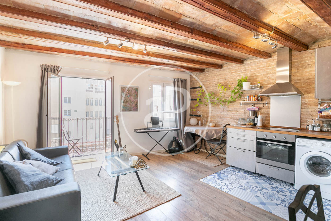 Amb una superfície construïda de 47 m² més 30 m² de terrassa, aquest pis ha estat recentment reformat amb molta cura, conservant elements originals que li donen personalitat, com les voltes catalanes amb bigues de fusta vistes i les parets de maó vist, en harmonia amb acabats moderns.