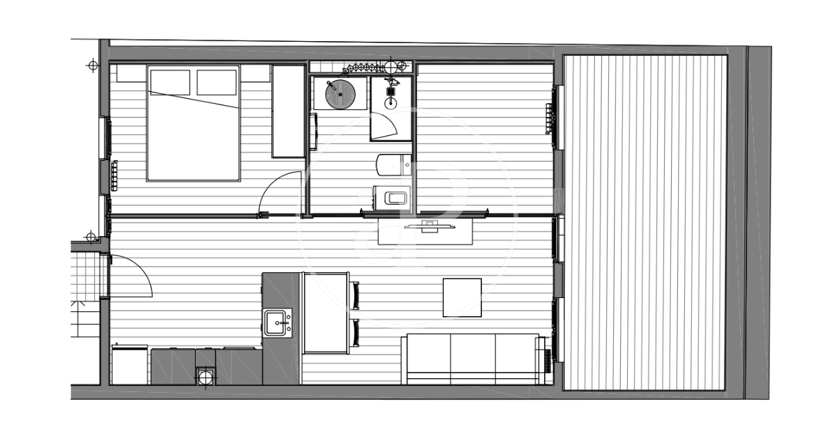 En entrar-hi, ens rep una gran sala d’estar amb cuina integrada, des de la qual accedim a l’àmplia terrassa amb tarima de fusta i boniques vistes a la ciutat. La zona de nit compta amb un bany complet i dues habitacions, una de doble i una altra d’individual.