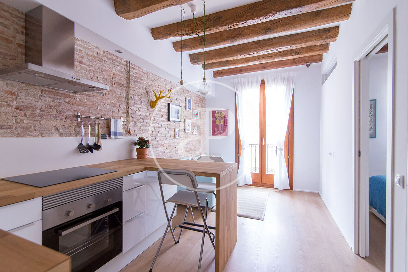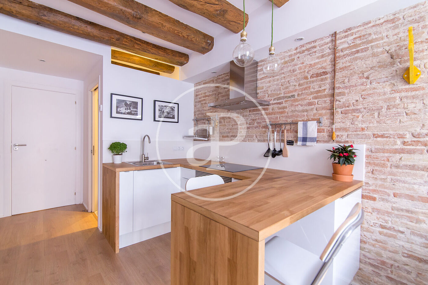 L’habitatge, ubicat al centre de Barcelona, es distribueix en una zona àmplia i lluminosa amb cuina oberta al saló, amb un balcó exterior, un dormitori doble amb armaris encastats i un bany complet amb dutxa.