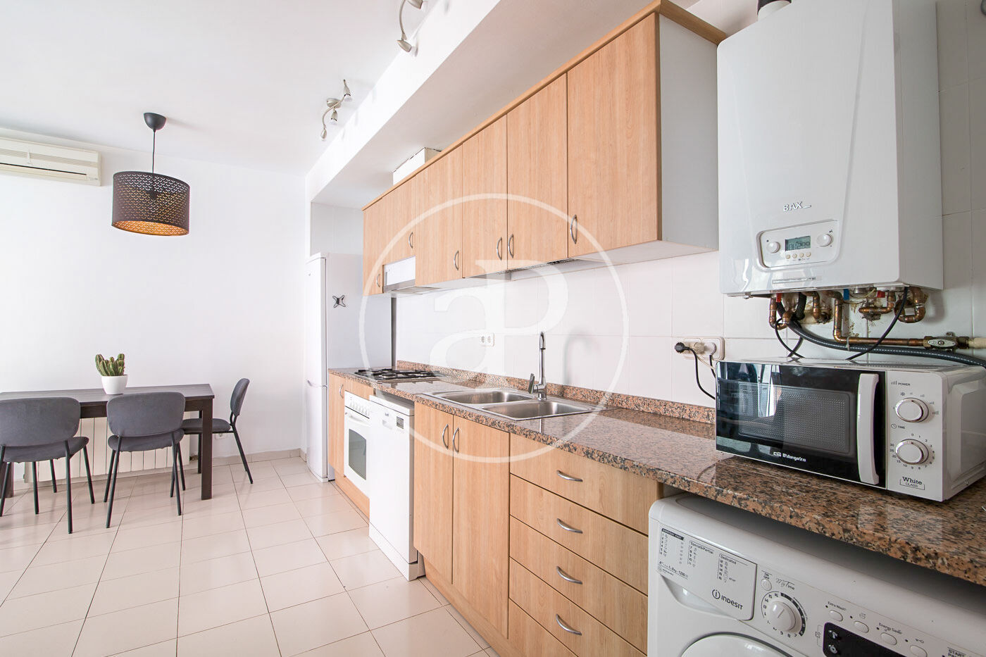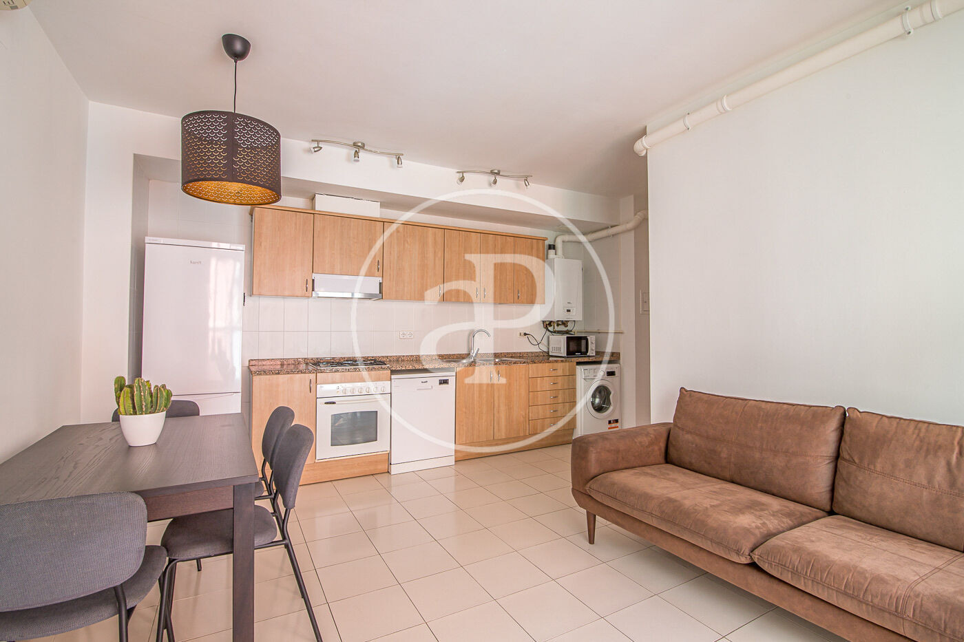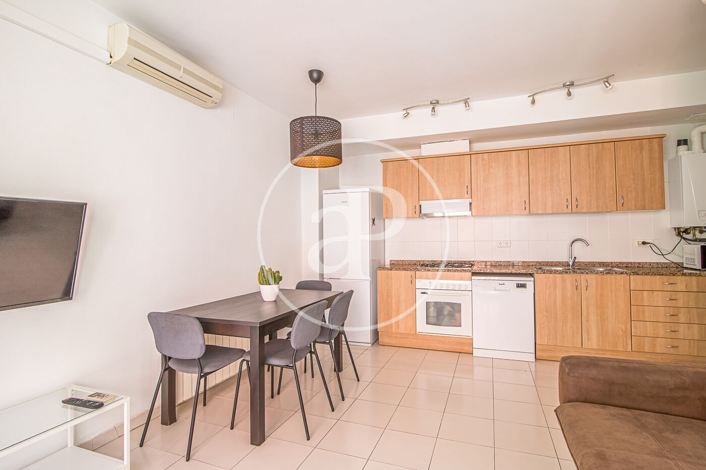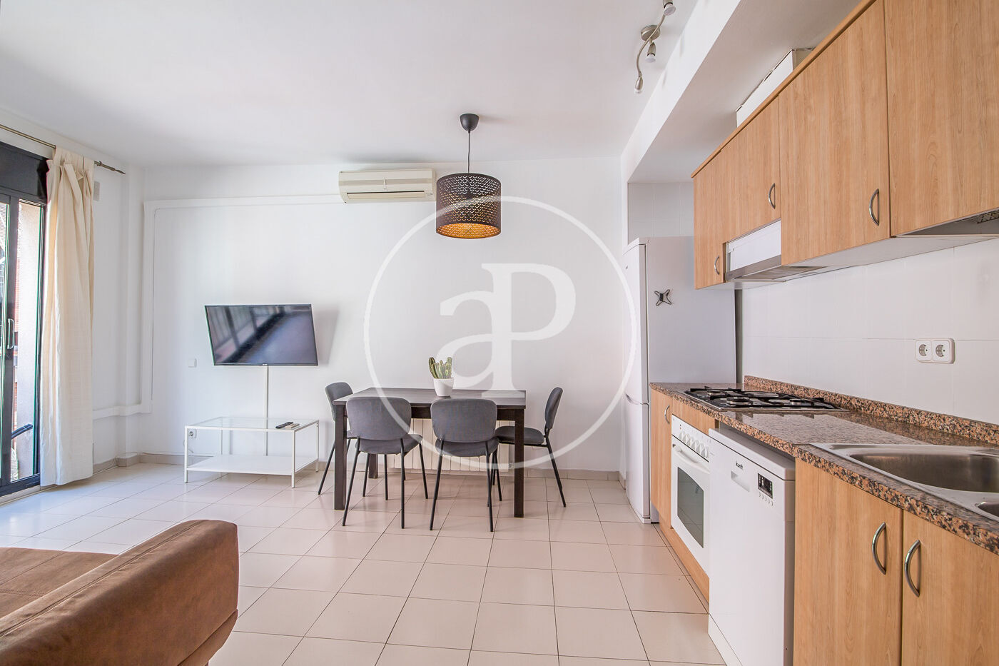 Aquest pis de 59 m² està molt ben distribuït. A la zona de dia, compta amb una cuina equipada amb electrodomèstics i integrada amb el saló menjador. Des d’aquí s’accedeix a un balcó, que a més disposa de porta d’ampit.