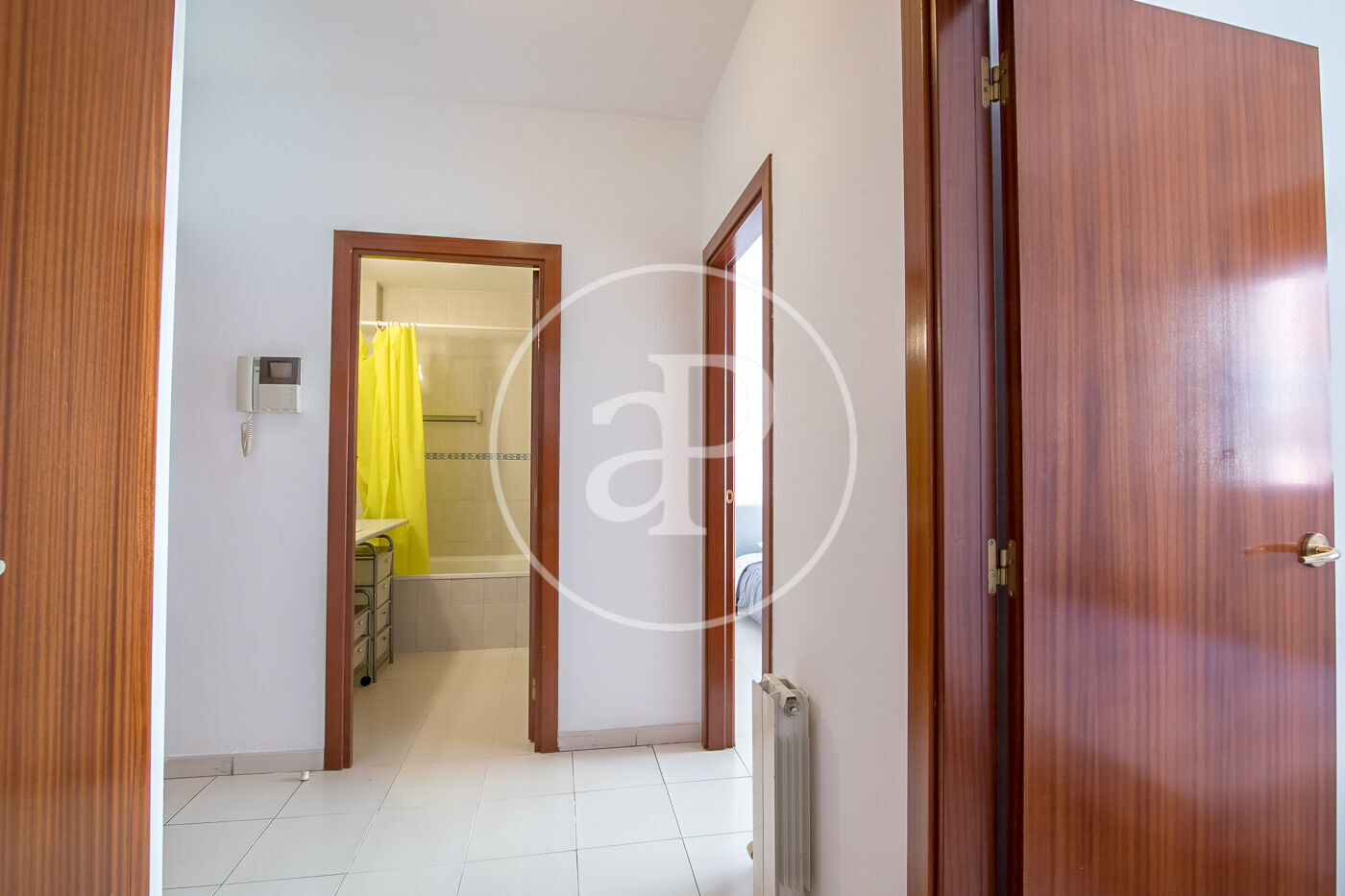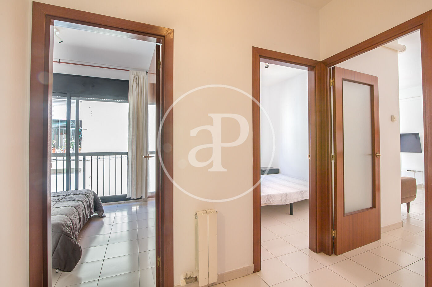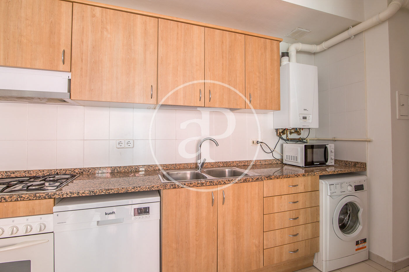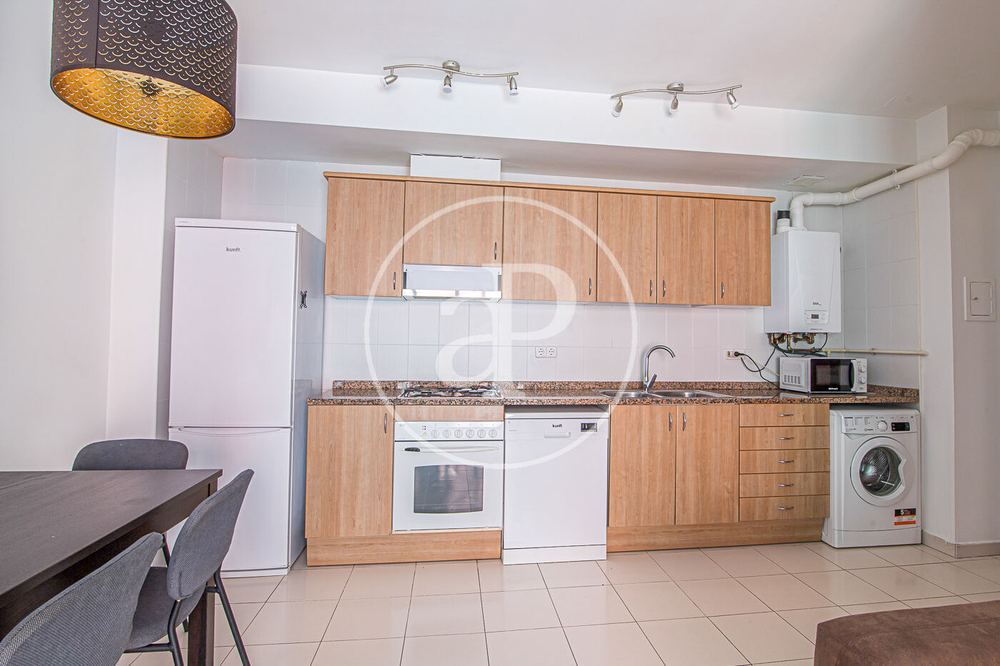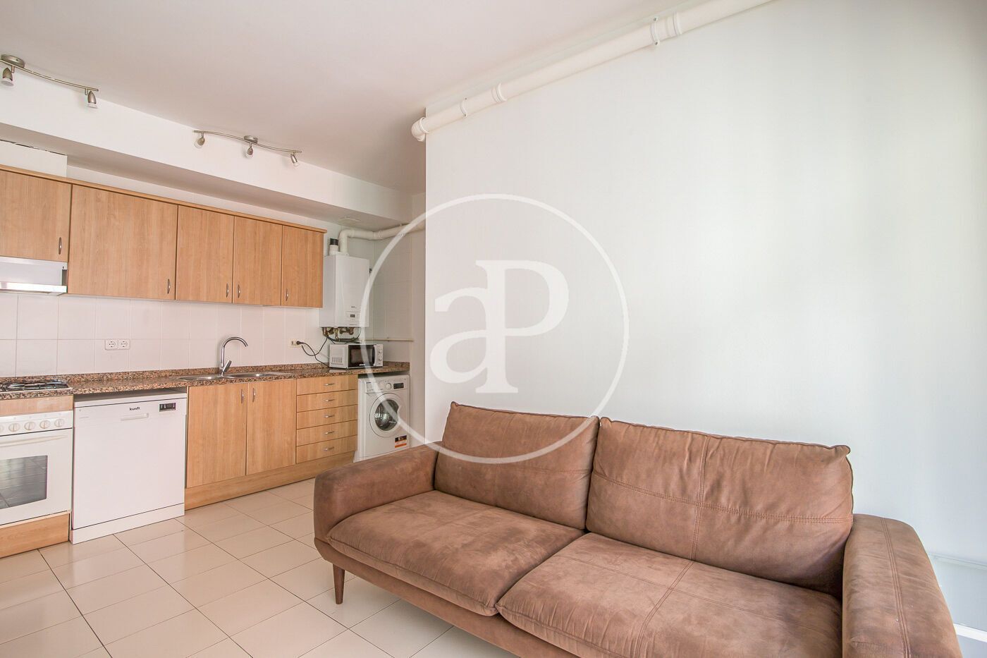 Aquest pis de 59 m² està molt ben distribuït. A la zona de dia, compta amb una cuina equipada amb electrodomèstics i integrada amb el saló menjador. Des d’aquí s’accedeix a un balcó, que a més disposa de porta d’ampit.