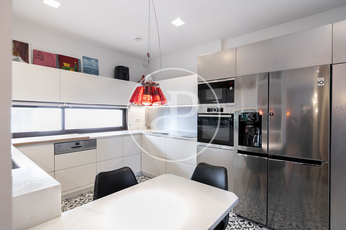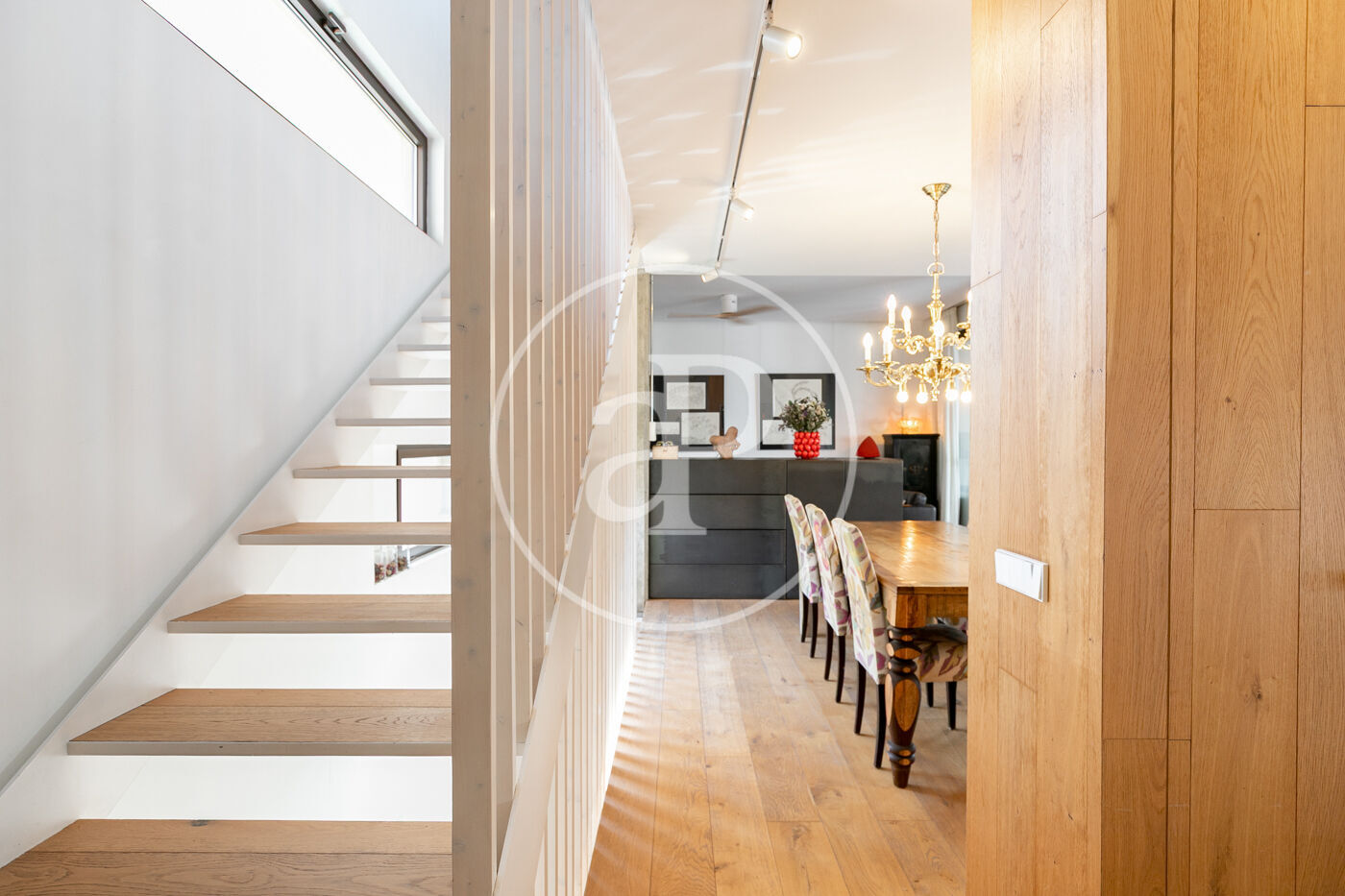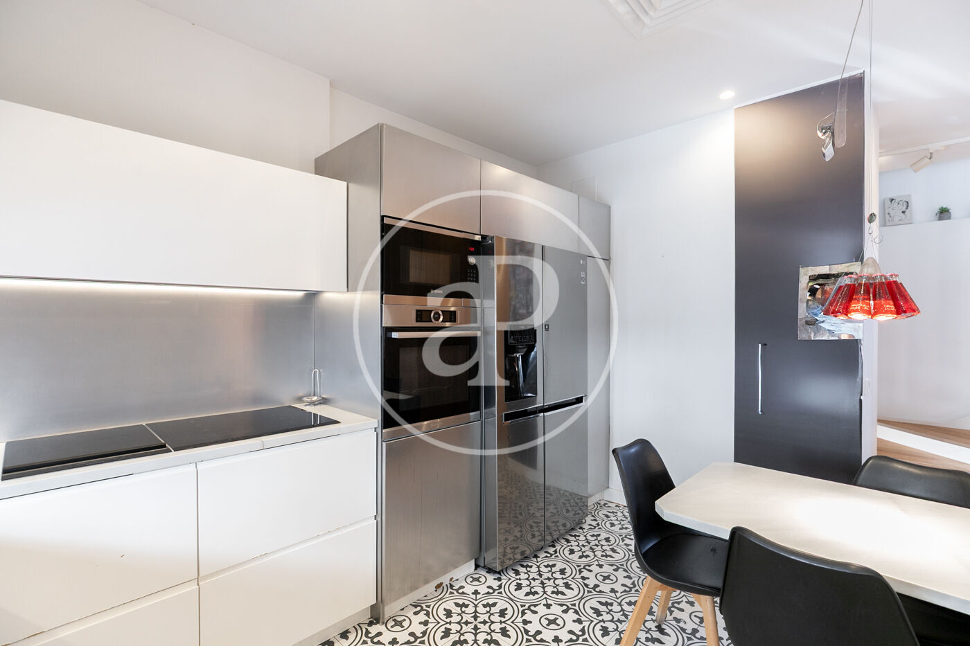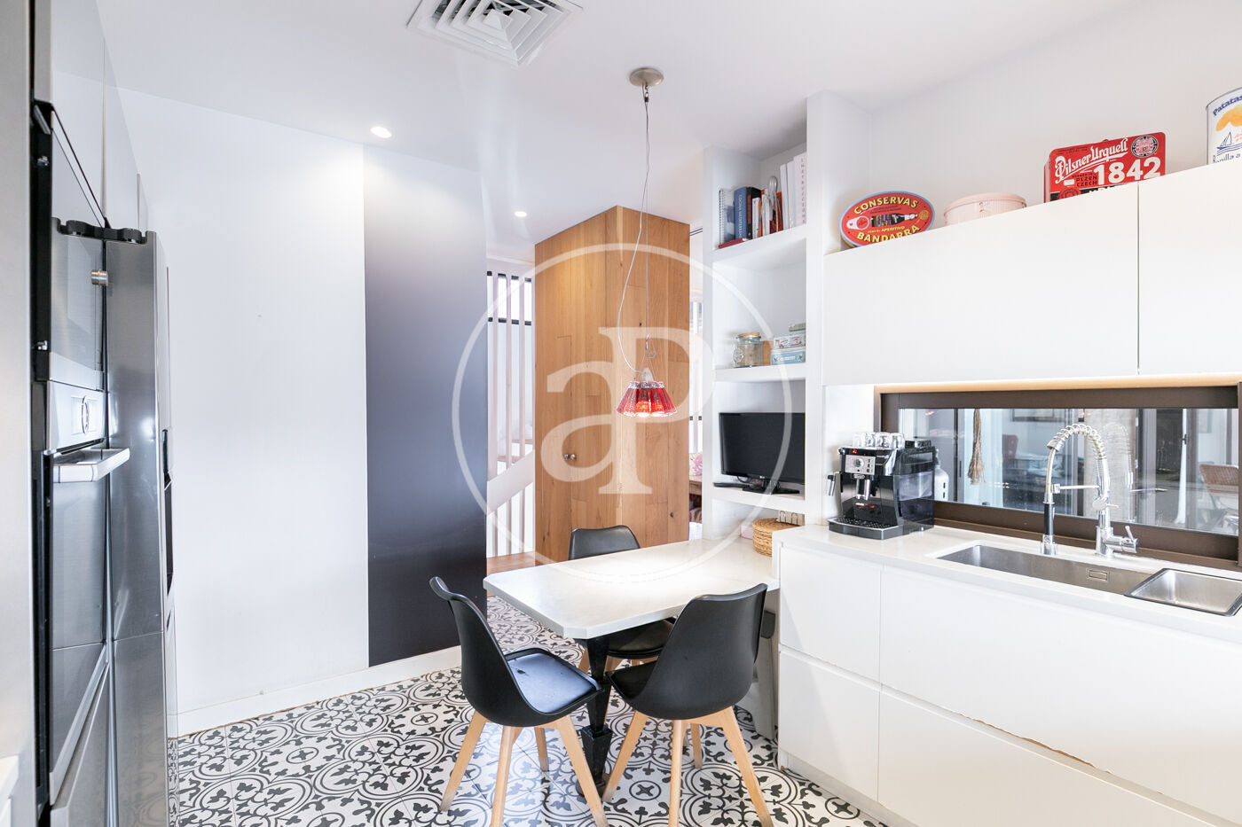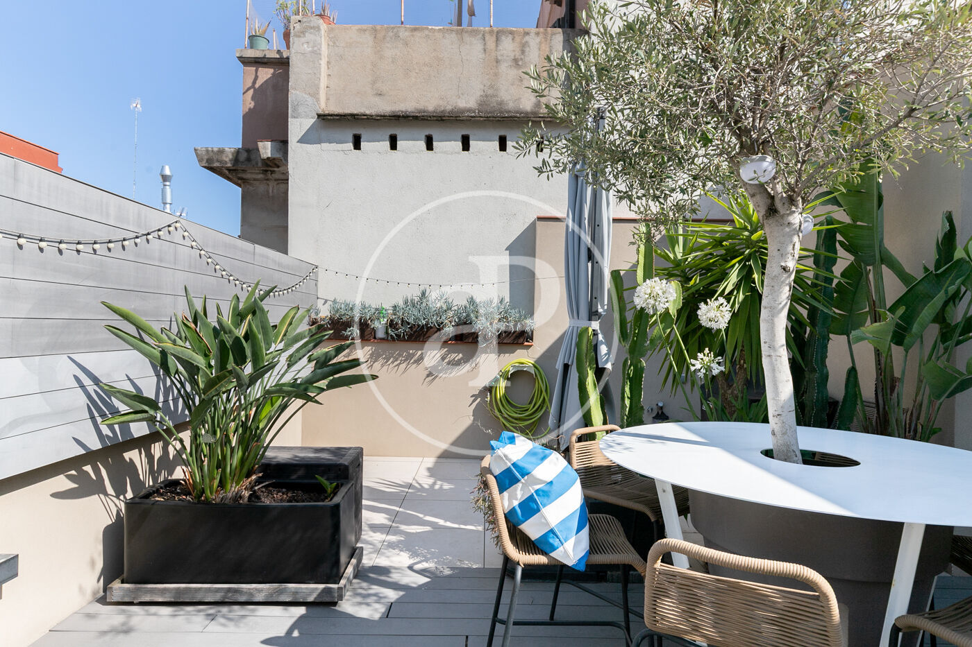La cuina, equipada amb electrodomèstics d’alta gamma (Siemens/Bosch) i nevera americana, està semioberta al saló, des d’on s’accedeix a una terrassa coberta de 23,50 m² envoltada de plantes, un veritable oasi urbà. En aquesta mateixa planta hi trobem el lavabo de cortesia.