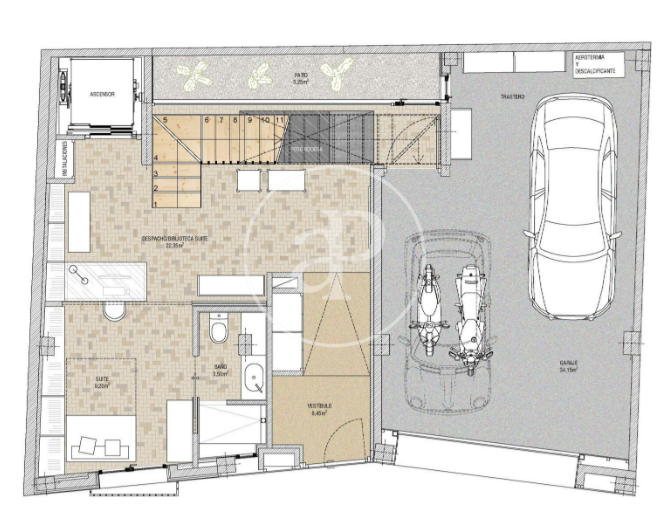 Disposa de garatge per a una plaça gran i una de petita o dues motos (porta automàtica), celler, traster, zona de biblioteca/despatx i 4 habitacions dobles, dues d'elles en suite (una amb vestidor) i bany complet. Un altre bany i un lavabo de cortesia donen servei a la resta d’habitacions. L’emmagatzematge és molt complet, amb armaris encastats a totes les habitacions.