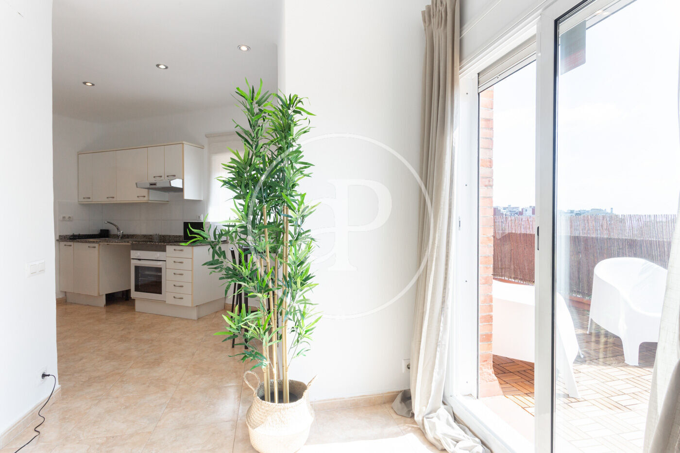 A la zona de dia trobem un saló-menjador il·luminat per un finestral amb accés a una àmplia terrassa amb molta llum i vistes a la ciutat. Cuina amb electrodomèstics.