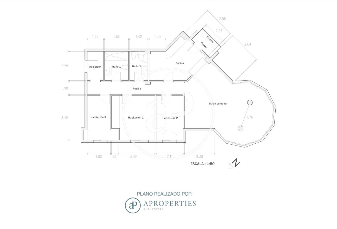 La seva distribució actual es compon d'un rebedor, un saló-menjador ampli i molt lluminós, una cuina equipada oberta amb sortida a la zona d'aigües i balcó, una habitació de matrimoni exterior, un bany complet amb banyera, dues habitacions individuals exteriors, 1 bany complet amb plat de dutxa.